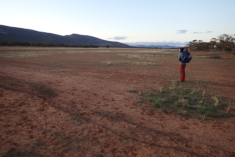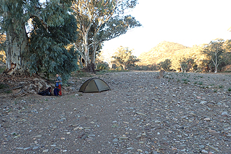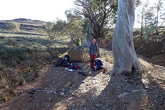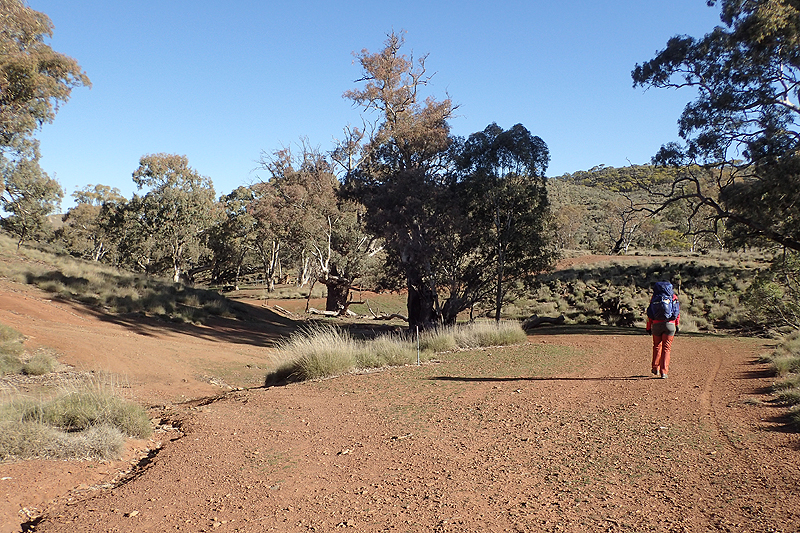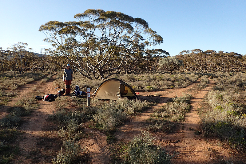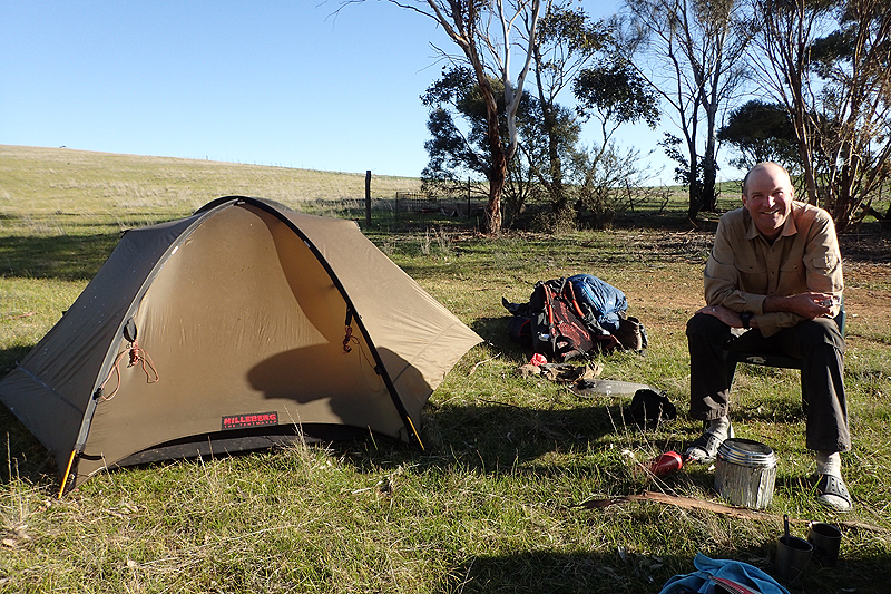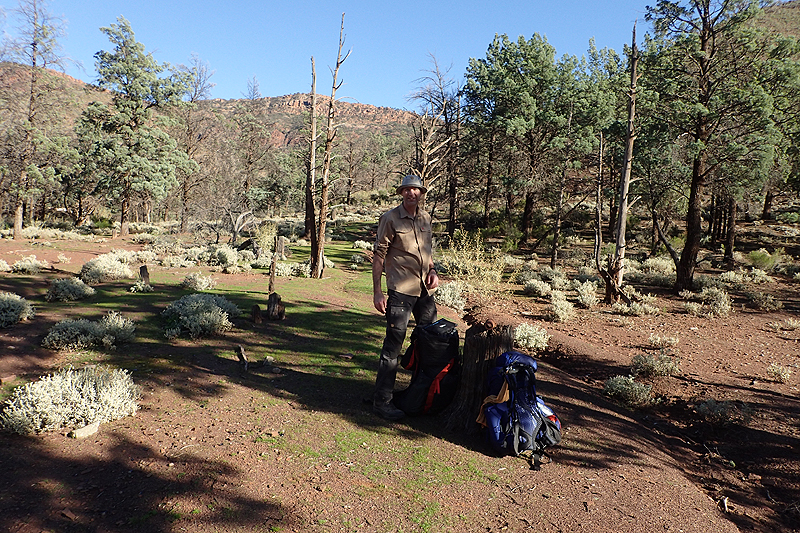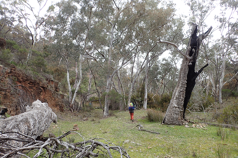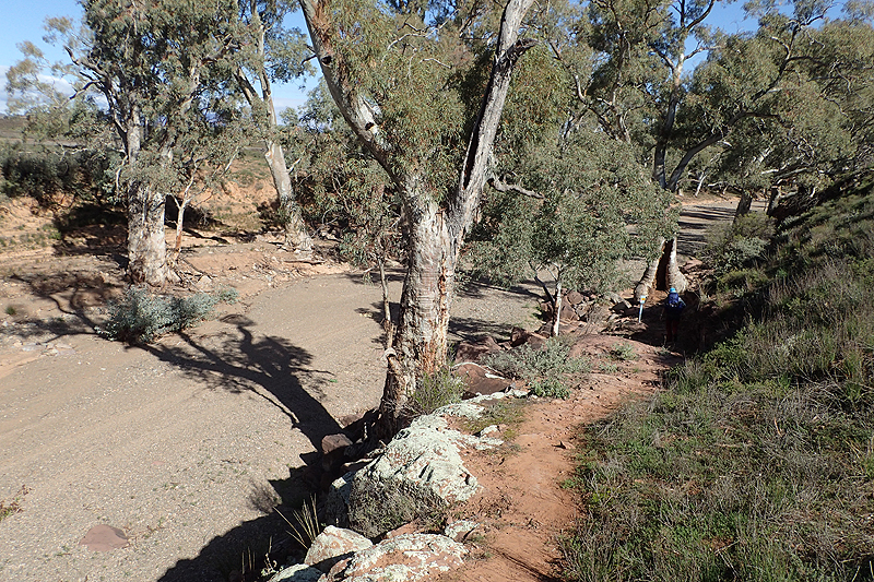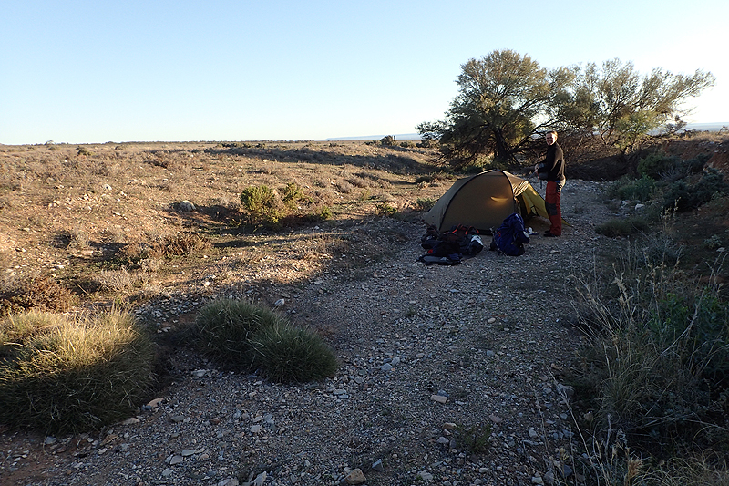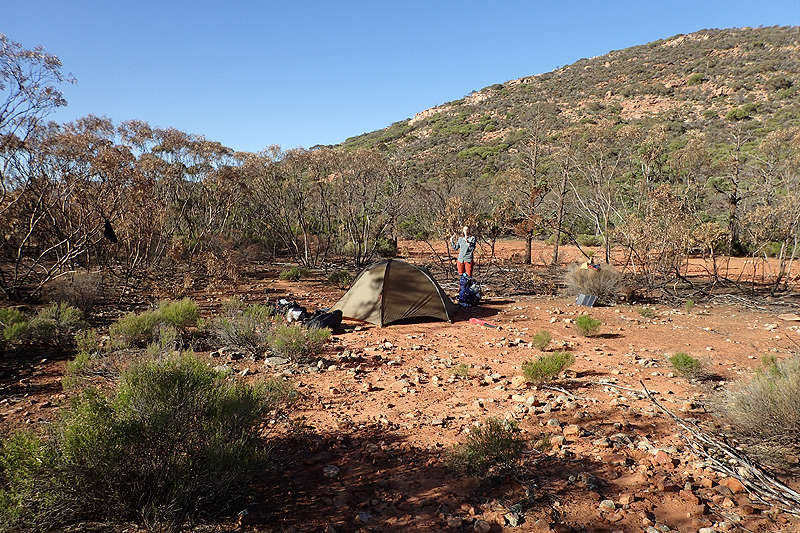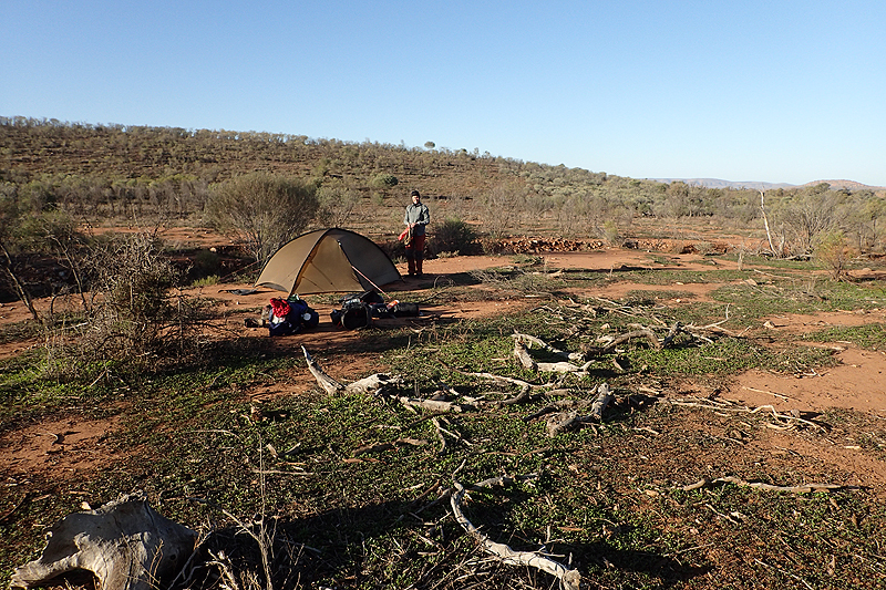 Breakfast never tasted this good! We climbed over our first stile and were on our way. The walking was very pleasant today, a lot of it in dry river beds, quite small and narrow. At some point we entered the domain of the desert fir tree which we love. We are drawn to fir trees anywhere in the world, especially as they have the cleanest floors beneath them for camping! We stopped at Pigeon Bore for lunch and to pick up water and then walked a few kilometres further until we found a nice place to camp.