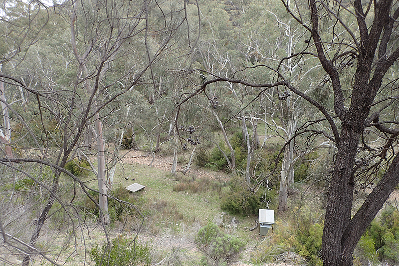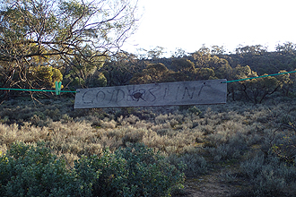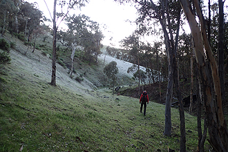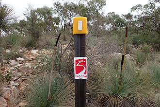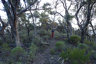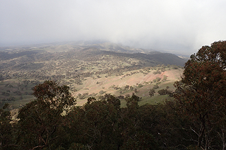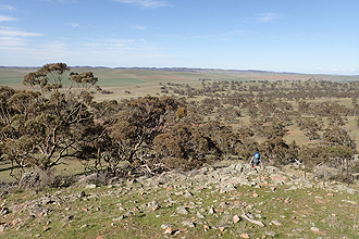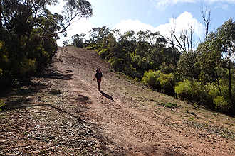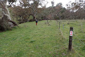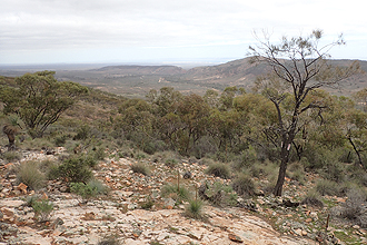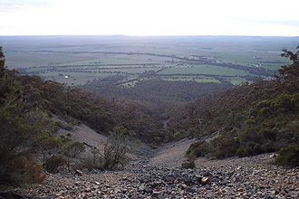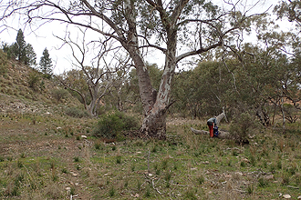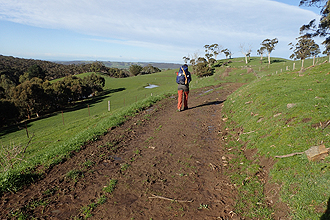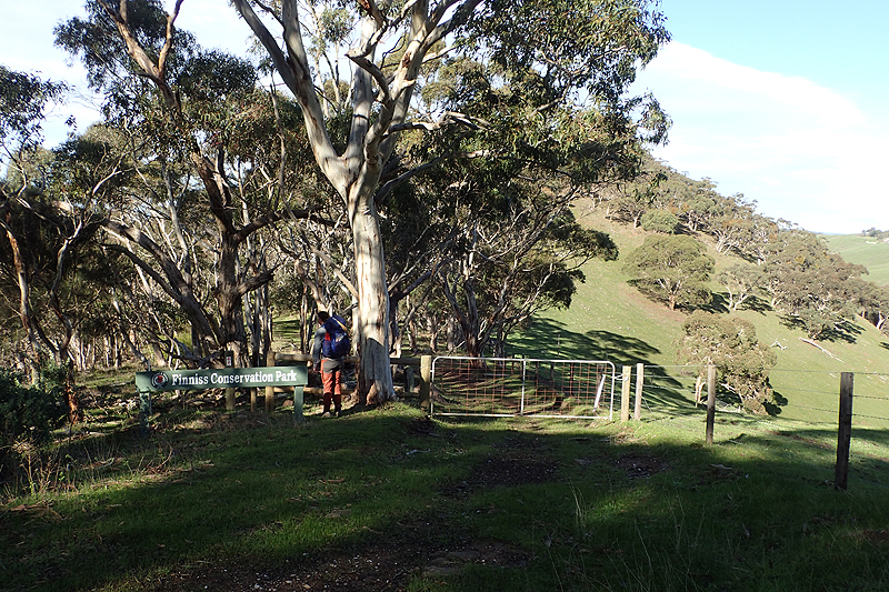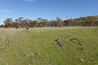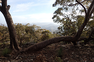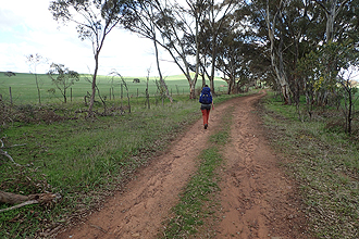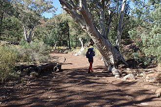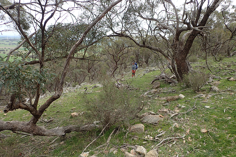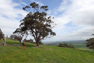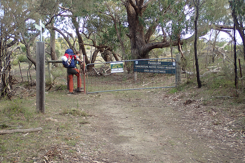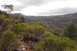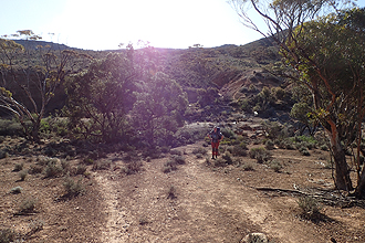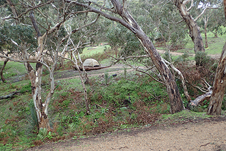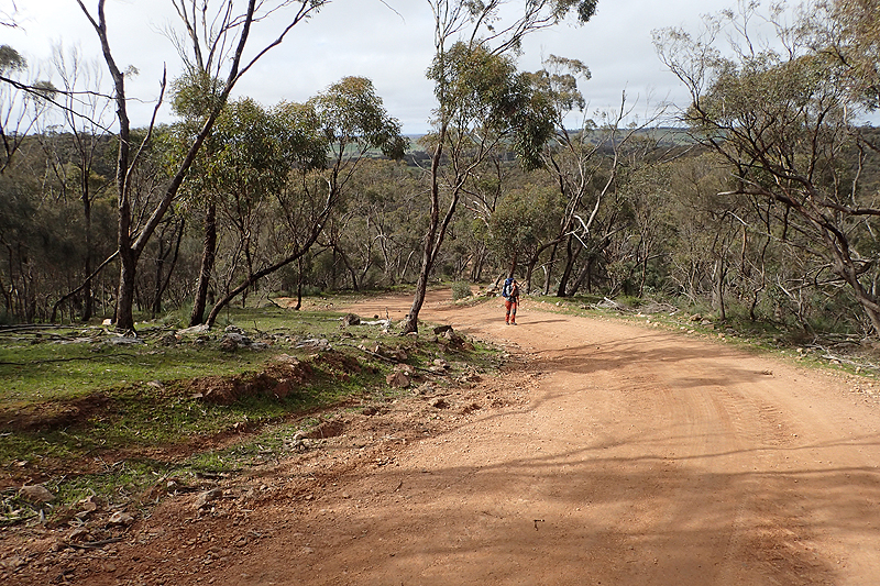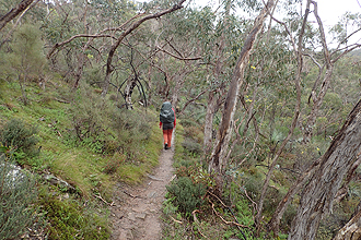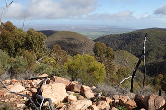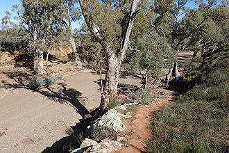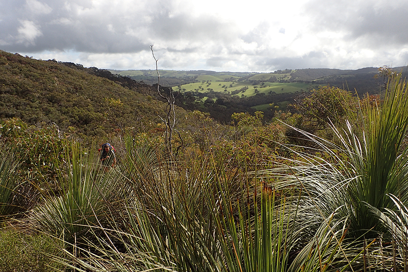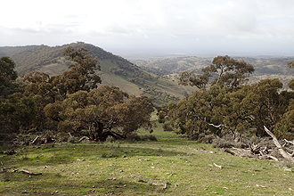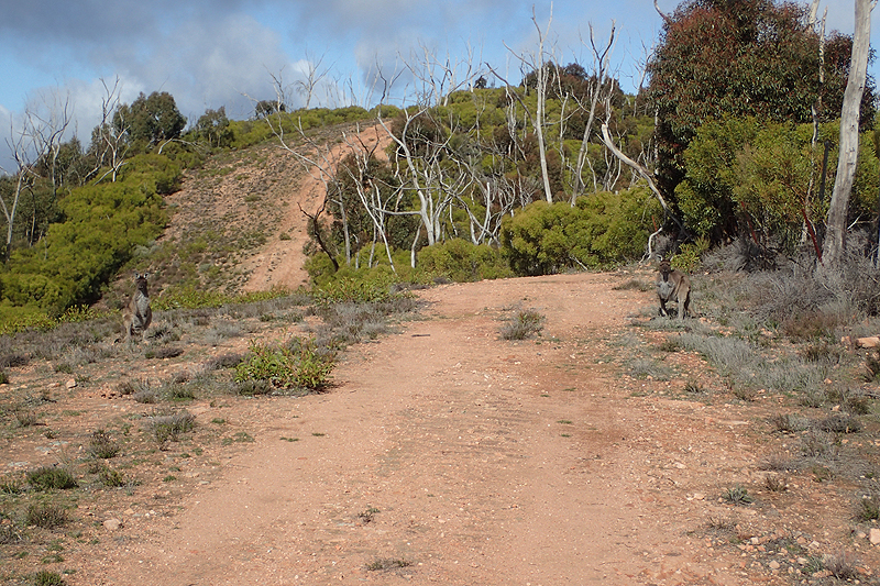 We got to Norton Summit eventually and had a rest in the little park with a cup of tea. It had been a long day. It felt very long for me as this was the only day on the trail where I really took strain. I just did not feel like walking today. But as I told Mike, if you only have one day like that in a two month hike, you are doing well. We camped along the track in Giles Conservation Park. As we lay in the tent in the dark we heard a wild pig snorting nearby. This continued until it was obvious that there was more than one, and also that they were right at our tent. When we looked outside and shone our headtorches though, there was nothing there. We were lying there wondering about wild pigs, until the penny dropped, "They are koalas!" How exciting. This is how they behave, they walk along the ground at night and climb up into other trees. The sound was fearsome! You would not want to trifle with these things. We had often looked in trees for koalas as we walked along, but had not seen any. I wondered if they may be in the trees in the gully below.