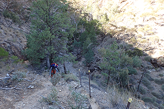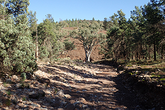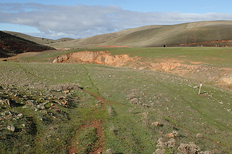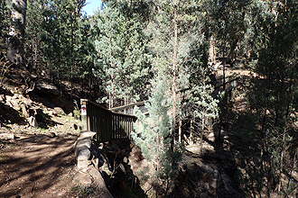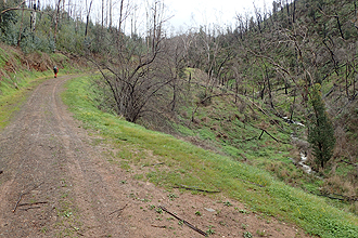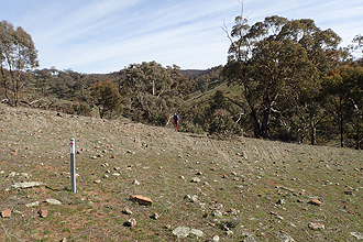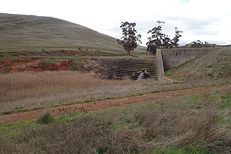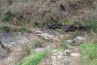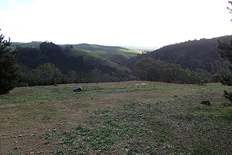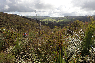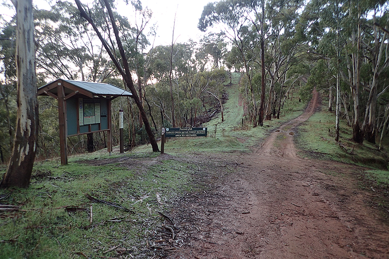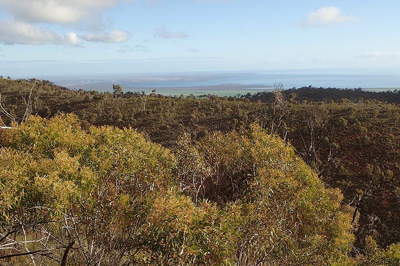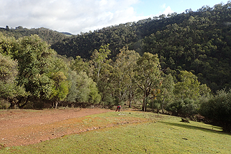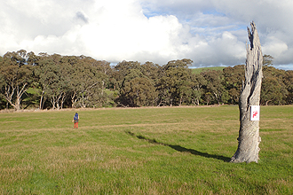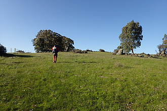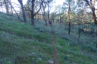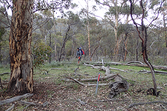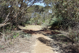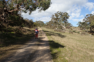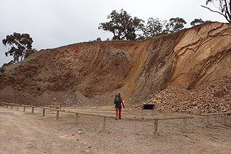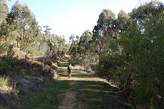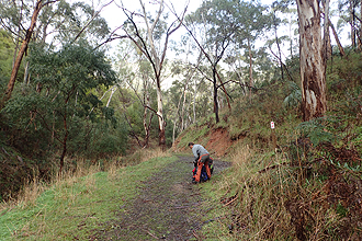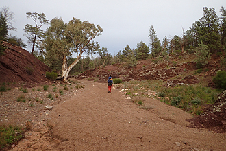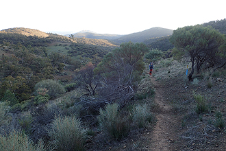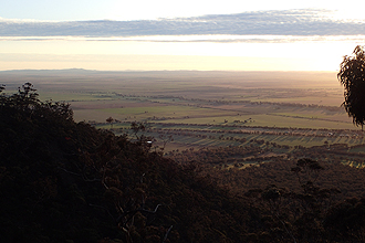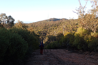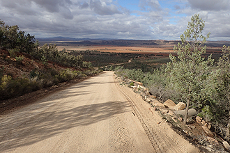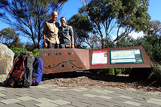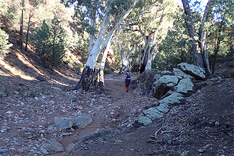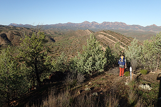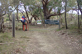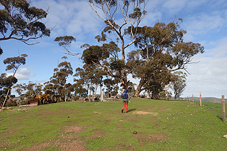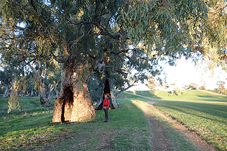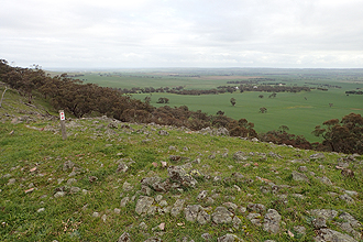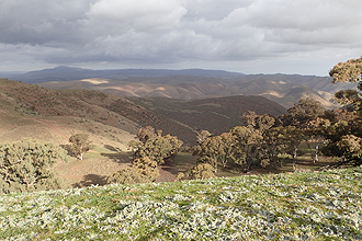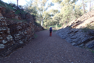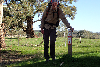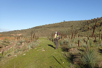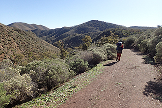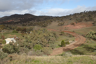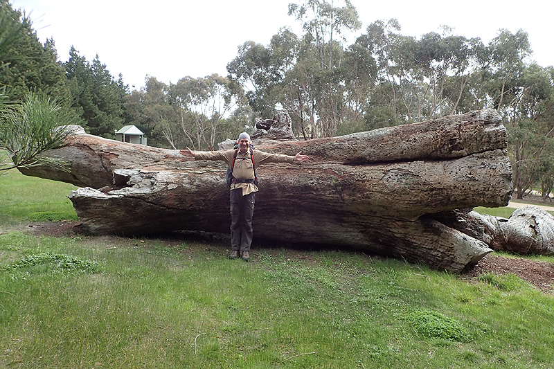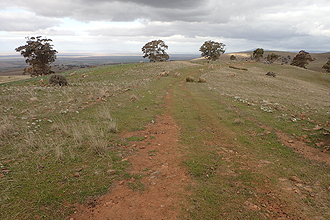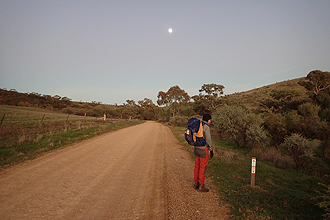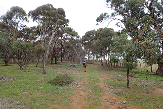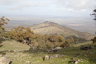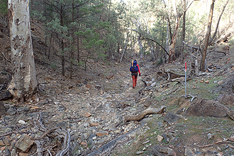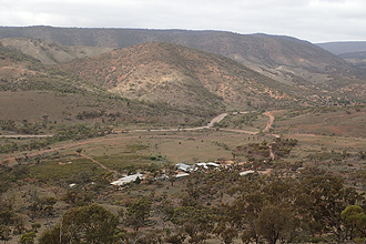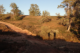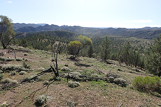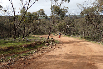 We got to Norton Summit eventually and had a rest in the little park with a cup of tea. It had been a long day. It felt very long for me as this was the only day on the trail where I really took strain. I just did not feel like walking today. But as I told Mike, if you only have one day like that in a two month hike, you are doing well. We camped along the track in Giles Conservation Park. As we lay in the tent in the dark we heard a wild pig snorting nearby. This continued until it was obvious that there was more than one, and also that they were right at our tent. When we looked outside and shone our headtorches though, there was nothing there. We were lying there wondering about wild pigs, until the penny dropped, "They are koalas!" How exciting. This is how they behave, they walk along the ground at night and climb up into other trees. The sound was fearsome! You would not want to trifle with these things. We had often looked in trees for koalas as we walked along, but had not seen any. I wondered if they may be in the trees in the gully below.
