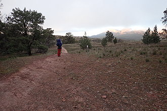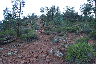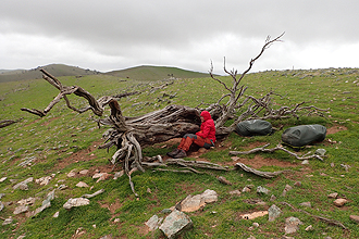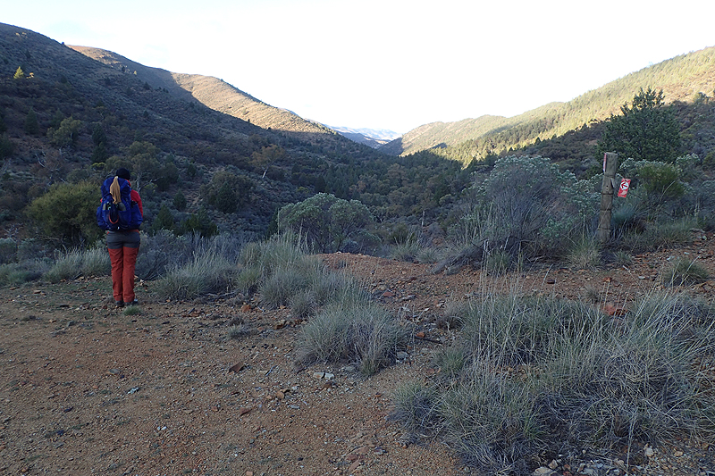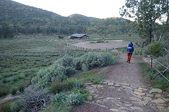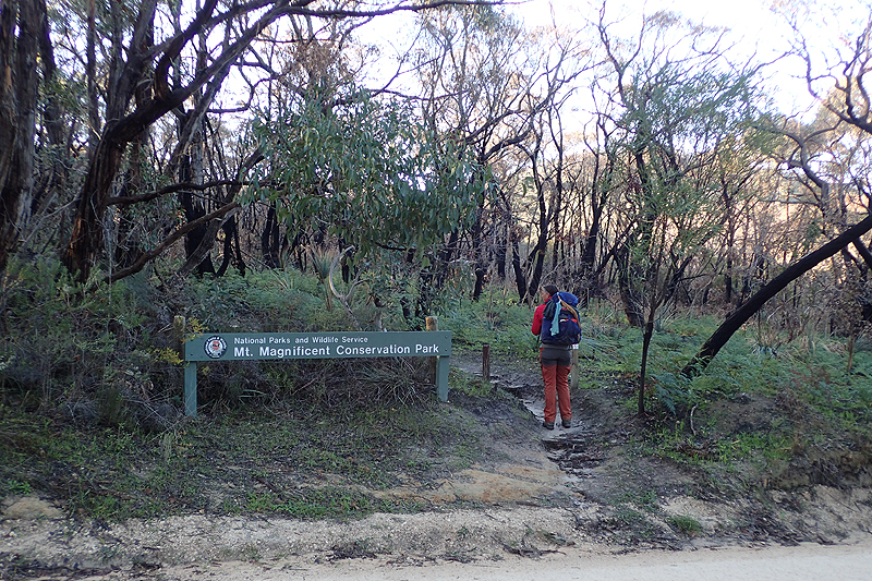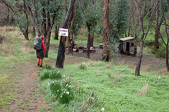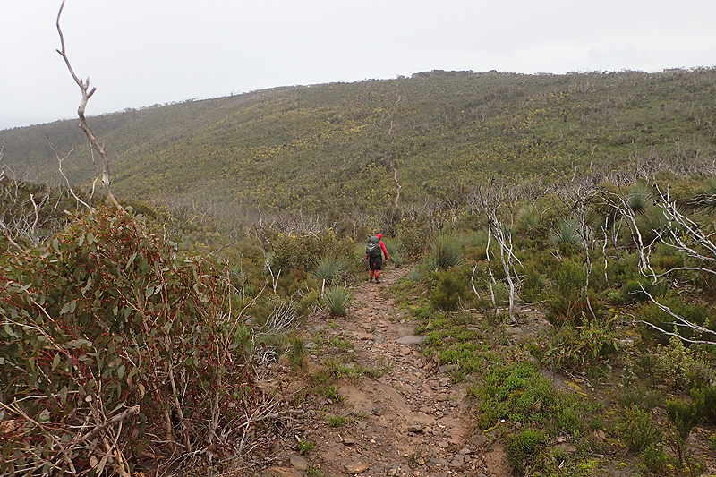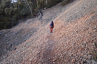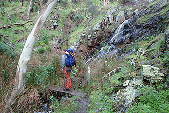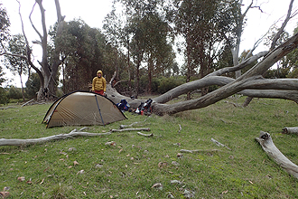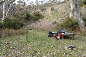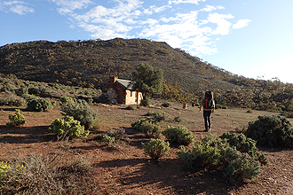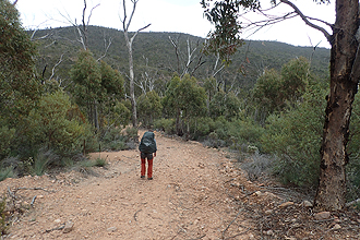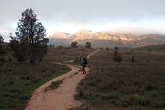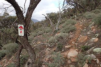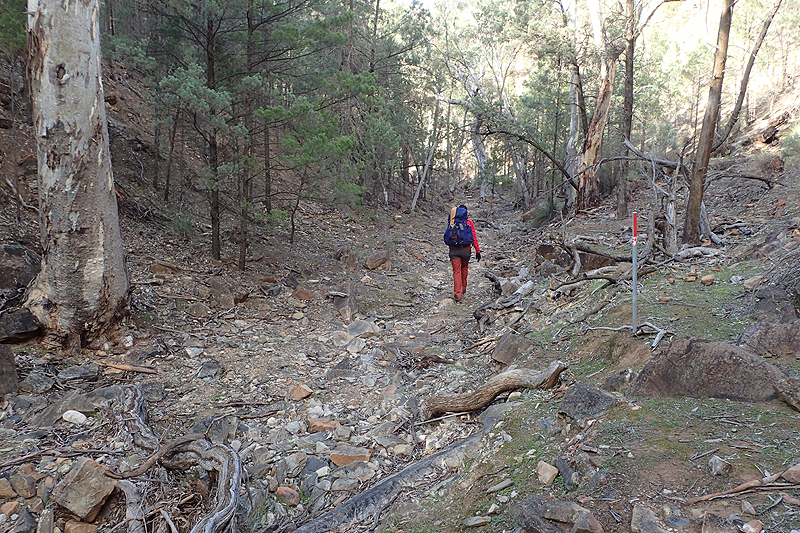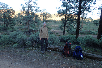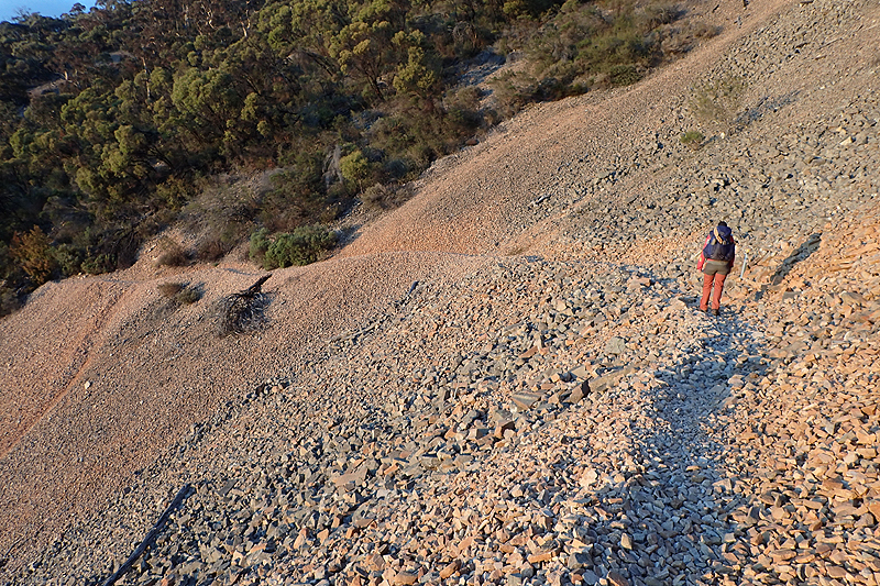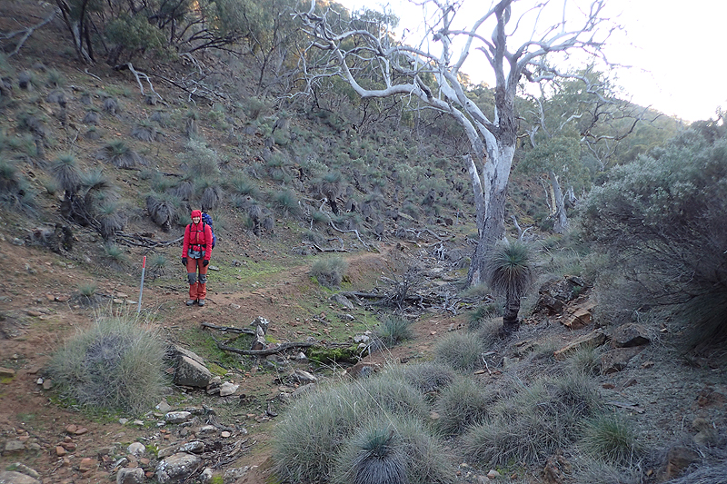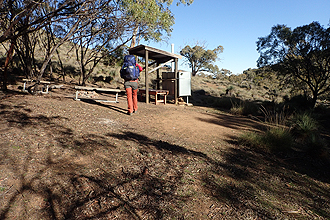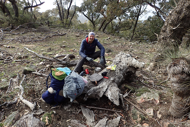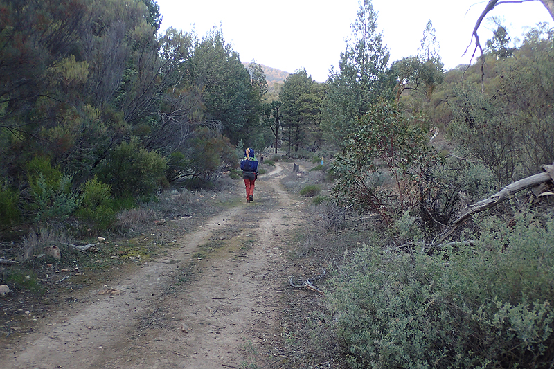 The walk today was far more interesting and challenging than yesterday's. We stopped for coffee at Yanyanna Hut which was nicely situated. After this there was a lot of climbing and descending and the plant life was very diverse, from sparse fir trees to large ferns in the gorges. We camped just after Wilcolo Campground. It was a pretty long day. We set our alarms for 05.30 each day which was easy to stick to for the whole walk. That allows us to be walking off by 07:00. It means waking up in the dark and watching sunrise everyday as you eat breakfast. It's the best part of a winter Australian trip as in summer that sun always beats you to it, even more so in the northern hemisphere. Only way to live! So even when you arrive at your destination at 14:30, it has been a long day! It was never a chore to get up that early though, we found we looked forward to each day. Our path passed Wilcolo followed the same route we used by bike last year and we camped at Wilcolo last year. We saw Annette, a thruhiker that our bus driver picked up in Hawker and provided a lift to the trail head 6km outside Hawker. She was going to try to make it to Yanyanna Hut that night which seemed a tall order. We would read her log book comments all the way from Mayo Hut onwards, delving back into her past so to speak. As we set camp a group of 4 hikers walked along the road above us, must have been heading for Wilcolo. They did not see us.