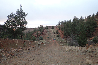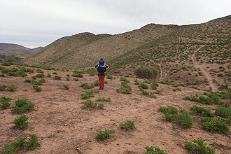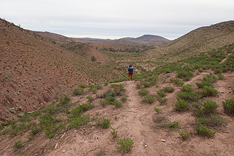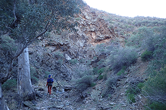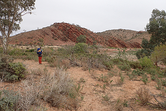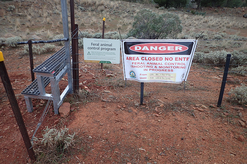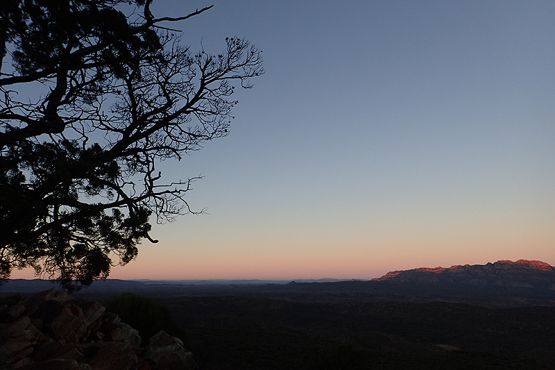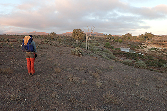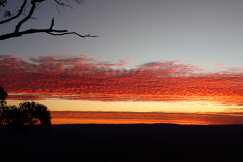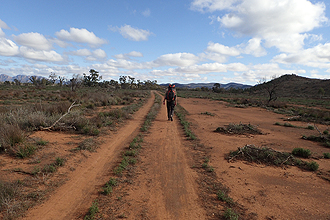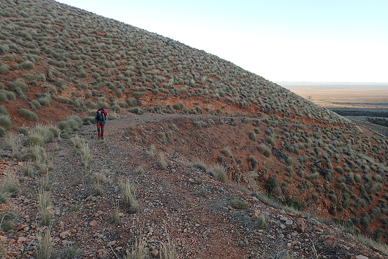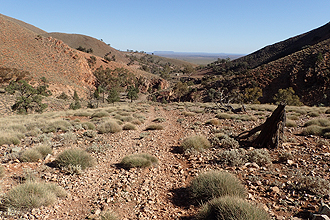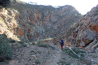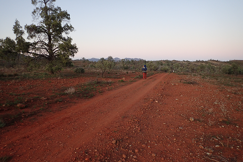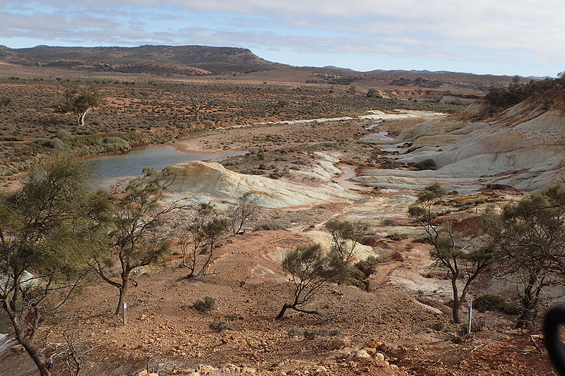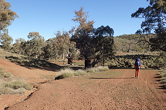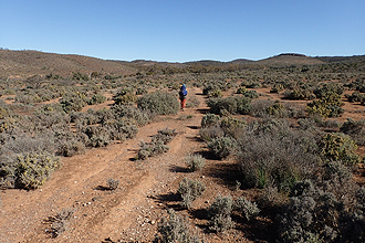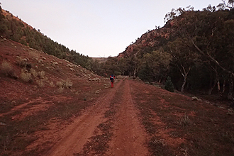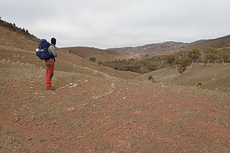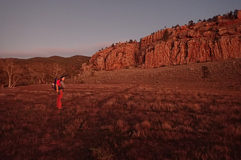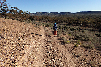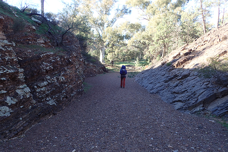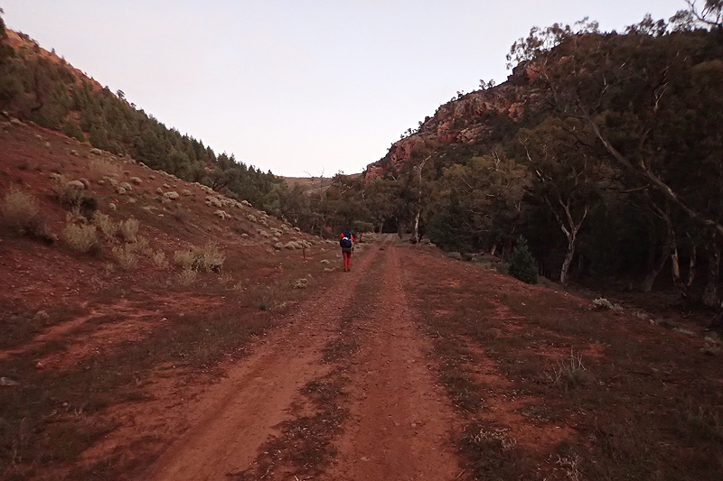 The weather is now officially cold. I tried to find some yoghurt for my face last night but there was none in my pack. This morning walking along farm tracks we met a young cyclist who was cycling the Heysen from Quorn to Parachilna. Obviously the Mawson was not a sufficient challenge for him. He was a downhill off-road biker and spent the day before carrying his bike mainly though creek beds which aren't really designed for cycling. He was hoping to reach Parachilna tonight. We weren't sure if that was possible but he looked enthusiatic, and very young so who knows, maybe he did. We passed two 4x4's and the occupants waved at us. We reached the colour-percolated layers of rock overhanging Wilochra Creek and pressed on. We climbed up out of the creek for quite a distance and walking through some small trees I had a very close call with a stick too close to my eye. Luckily escaped with said eye intact. After Buckaringa North walk-in site it was a surprise to find the conservation area that the trail enters closed for feral animal shooting. This had not been advised on the Heysen website prior to us leaving. We weren't sure what to do and walked along the road that ran alongside. There was no advice regarding alternate routes, just that the trail was closed for a period of a week. A bit nuts really! We decided to camp in some open bushland on the adjacent farm and could hear the gunfire quite close. The next morning we got up at 04:30 to enter the conservation area and walk through in the hope that they did not shoot before dawn.