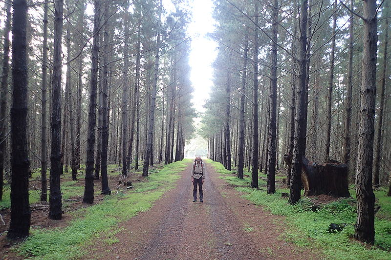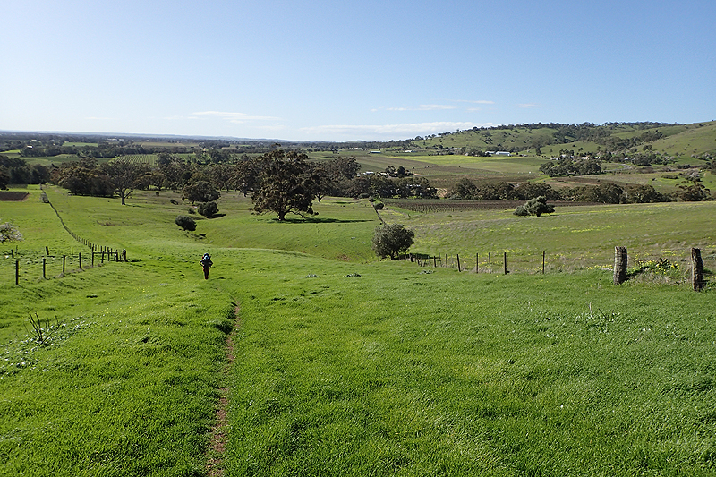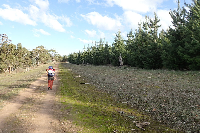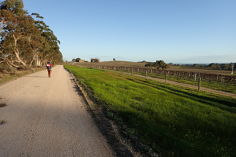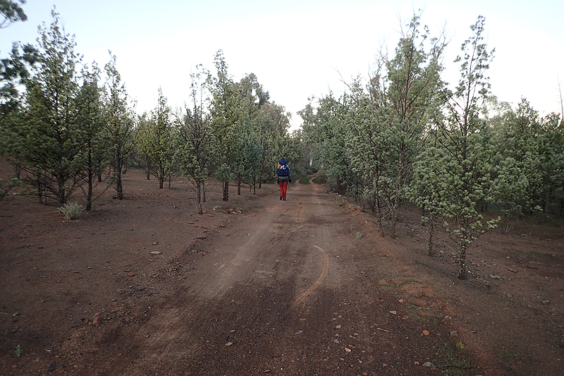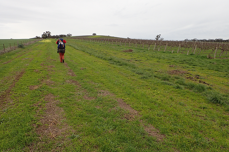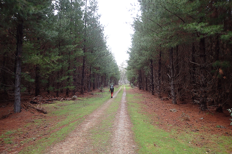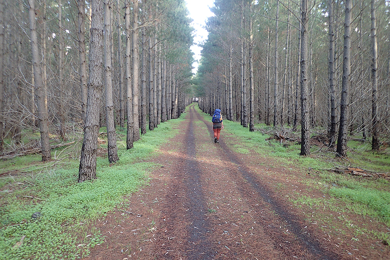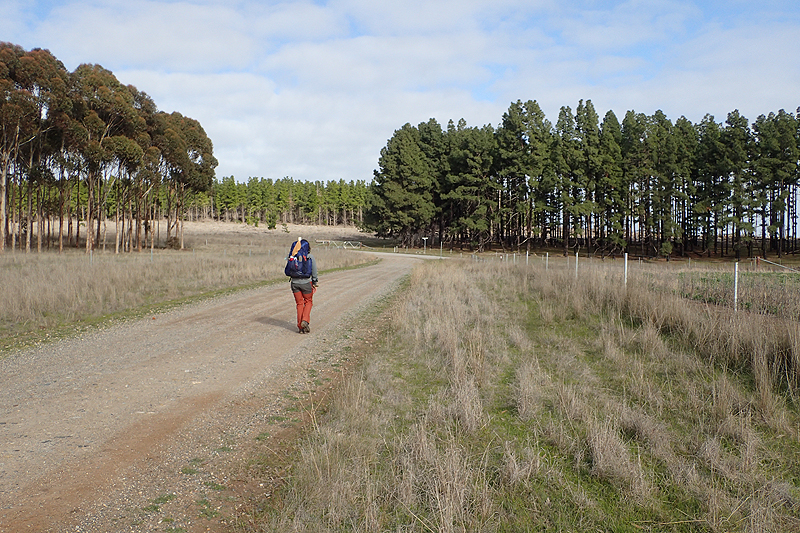 We entered the Barossa Valley proper today and vinehards abounded in all their naked glory. We saw many people pruning the vines in readiness for spring. We chatted to a vineyard owner who was walking his dog along his property fenceline. Everyone says the same thing, that their rain tanks are full this year. There has been a lot of rain. It all looks beautiful. You can understand how a few good rain years would have lulled those first settlers into a false sense of security. We collected our new zip sliders and my new mattress in Tanunda, resupplied and relaxed in the sun for a couple of hours eating and packing on a field near the old railway. Tanunda looks a nice town. We had a big resupply as Bridgetown was a long way away, 5-6 days. The climb out of Tanunda is not to be trifled with, especially when you are carriyng such luxuries as fruit cake! It was a big, beautiful climb with Tanunda and indeed the whole Barossa Valley laid out beneath us. We walked through Kaiserstuhl Conservation Area and into the SA Forestry pine plantation where Rossiters Hut is. We camped a few kilometers after it. We love the pine forests, we always feel at home in them.