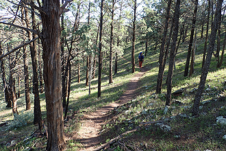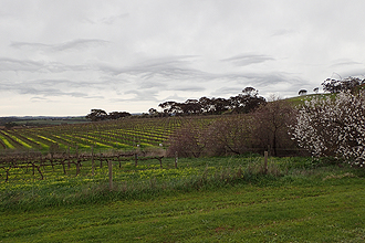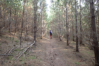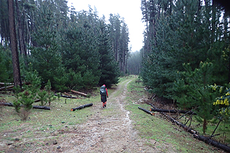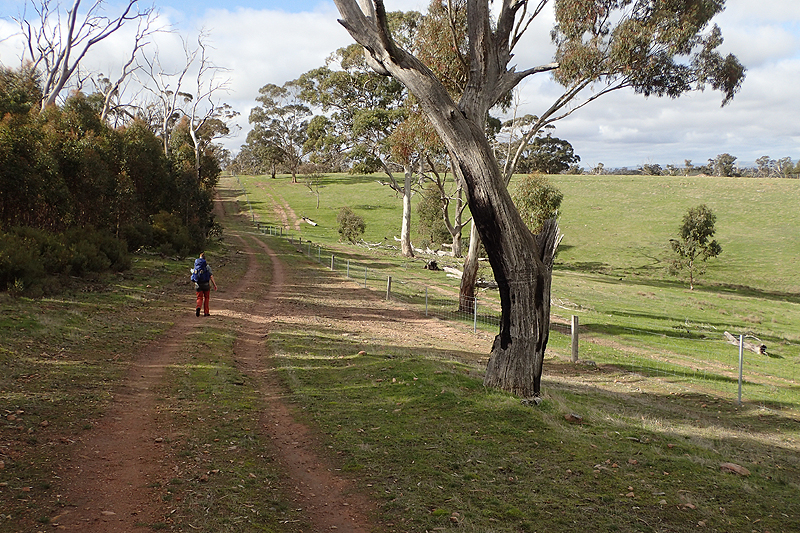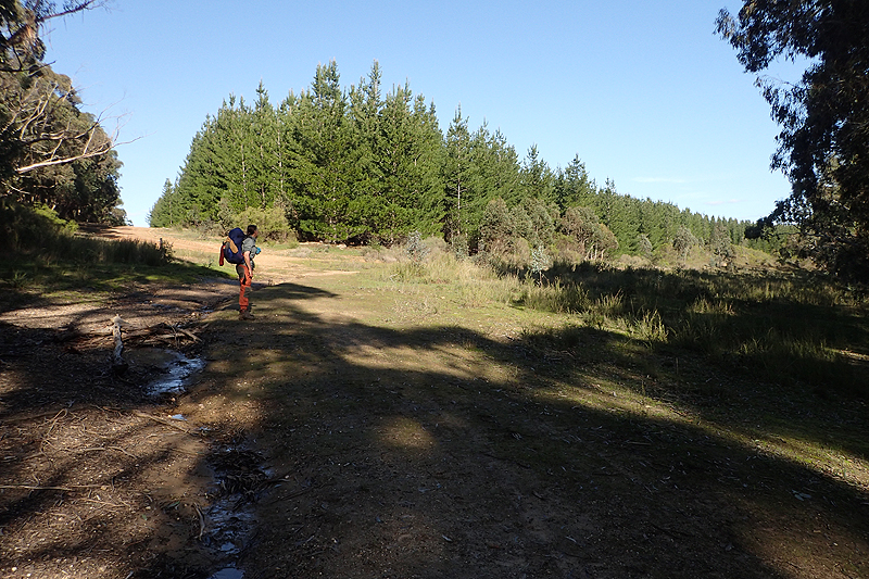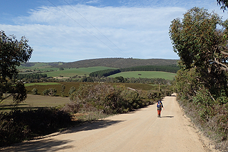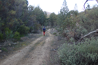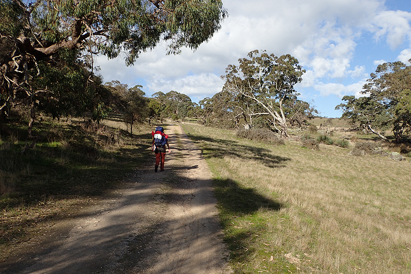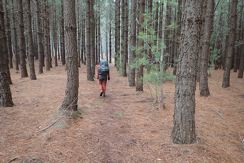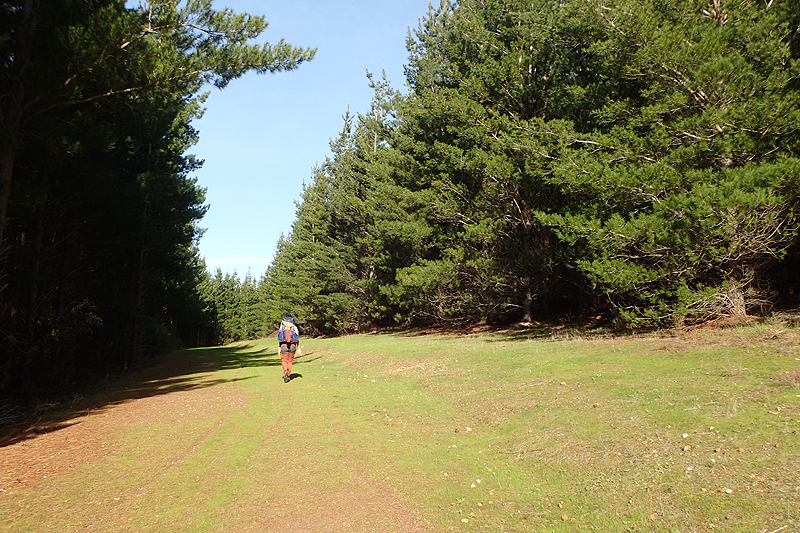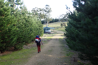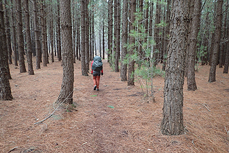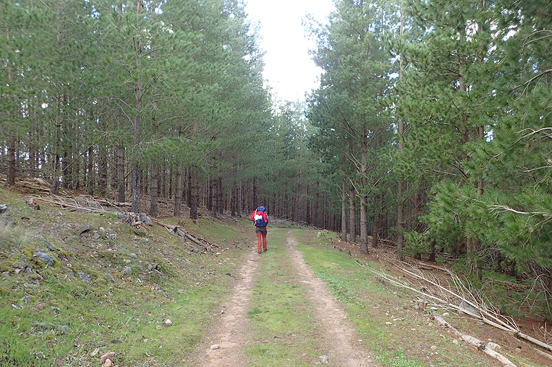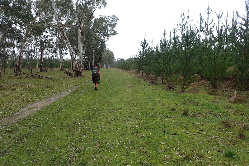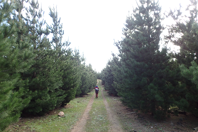 We entered the Barossa Valley proper today and vinehards abounded in all their naked glory. We saw many people pruning the vines in readiness for spring. We chatted to a vineyard owner who was walking his dog along his property fenceline. Everyone says the same thing, that their rain tanks are full this year. There has been a lot of rain. It all looks beautiful. You can understand how a few good rain years would have lulled those first settlers into a false sense of security. We collected our new zip sliders and my new mattress in Tanunda, resupplied and relaxed in the sun for a couple of hours eating and packing on a field near the old railway. Tanunda looks a nice town. We had a big resupply as Bridgetown was a long way away, 5-6 days. The climb out of Tanunda is not to be trifled with, especially when you are carriyng such luxuries as fruit cake! It was a big, beautiful climb with Tanunda and indeed the whole Barossa Valley laid out beneath us. We walked through Kaiserstuhl Conservation Area and into the SA Forestry pine plantation where Rossiters Hut is. We camped a few kilometers after it. We love the pine forests, we always feel at home in them.