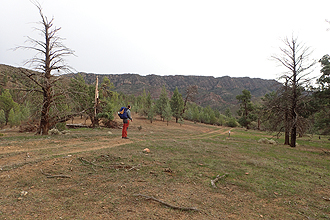 Pretty rough walking today, all in creeks until we climbed out to Eyre Depot. The creeks were narrow and some of the climbs in and out of them pretty technical. The views when we were out of the creeks were amazing. We don't mind walking in the creeks too much but probably will be happier when they come to an end! Approaching Eyre Depot we met up with the same two couples we saw yesterday, making their way by car to another point where they will start hiking again. They gave us some details about the the trail from Eyre Depot to Dutchman's Stern. We made our evening meal at Eyre Depot, admiring the view of the flatlands in front of us. An end to end group of about 6 hikers came along, they had hiked from Dutchman's Stern. The bloke up front said this was their last section to complete for their end-to-end. People do feel rather accomplished about these things, but when you get down to it, it's just walking. The poorest people in the world do it with no equipment and over much vaster distances. After eating we headed on for a few more kilometres to camp in a creek bed, keenly observed by some grubby sheep.
