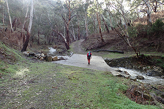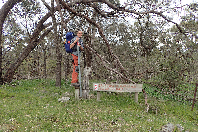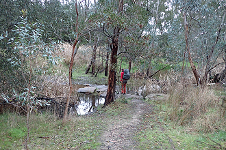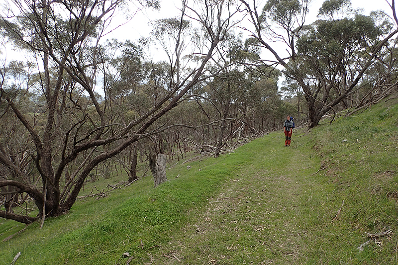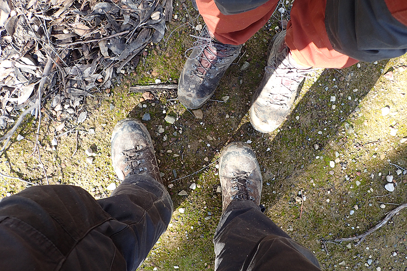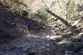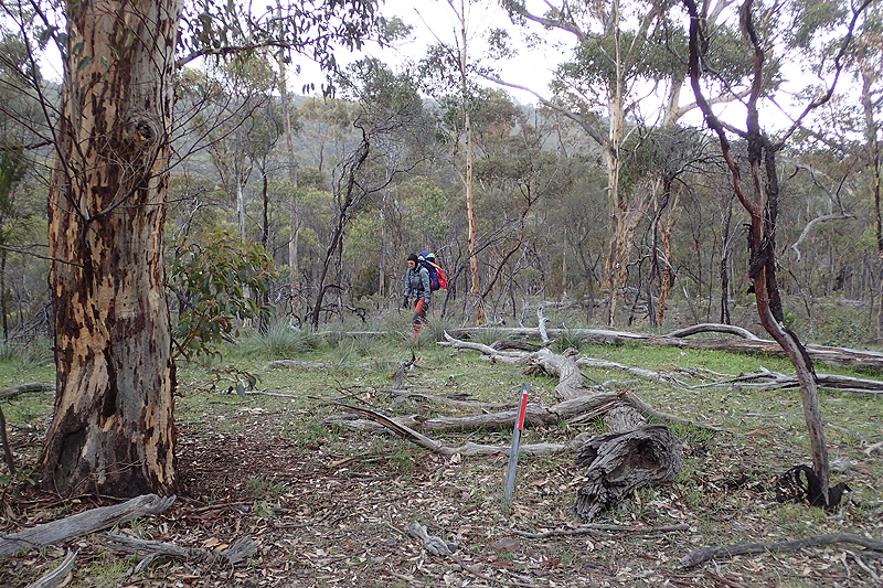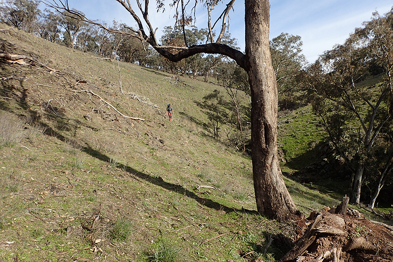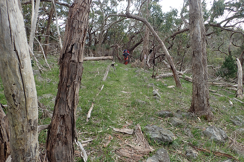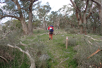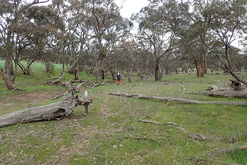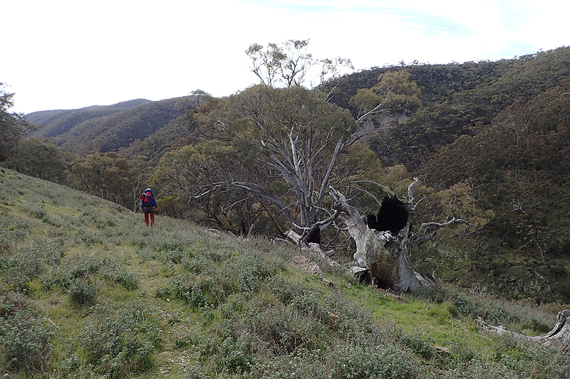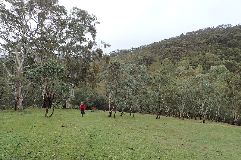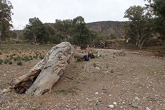 Mainly creek walking today. I had been a bit worried about this before the hike and many people complain about it saying that it is very slow, easy to twist an ankle, wear and tear and sore feet, etc. This was one of many examples which support wearing sturdy, leather hiking boots which provide good ankle support and a solid footbed as opposed to what almost everyone else wears on this hike; lightweight fabric trail shoes. Some people even just wear trail runners. This seems to be the modern trend. We cannot comprehend why you would undertake a long distance hike without proper hiking boots. We both wore Hanwags on this hike and they were brilliant. The rubber soles were very tenacious and the quality of the leather superb. So although the creek walking is quite slow, the boots helped alot and as creeks run at a pretty gentle grade, the walking felt quite flat. It is an interesting idea, using the dry river beds for walking in. Certainly when it floods the hike would no longer be usable. They make for ready made tracks which do not need to be maintained, they simply exist as the river pathway with next to no environmental impact too. It is lovely walking in them, the change in temperature and light, little birds that you see, evidence of prior flooding. Closer to Mayo Hut, the creeks became really wide as the flood plain opened up and here we saw massive trees that had been swept downriver at some point and rest, pushing up against sturdier red gums. We wondered about the strength and size of a flood that could uproot trees like these and carry them along.