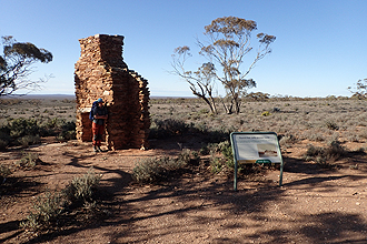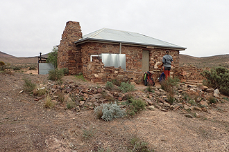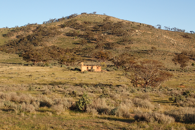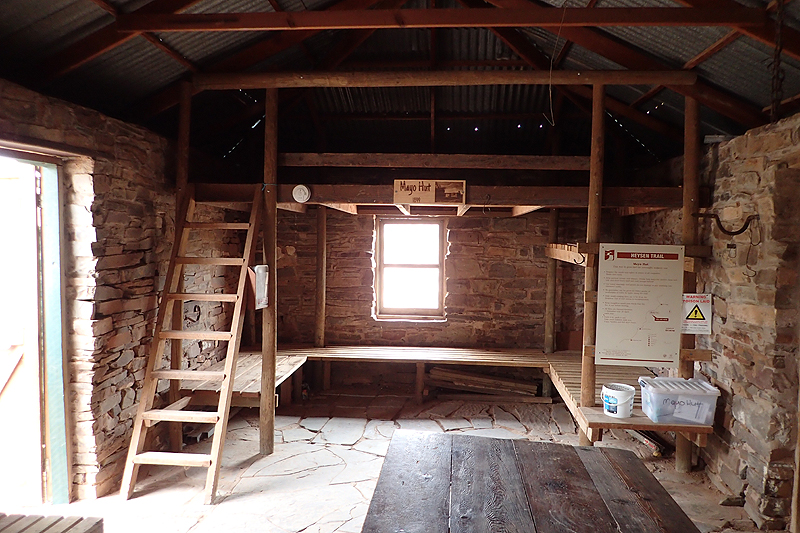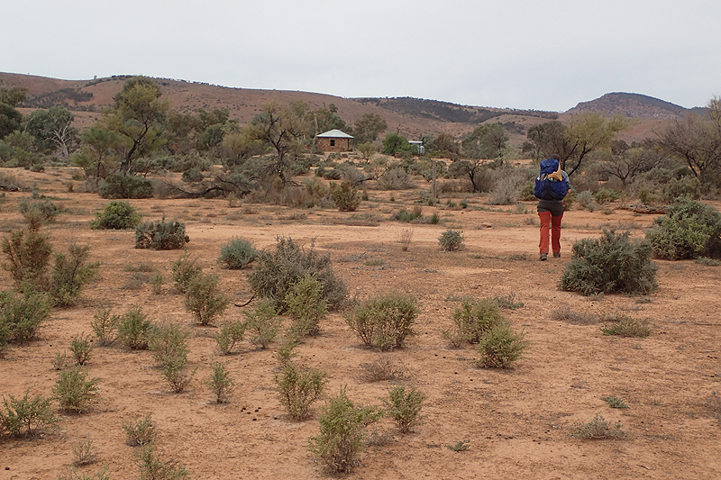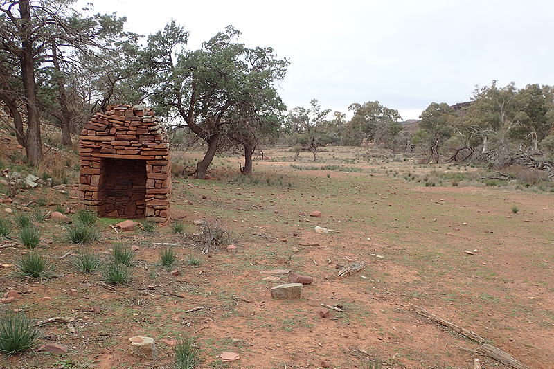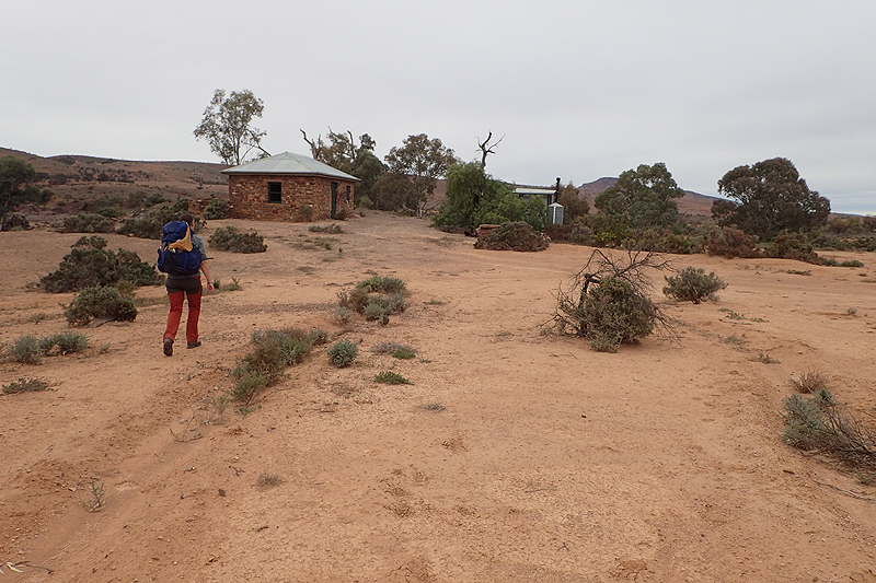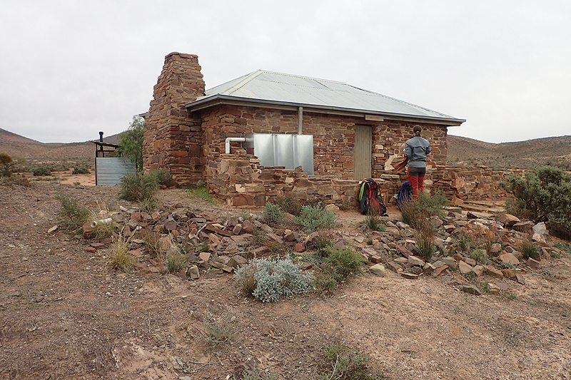 Caroona Creek and especially Touralie Gorge highlight the diversity of this trail. The fact that it swings so far east over the Goyder means that you feel like you are back in the Flinders again, so desolate and remote. Beautiful walking through the little gorge. Brought back memories of all the creek walking we did before Quorn. Touralie Gorge Hut was worth a look. It was just beautiful with its own rain tank to boot! It was exactly like a bothy that you would find in Scotland or Ireland. It is the only hut that we would have felt happy to sleep in. It was a fun walk today with a lot to see. Climbing out of the gorge there is the surviving hearth and chimney of an early pioneer cottage with the story on an information board. Another tale of tough pioneers who established a homestead out here that had to be accessed via the gorge. Usual story, arrived in the 1890's, packed it in after 10 years. Well in this case, they moved to a different part of the area. These people would have had to cope with so much hardship. No going back in those days. We walked on to the next Heysen shelter, Caroona Creek walk-in shelter which was really nice, pretty simple open structure, but new. There were many bees about. The minute you get water from the tank they arrive in droves. They must be able to sense the water. After this it was quite challenging walking to our bushcamp after Oldikie Creek. We felt tired and this was not helped by the extra water we carried. Still, it always feels worth it to camp at a great spot. We were lulled to sleep by the "drumbeat" honking of an emu.