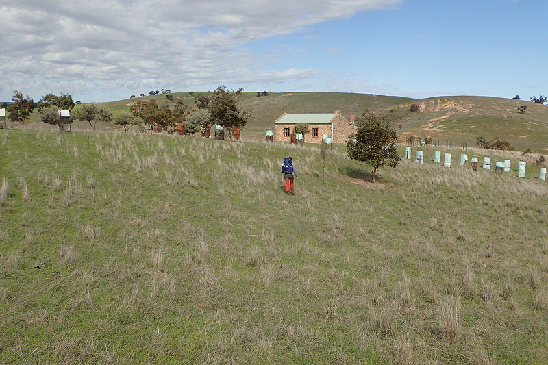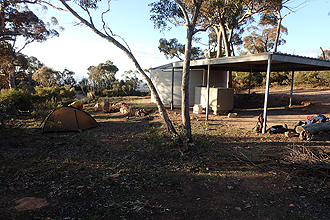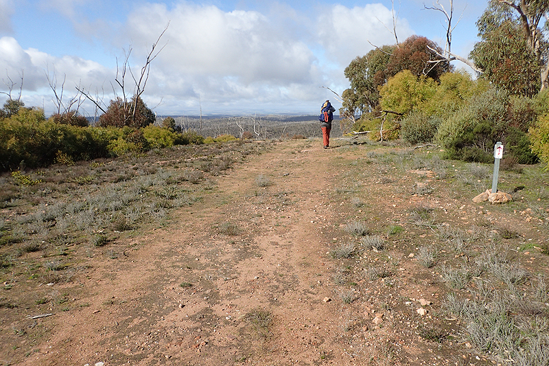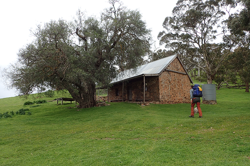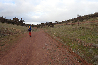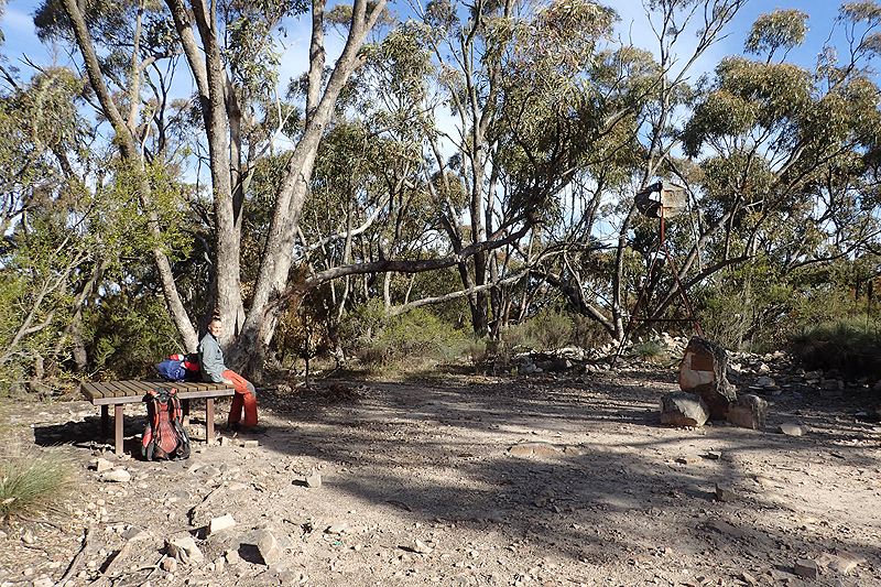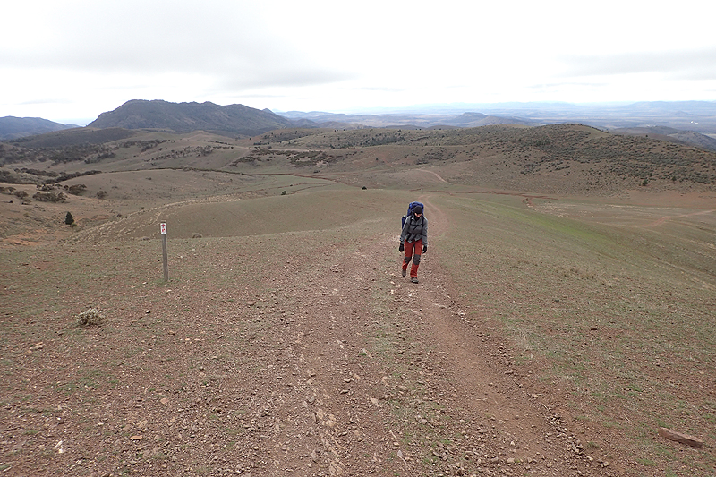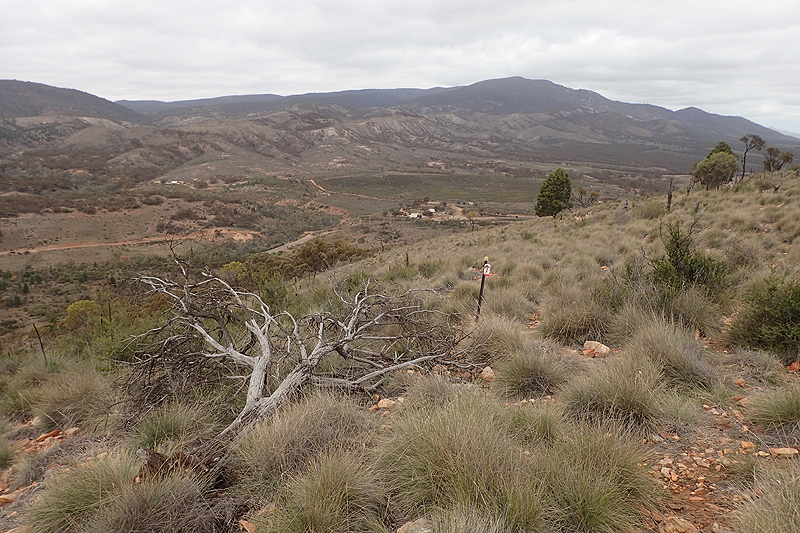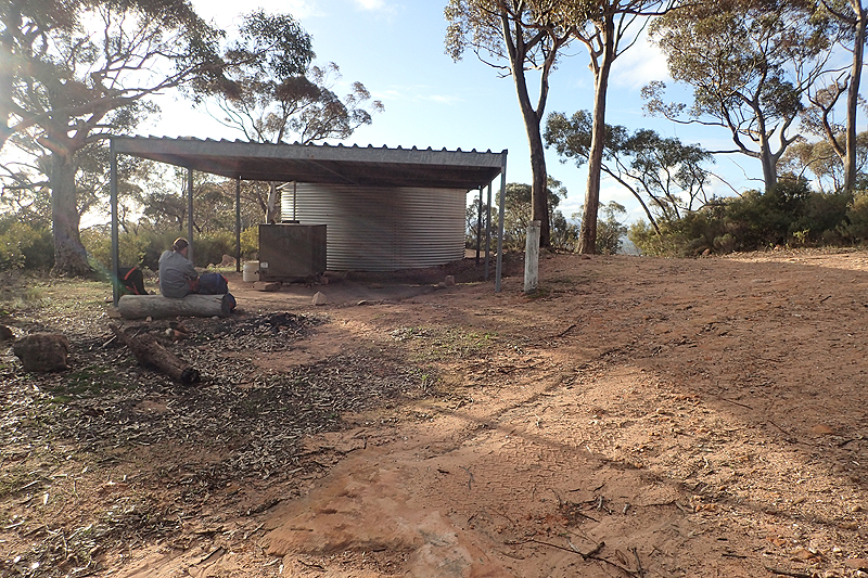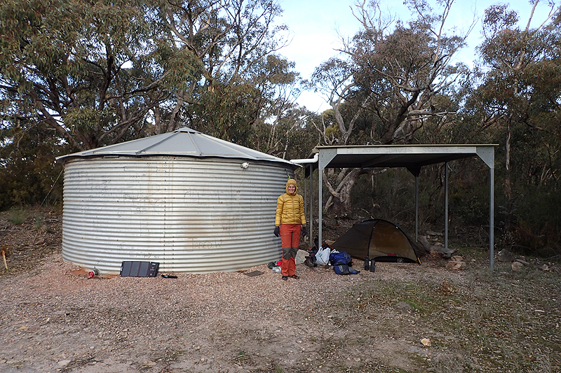 Frost overnight still encrusted grass and plants at 10:30 today. It would have been really cold overnight, it was cold walking. Very cold. There was a bit of road walking today on farmtracks that went up and down and along fencelines that went up and down too! We had a meal at Grays Hut and then hiked up the track to Mount Remarkable where we camped at the old Heysen campsite up there. There is a large firefighting tank with a small shelter. It was protected from the wind. We had carried water up there from Grays Hut as you obviously can't use the firefighting tank water. It was a good night up there.