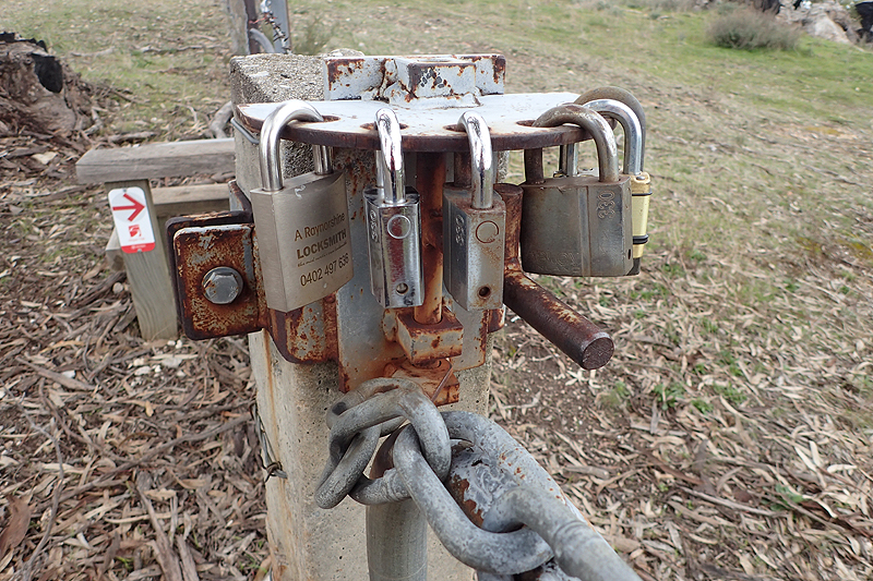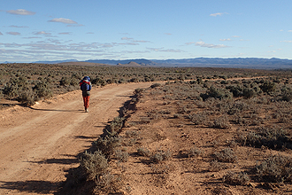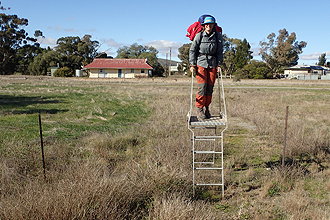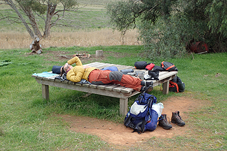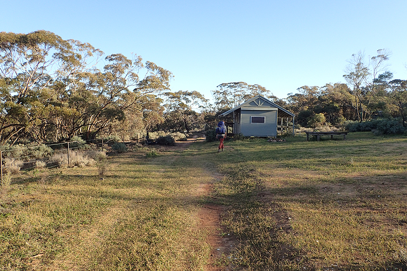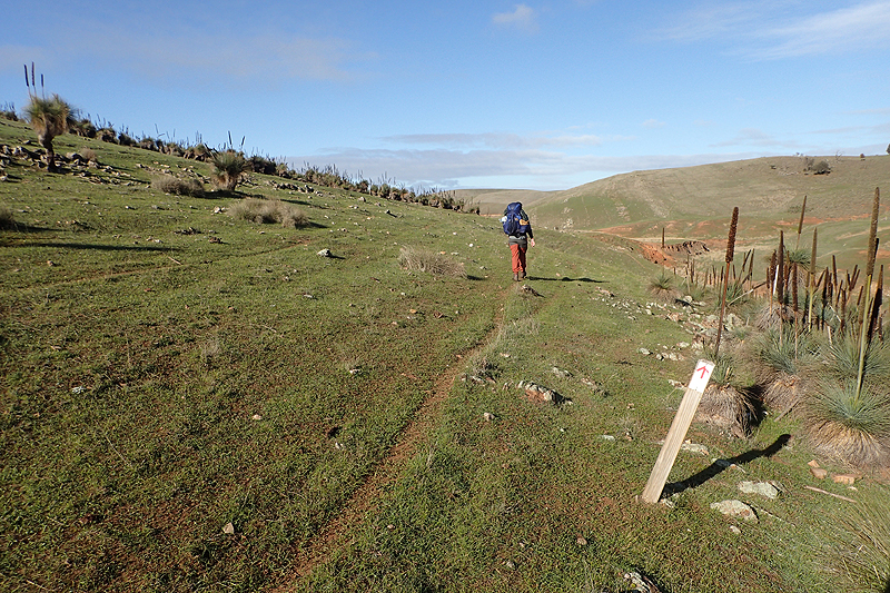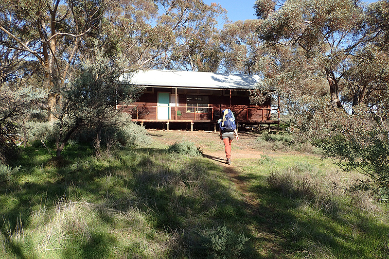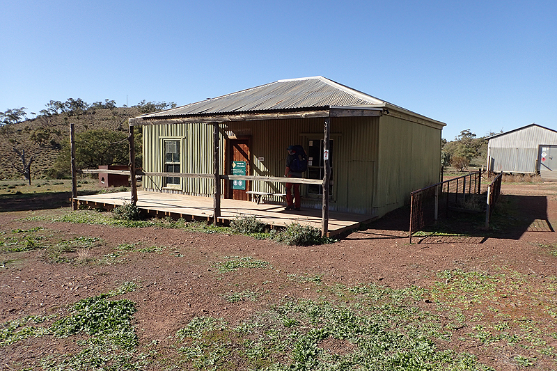 Very cold and clear day and a nice quick walk along farm roads with great views. We loved it! We love looking at the farms and seeing what's going on. We were nicely suprised by a sheltered table and benches for morning tea. Many people complain about this day as it was lengthened due to a trail no longer having permission to access a farmer's valley, so now it runs along the farm roads and is longer. We didn't really mind. We have started seeing these GIANT weeds, they look like thistles on steroids. HUGE! Often in waterways. I think it is due to fertilizer that they grow seemingly unnaturally big. We were at Bowman Hut quite early. We should really be transparent about something here. We appreciate the huts and the facilities they provide, however we don't really care to use them. We are perfectly happy with our tent. If each site had a toilet, water tank with little roof and MPP we would be ecstatic. Huts always equal rodents. Even if they don't, you worry that there will be rodents. And not just in the hut, your gear isn't really safe around the huts either. At Bowman we camped as far away as we could from the building. When we read the log books at the huts though, other hikers really like being indoors. Actually a lot of the time they seem to prefer to be indoors at a pub or hotel and will seemingly walk very long days to avoid using their tents. We call them "pub to pub hikers". Hee hee. Anyhow, I digress. Bowman Hut, Lovely afternoon spent sitting on the verandah in the sun, airing out sleeping bags, etc. The peace was disturbed by three young men staggering out of the bush from the trail. Trail runners, but not the usual sort. These guys, well two of them at least, looked absolutely bloody buggered. They approached us and sort of weaved about on their feet. The more normal looking one asked, "Do you know which way the Heysen Trail goes from here?". Mike pointed. "These guys are running it," he said. "They are aiming to break the record." One of the absolutely buggered guys behind him said, "We started at Parachilna a week ago and we will be at Cape Jervis in a week.". The other said, "I would rather be doing what you are doing." We wished them good luck and off they staggered.