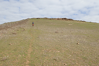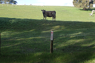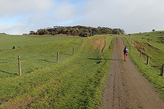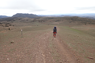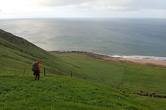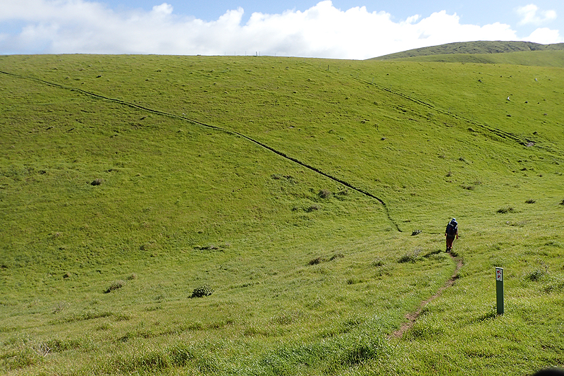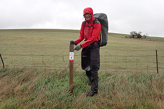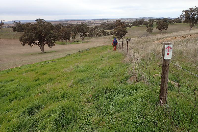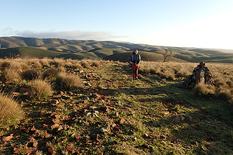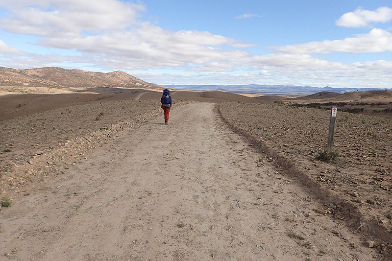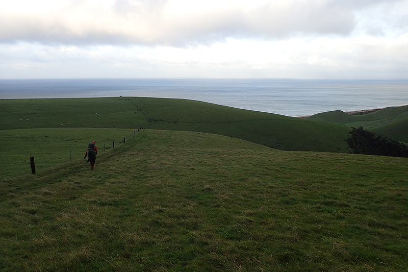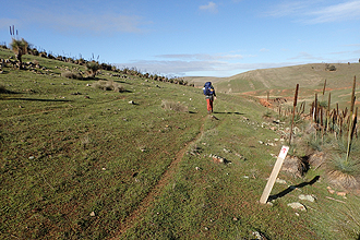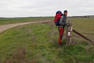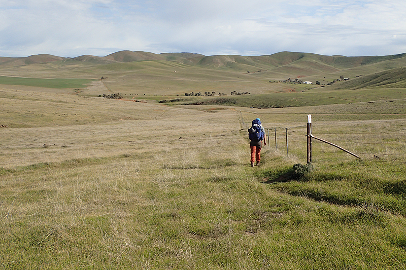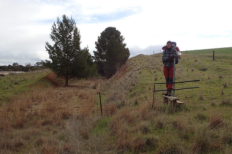 Cold morning and we were to walk into a cold headwind all day. I was reminded of the hotel receptionist in Belfast years ago who told me to put yoghurt on my face!! We had a water tank early in the day at Mount Elm walk-in site after which we had highly irritating walking through rock strewn paddocks. This was early in the piece for us so we were following the rules to the letter. If the sign said "Walkers Follow Fence", that is what we did even if that meant carefully choosing every tiny place to put your foot. Glancing to the left of course there was naked, dirt pasture. That would be the place the trail should go and if we had been doing this walk the other way round that would be where we would be walking. Sometimes this trail tries to keep out of the way too much. When you reflect on it you realise that there is the bare minimum of purpose built trail and it mainly just sticks to other well-defined things. So if you get people to "follow the fence", then the trail just gets created along the fence and you don't have to maintain it as a trail. It is just where the fence is. Eventually we did abandon crazy rock strewn path. Thing is though, if you choose to do that you have to make sure you don't miss any stiles or you will find yourself on the wrong side of the fence.