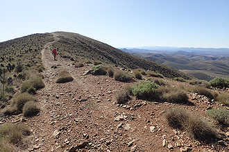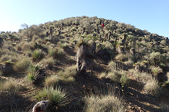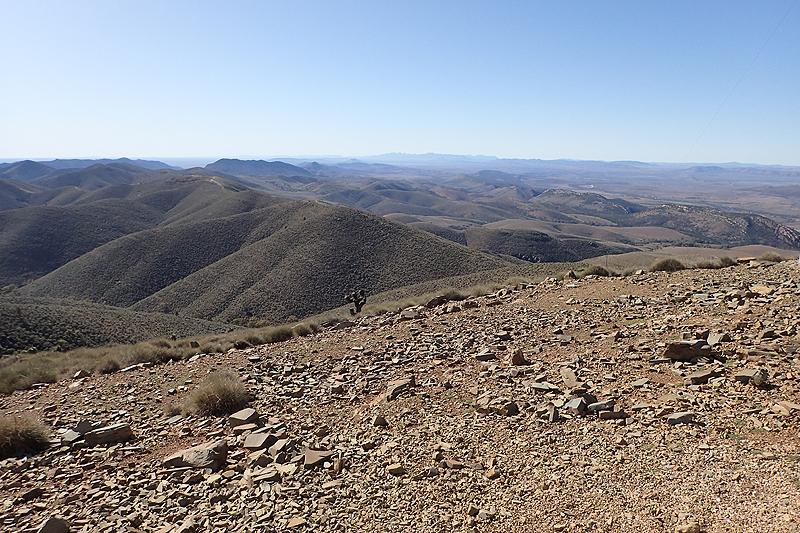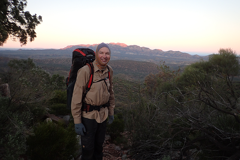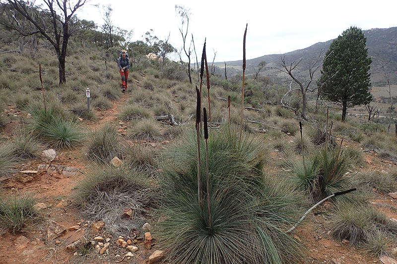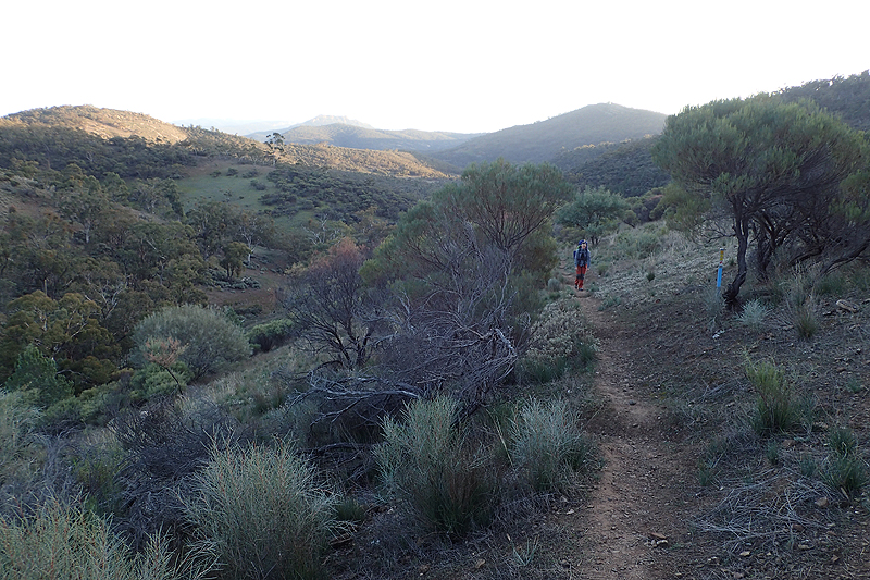It was a fun experience, walking by head torch and a beautiful sunrise. It took almost 2 hours to walk clear of the conservation area and we made tea just afterwards, overlooked by a large family of goats that had outsmarted the shooters. The rest of the day was a combination of creek walking but now with some steep climbs, sometimes a bit technical, and rolling hills including a long, winding, windy climb to Mt Arden in really cold temperatures. We met two couples hiking from Mount Arden and by coincidence they were the people in the 4x4s that had passed us yesterday. They were completing some day walks to cover this part of the trail. This is far more popular than end-to-end walking on the Heysen. Mostly older people, either walking with friends or who join official end-to-end groups which aim to complete the entire walk in 6 years via a highly organised and structure program. These people don't overnight on the trail, they do the day walks by travelling in two vehicles and then dropping one at one end and travelling together, etc. It must be highly motivating as each year you come together again over the hiking season with your new gear, a good way to keep fit, socialise, etc. The thing is though, Terry Lavender (the bloke who created this trail and who I would sometimes have fond words for and other times not), devised the trail with the intent being this sweeping experience all in one go through South Australia. When you break it down into so many pieces over the years, perhaps it loses something? The trail has brilliant parts and then of course slightly boring "transition days". You take it all in a thru-hike, but we couldn't help thinking that making a special effort to walk one of the boring bits would be a bit rubbish. As we walked the ridgeline towards Mount Arden there were forests of grass trees. A very steep climb up a bitumen road brought us to the summit with beautiful views from the top of the Spencer Gulf and as far as you could see to the east. Very rewarding and a nice surpise! We didn't expect such massive views! We descended to Mount Arden campsite, passing another big goat family as we went. Just before the Heysen site there was a better camping spot with a table and benches which we decamped to after picking up water.