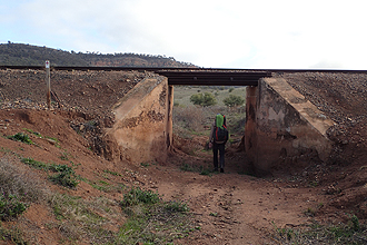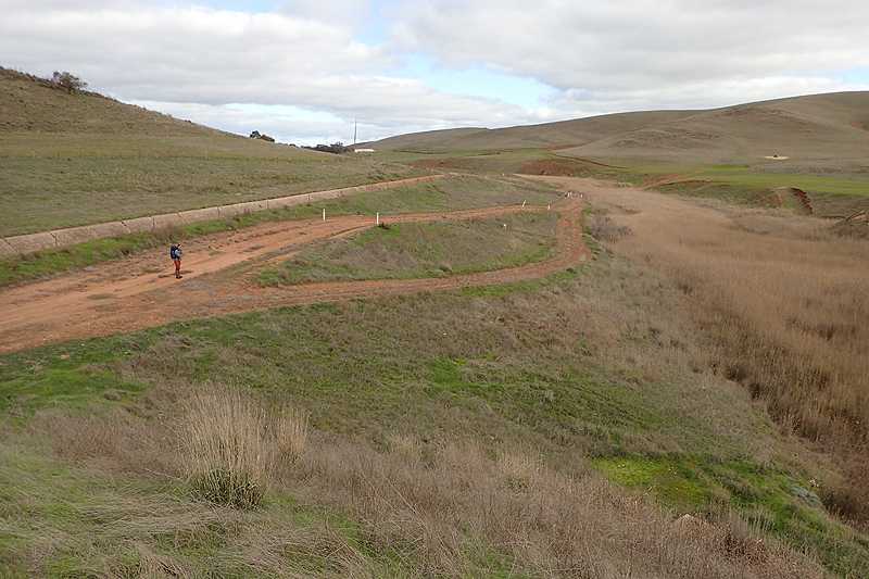 We felt that we came to a right understanding with the trail from this point on. From now everyday just kept getting better. We loved being in farmlands, seeing sheep with their alpaca guarddogs (guardalpacas?) and enjoyed using the little road corridors. We walked through a sheepfarm which was home to a burntout plantation of gum trees. The property was so well cared for and had some day walks established through it. We met a family of three who were busy clearing logs by throwing them downhill to collect into a trailer. The bloke was a wood sculptor and carpenter and the farmer allowed him and his wife to come and clear away the wood for free. He gets nice clear land and they get the wood. Apart from sculpting he also builds furniture and will build cabins for the farmer to set up on the property as eco-tourism. The trees collapsed as a fire raged through here a few years ago and then the area immediately had heavy rain and flooding, and the burnt out trees just fell over. Their lovely young daughter was on hand to help together with their dog. They were great to chat to. The dog and little girl had to have their wits about them to avoid the logs tossed down the hillside. Unfortunately the little dog, Poppy, had a slight limp and scar on one hind leg. "Poppy got rolled," the little girl told me seriously. Sometime after that we entered Wirrabarra Range Conservation Park and this area had a lovely feel to it. Flora of a variety not encountered as yet grew on the rocky slopes, a myriad of colours. We saw deer wandering close by and a lovely river. Quite idyllic. We climbed up through this pretty environment and along the ridgeline were afforded amazing views of the Spencer Gulf and Port Pirie. Go-Cart Shelter is in a pretty exposed spot way up on the ridge and it was cold and windy. We were happy to get into the tent.
