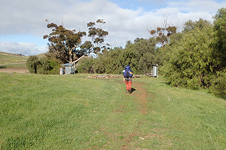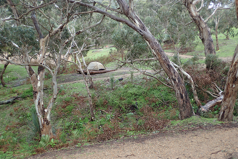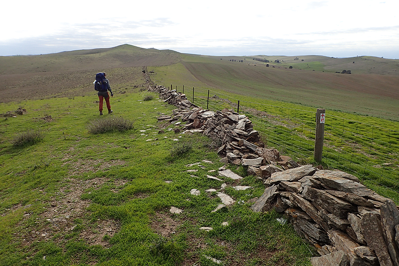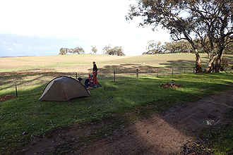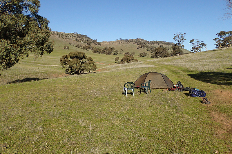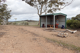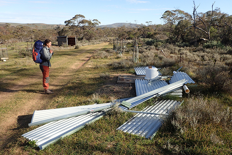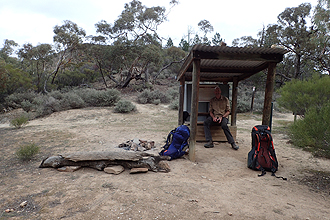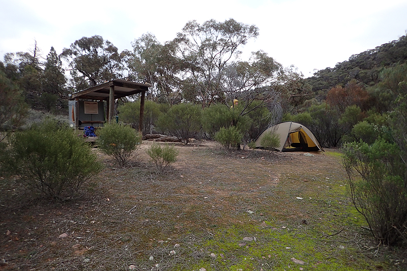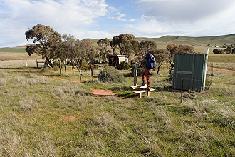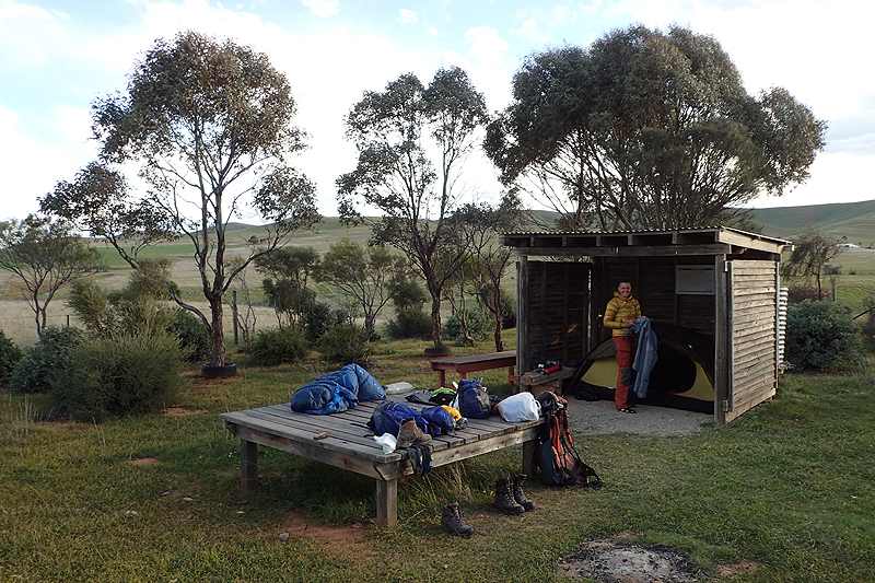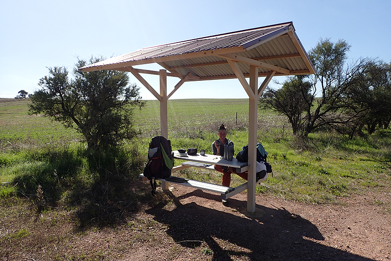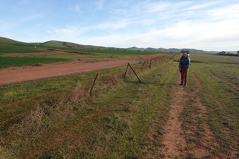 First stop today was Black Jack Hut to repair more leaks in my mattress. Black Jack is a sweet little hut, all enclosed from the elements with bunk beds inside. It has an hilarious toilet in that the walls look as if they exploded. The toilet just sits there, completely in the open with corrugated metal sheets lying all around on the ground. Looks like someone had a massive eruption! The rest of the day was "follow the fence" into the rolling hills towards Burra. I was really tired as we drew close to Wandallah Creek, we could see it in the distance but it took forever to get there. It was such a lovely campsite, fenced off within farmlands with just a small shelter, MPP and toilet. Care has been taken with the flora and many native plants have been planted and tended at the campsite so that what would have been quite bare pasture, is now a native garden. It reminded us of the Danish "shelter" campsites. As bad weather was forecast overnight we put the tent inside the shelter and it just fit. We have been lucky in that we have not had to share any campsite yet. Of course we often camp between sites, but even so, it would be awkward sharing a small site like this one as only one tent can fit under cover. First in, best dressed!