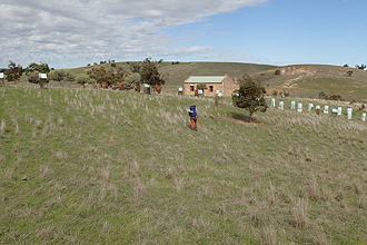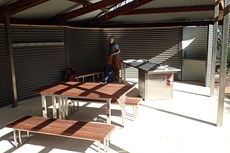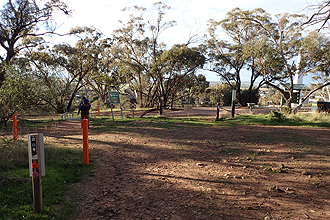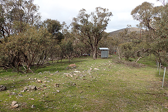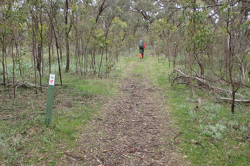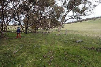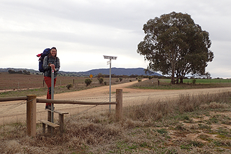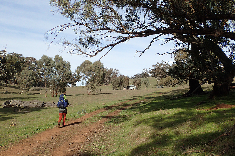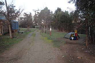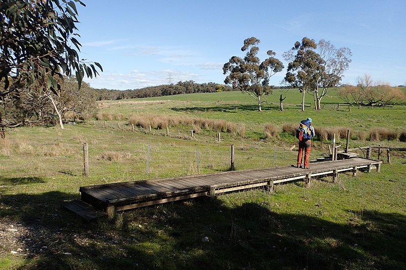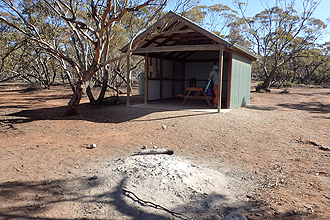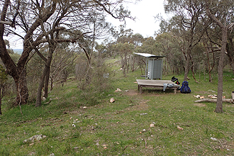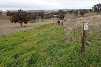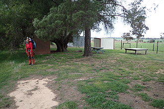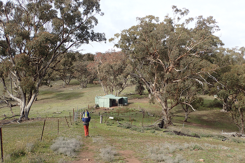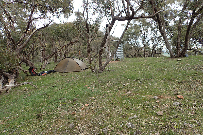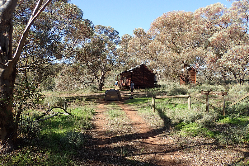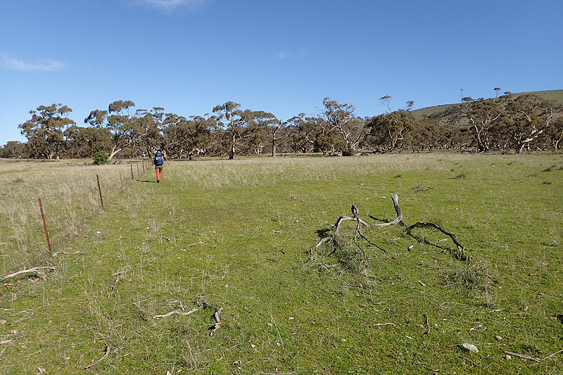 First stop today was Black Jack Hut to repair more leaks in my mattress. Black Jack is a sweet little hut, all enclosed from the elements with bunk beds inside. It has an hilarious toilet in that the walls look as if they exploded. The toilet just sits there, completely in the open with corrugated metal sheets lying all around on the ground. Looks like someone had a massive eruption! The rest of the day was "follow the fence" into the rolling hills towards Burra. I was really tired as we drew close to Wandallah Creek, we could see it in the distance but it took forever to get there. It was such a lovely campsite, fenced off within farmlands with just a small shelter, MPP and toilet. Care has been taken with the flora and many native plants have been planted and tended at the campsite so that what would have been quite bare pasture, is now a native garden. It reminded us of the Danish "shelter" campsites. As bad weather was forecast overnight we put the tent inside the shelter and it just fit. We have been lucky in that we have not had to share any campsite yet. Of course we often camp between sites, but even so, it would be awkward sharing a small site like this one as only one tent can fit under cover. First in, best dressed!