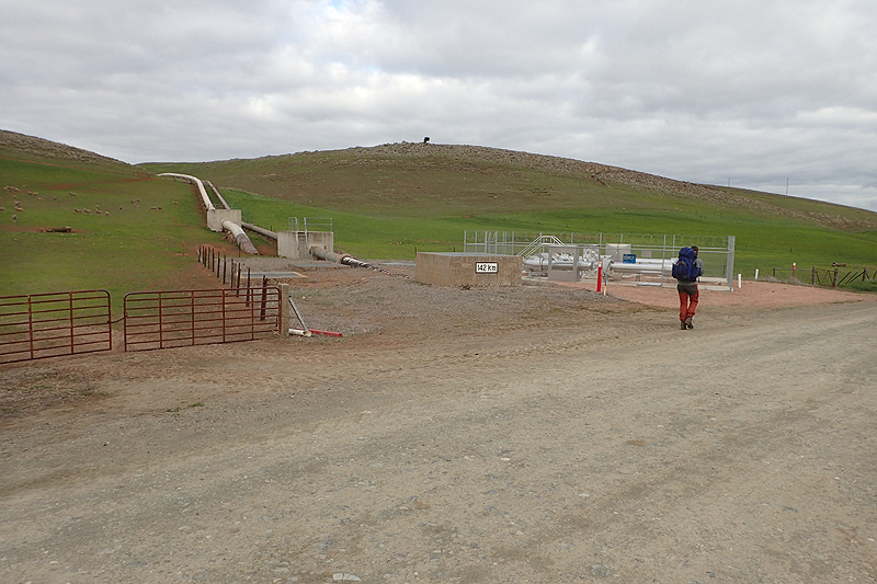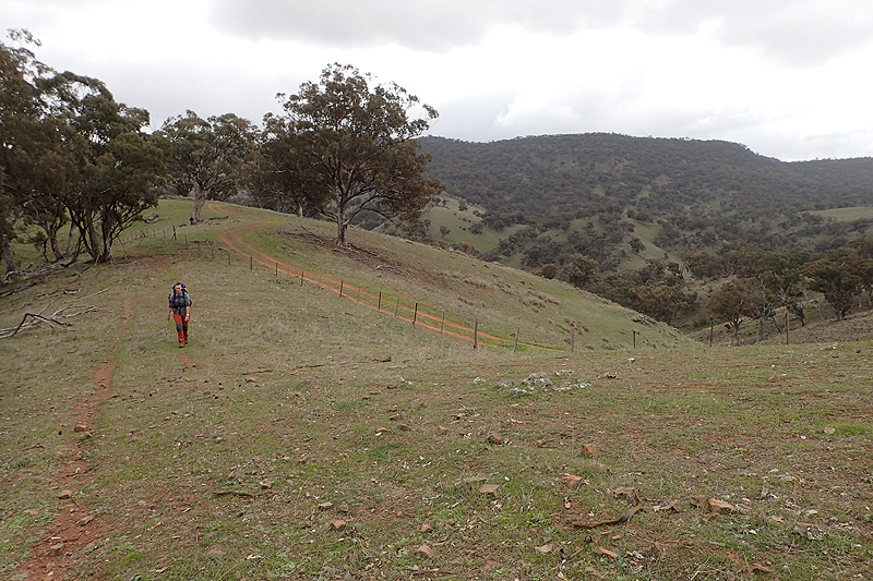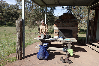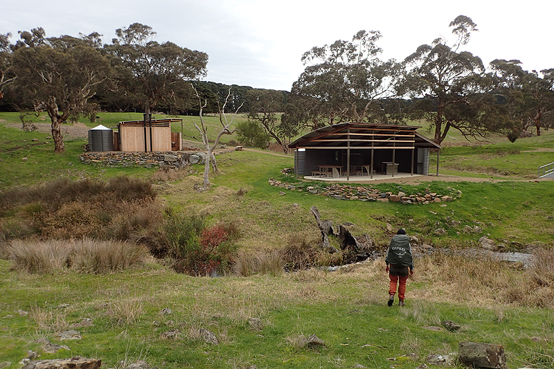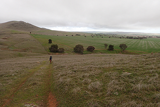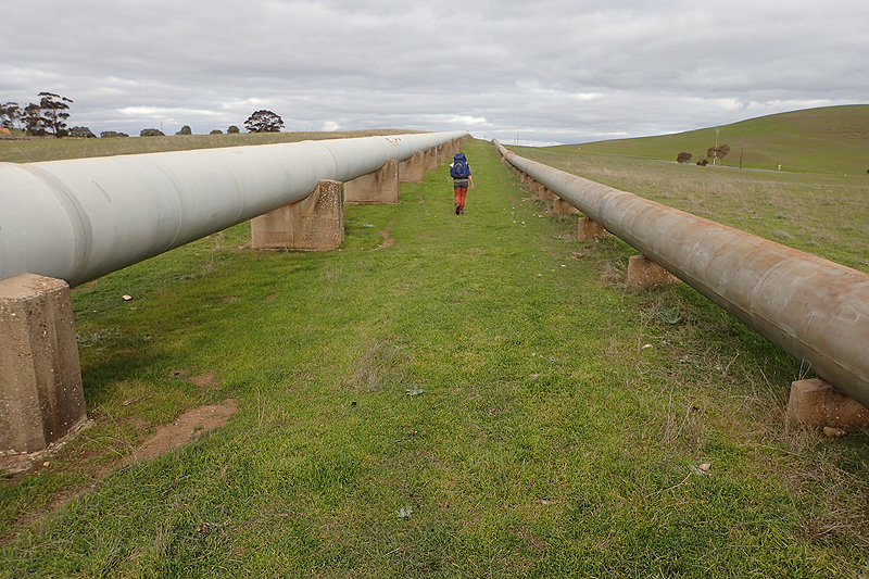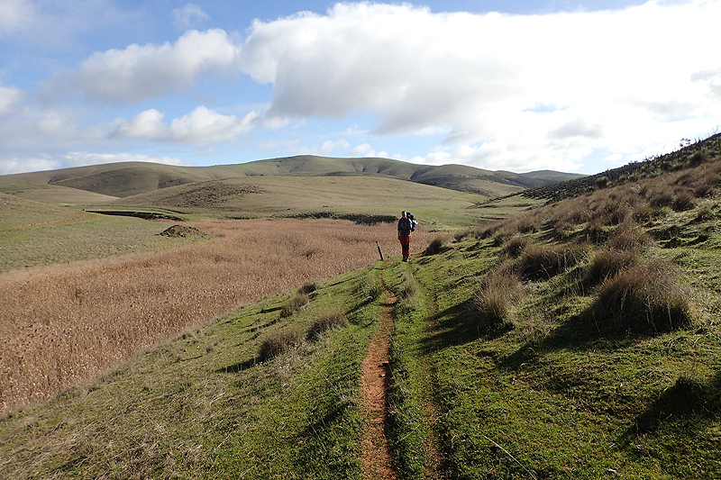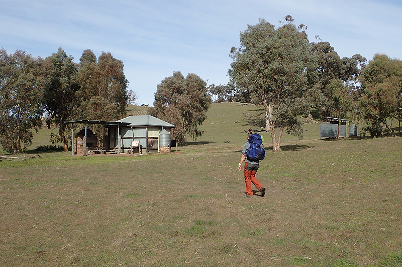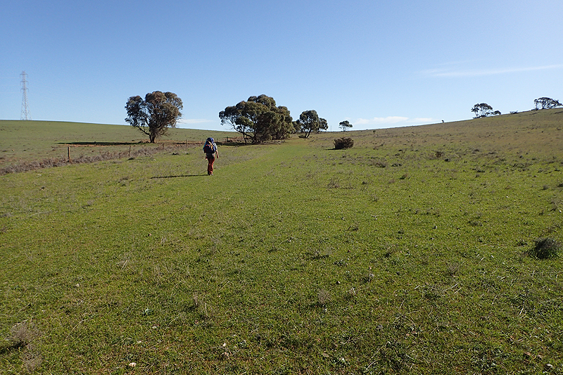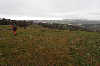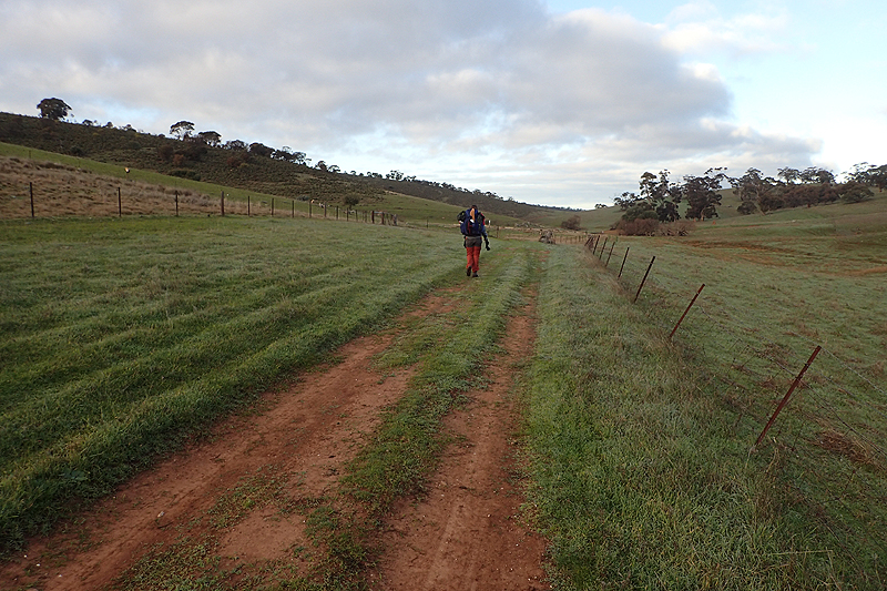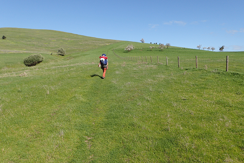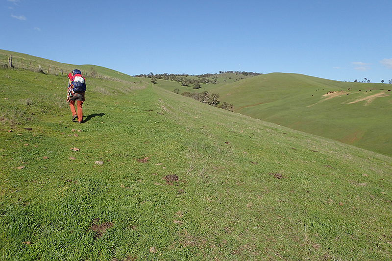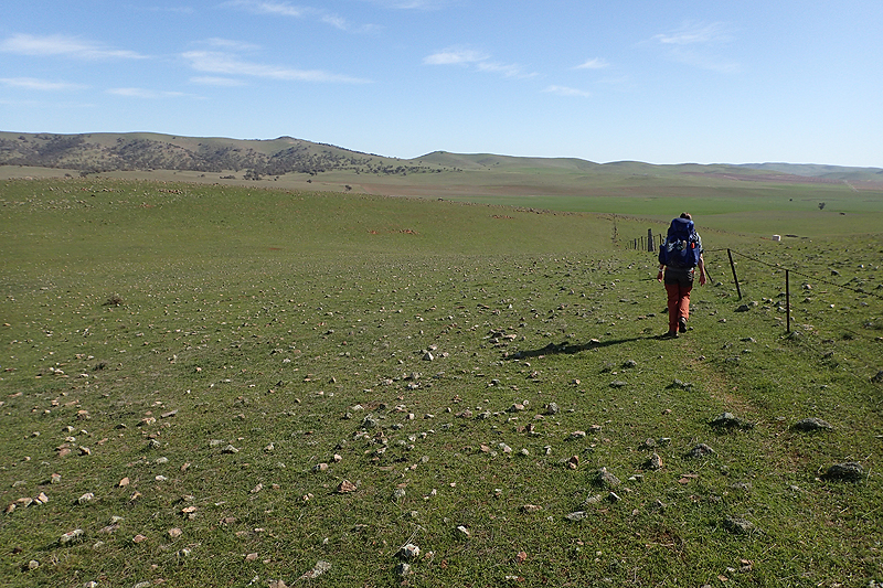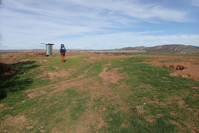 Beautiful walking today through reserves, farmland, passed water pipelines and up and over small hill ranges with great views. Everything so green. The walk gets better every day. We had a coffee break on top of some hills with an amazing view of the farmlands below. Shortly after setting off we met a northbound thruhiker from New Zealand who was walking 30 km days but did not recommend this as he spent all day walking and then it was bedtime. If you are on your own the temptation is just to keep going. He was a short man and as is always the case you sort of check out the other person's set up. He saw me doing this and said proudly, "4kg base weight!". We spent the rest of the day trying to work out how a pack, tent, cooking equipment, all your clothing and sleeping equipment can weight only 4 kg! There was a steep climb up the ridge and down the other side to Huppatz Hut. The weather was lovely today and we set up our tent in the grass behind the hut and relaxed. We enjoyed the walking a lot and were entertained by many sheep who we could hear calling to each other along the ridgeline.