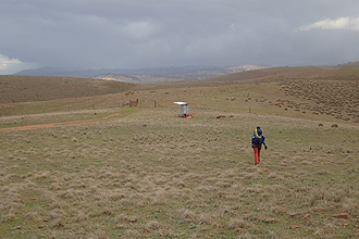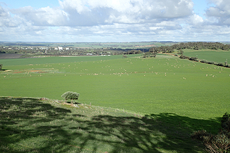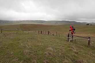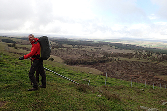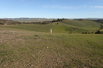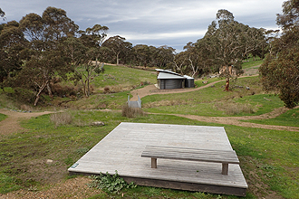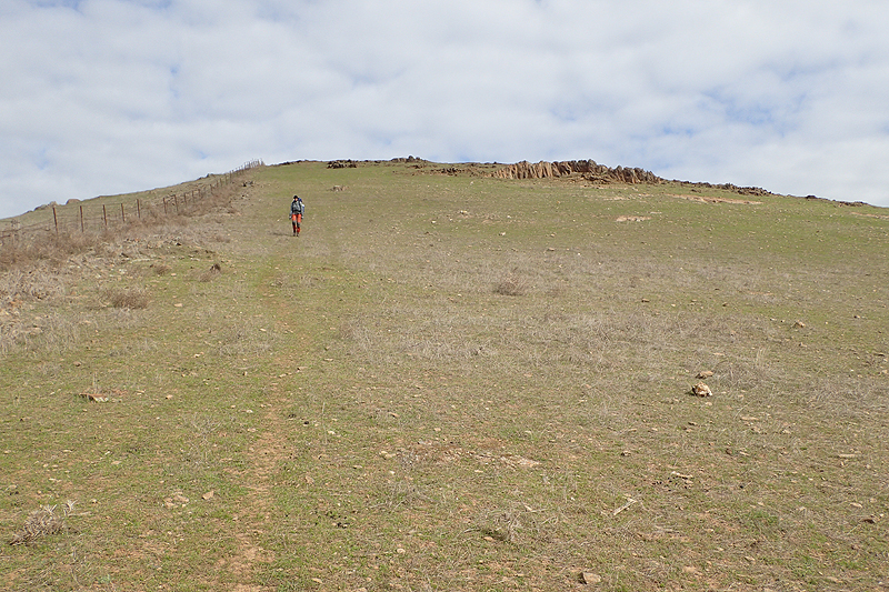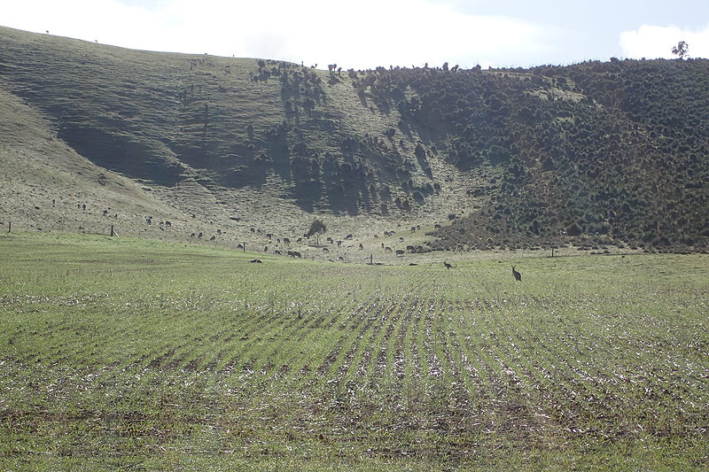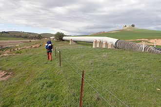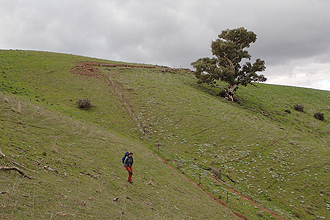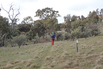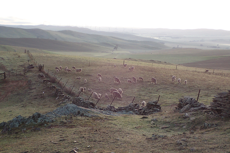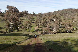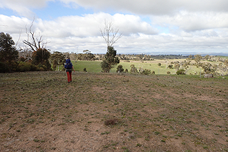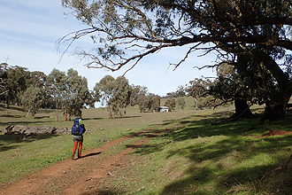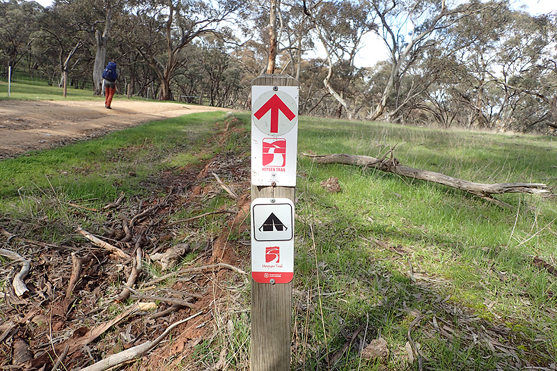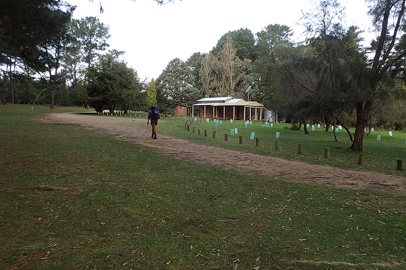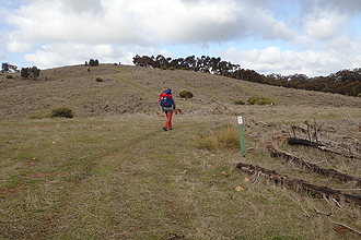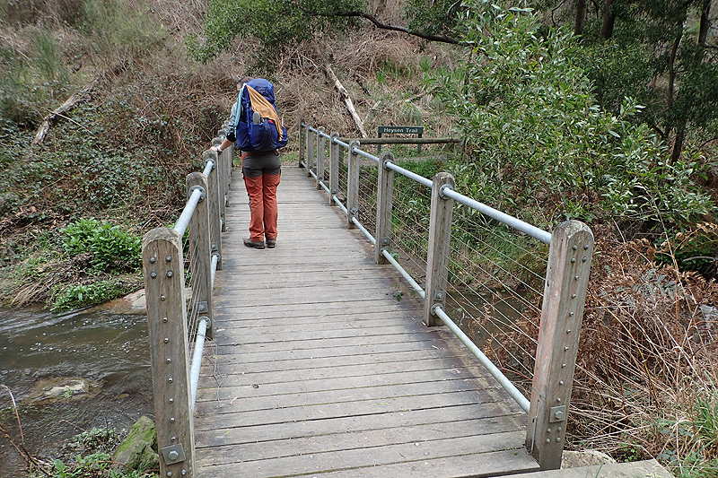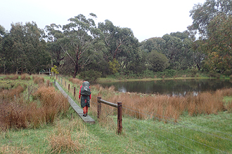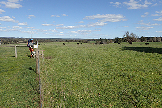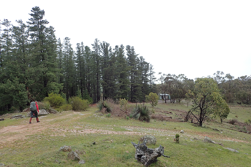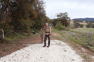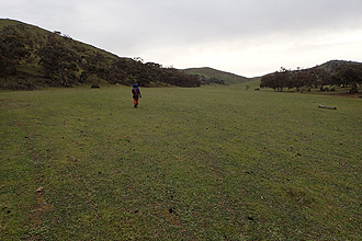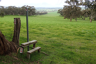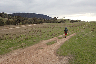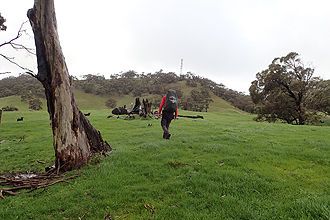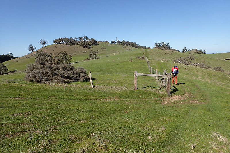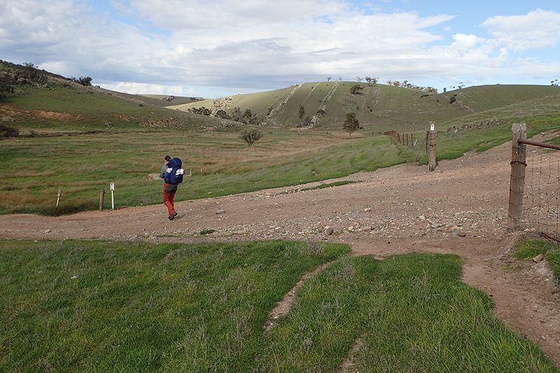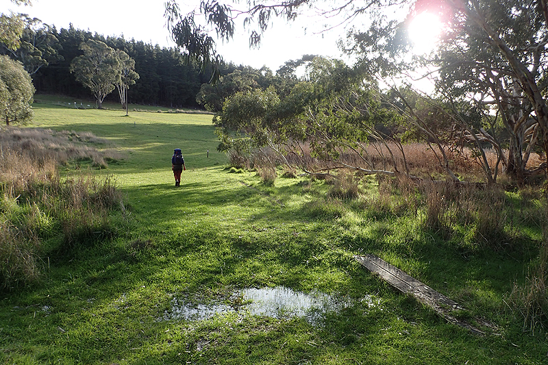 Beautiful walking today through reserves, farmland, passed water pipelines and up and over small hill ranges with great views. Everything so green. The walk gets better every day. We had a coffee break on top of some hills with an amazing view of the farmlands below. Shortly after setting off we met a northbound thruhiker from New Zealand who was walking 30 km days but did not recommend this as he spent all day walking and then it was bedtime. If you are on your own the temptation is just to keep going. He was a short man and as is always the case you sort of check out the other person's set up. He saw me doing this and said proudly, "4kg base weight!". We spent the rest of the day trying to work out how a pack, tent, cooking equipment, all your clothing and sleeping equipment can weight only 4 kg! There was a steep climb up the ridge and down the other side to Huppatz Hut. The weather was lovely today and we set up our tent in the grass behind the hut and relaxed. We enjoyed the walking a lot and were entertained by many sheep who we could hear calling to each other along the ridgeline.