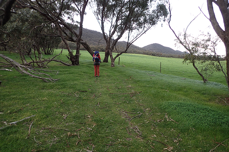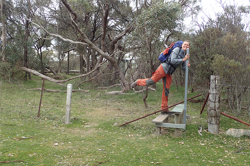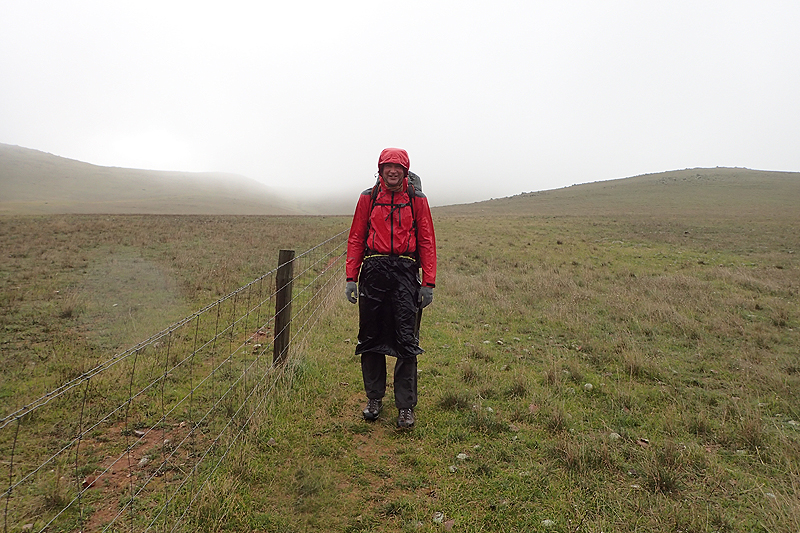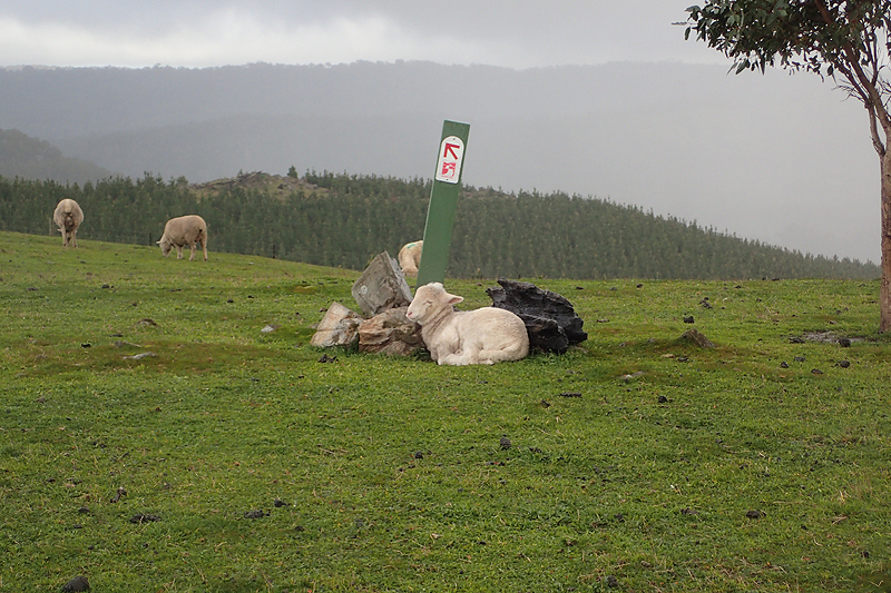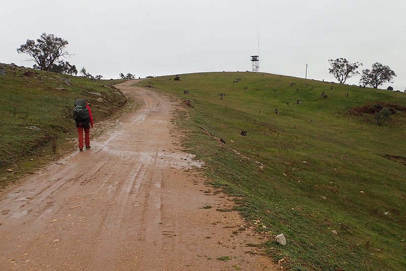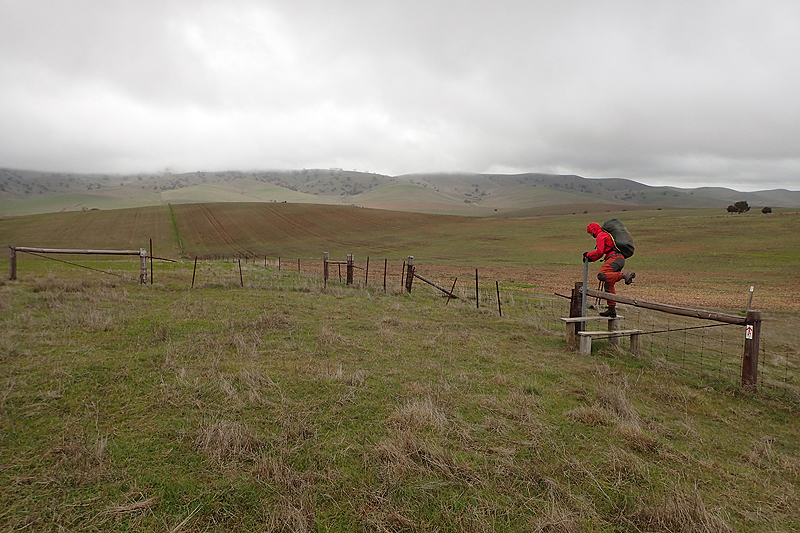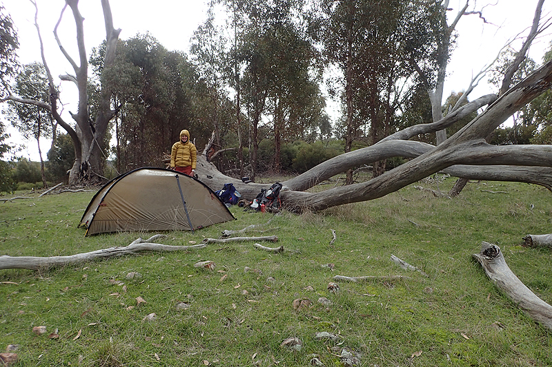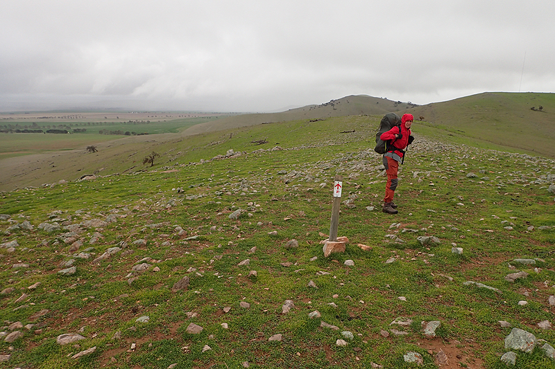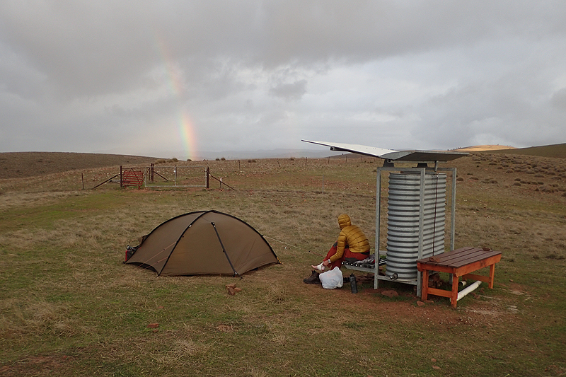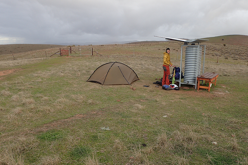 The climb up to Mount Brown was brilliant. On this trail, wherever it overlaps with a popular daywalk, it is so easy. You can just let your feet go without concentrating so hard on the ground! Yesterday if you looked up for a moment to admire the view you ended up arse over face, there was so much to trip you up. It was cold but also misty this morning and freezing on the summit where we had tea and what was to become our new teatime snack; dark fruit cake. We caught our first glimpse of windfarms way in the distance. We climbed down to Catninga Shed where some hikers overnight. Thereafter it was rolling hills, following that fence, up and down, up and down. Sheep staring down at you from up high! Took ages. Great views towards the end but it really dragged by so slowly. There was a cold wind all day and we felt pretty exposed. However, with that sense of exposure came expansive views and they were amazing. You did feel that you could see forever. As we drew near to Hawks Nest walk-in site, we met Shelby, northbound. She was hoping to get to Quorn tomorrow to take the Pitchi-Ritchi train, and had walked from Grays Hut this morning. She wore fabulous earrings! Just after we arrived at the wind battered Hawks Nest site and got our tent up, the rain came down!