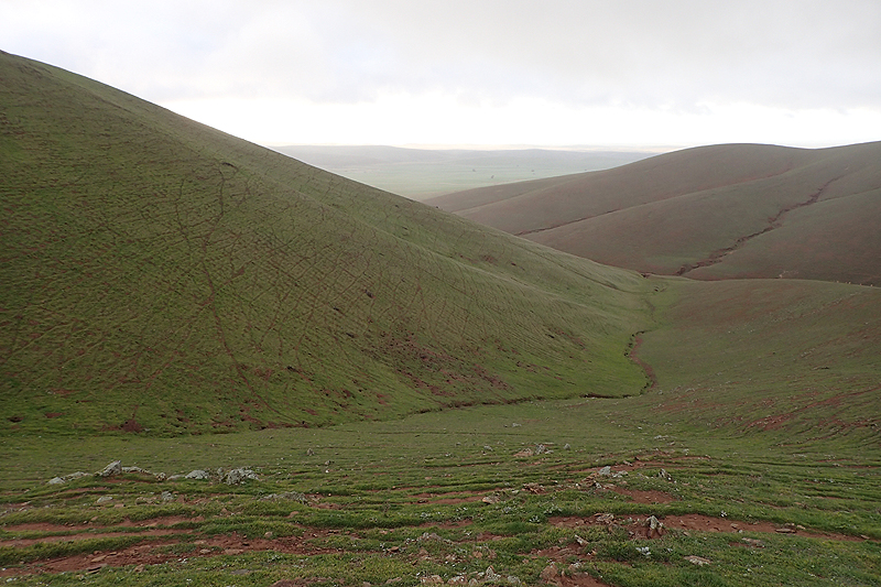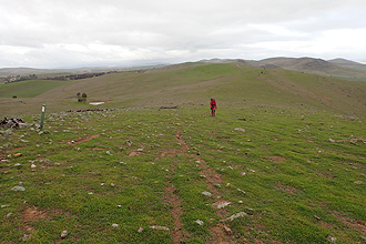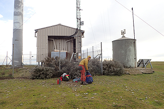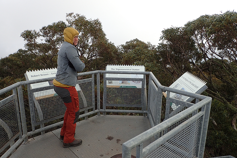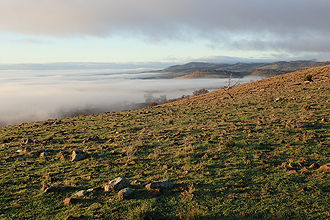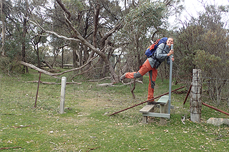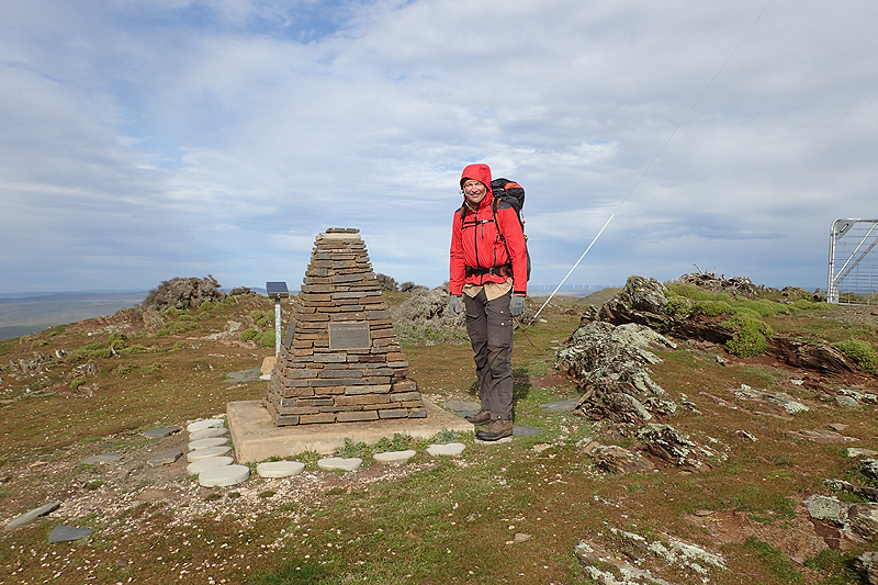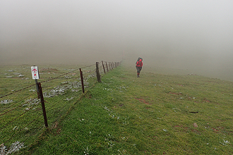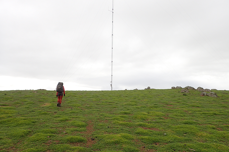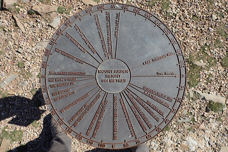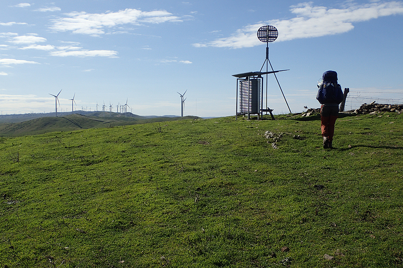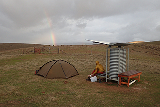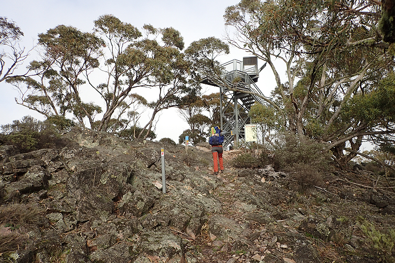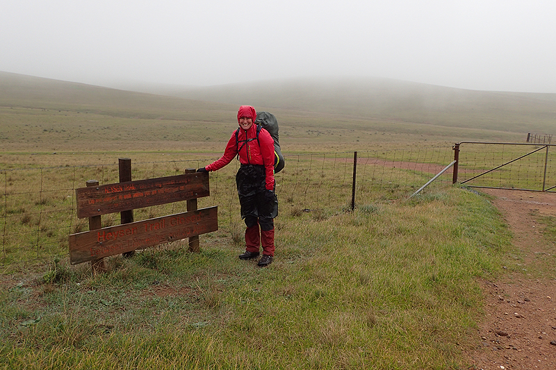 The climb up to Mount Brown was brilliant. On this trail, wherever it overlaps with a popular daywalk, it is so easy. You can just let your feet go without concentrating so hard on the ground! Yesterday if you looked up for a moment to admire the view you ended up arse over face, there was so much to trip you up. It was cold but also misty this morning and freezing on the summit where we had tea and what was to become our new teatime snack; dark fruit cake. We caught our first glimpse of windfarms way in the distance. We climbed down to Catninga Shed where some hikers overnight. Thereafter it was rolling hills, following that fence, up and down, up and down. Sheep staring down at you from up high! Took ages. Great views towards the end but it really dragged by so slowly. There was a cold wind all day and we felt pretty exposed. However, with that sense of exposure came expansive views and they were amazing. You did feel that you could see forever. As we drew near to Hawks Nest walk-in site, we met Shelby, northbound. She was hoping to get to Quorn tomorrow to take the Pitchi-Ritchi train, and had walked from Grays Hut this morning. She wore fabulous earrings! Just after we arrived at the wind battered Hawks Nest site and got our tent up, the rain came down!