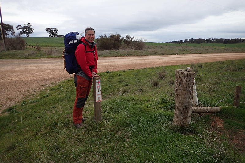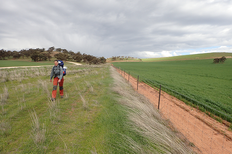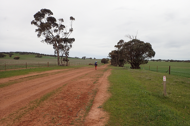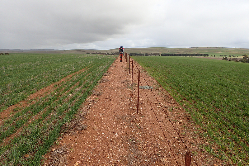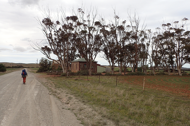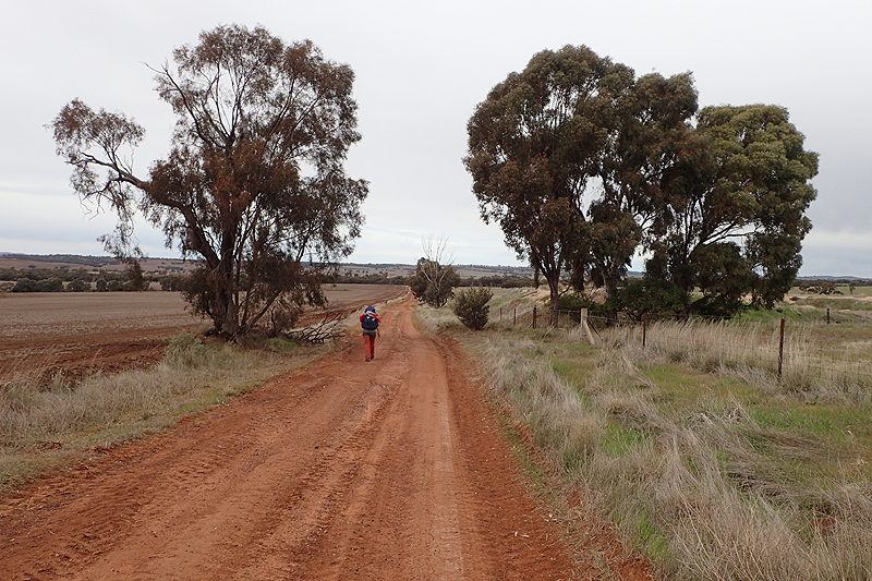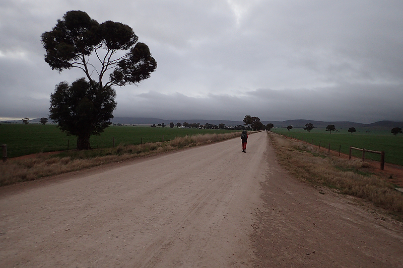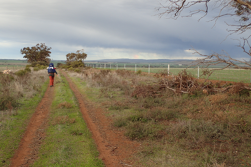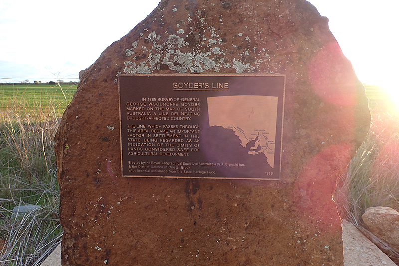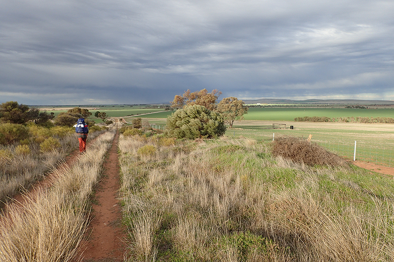 We had a really warm night last night, compared to the -11 deg C that they had had here the night before, which presumably so did we 4 km up the road at Bowman Hut. We knew the reason for this though and we could see it this morning, it looked as if some fairly horrendous weather was on the way. Massive brooding black clouds and high winds. As we walked out back through the town we saw that on the other side is a free RV park with facilities. This would be a good option for hiker campers as well. I think there were even showers there. It was nicely situated in a manicured town park with benches, etc. We left Crystal Brook behind us into the weather. On the road out of town we saw a little memorial and went to have a look. It was a memorial to Goyder. We first learnt about Goyder in Quorn but as the trail progressed we would often reflect upon him. It seems to us that this trail should really be named for him and not Heysen. He was surveyor-general of South Australia in the 1860's. This was a very important position and carried much responsibility. He determined the line of settlement as described by the areas made viable for crop farming by rainfall. This line runs east-west through South Australia, roughly from Murray Bridge to Ceduna. It runs through the area of Crystal Brook.