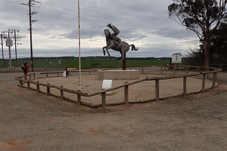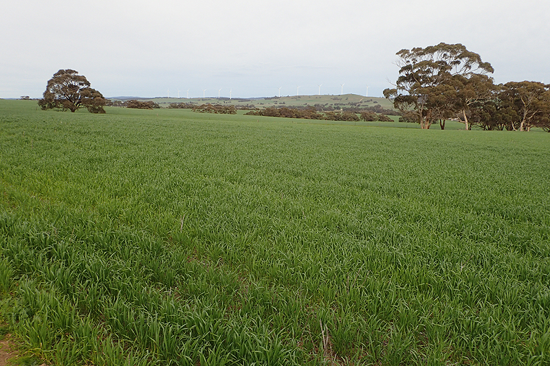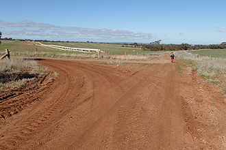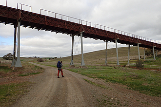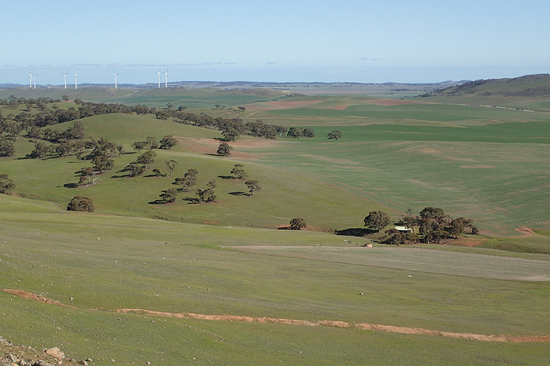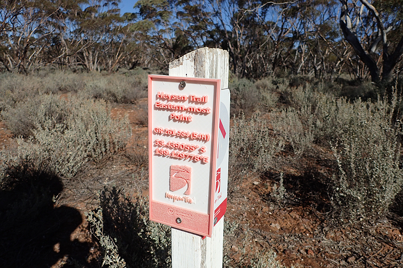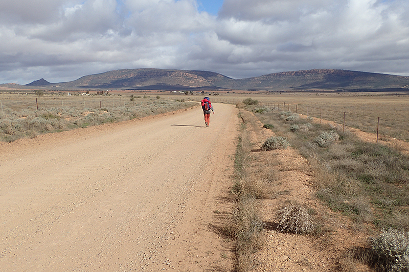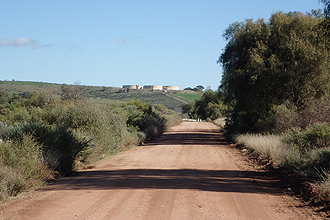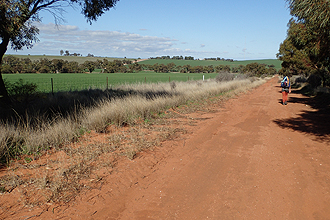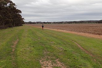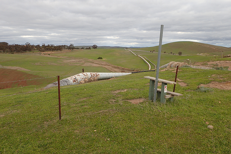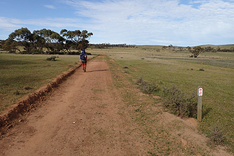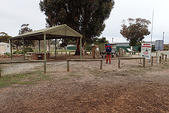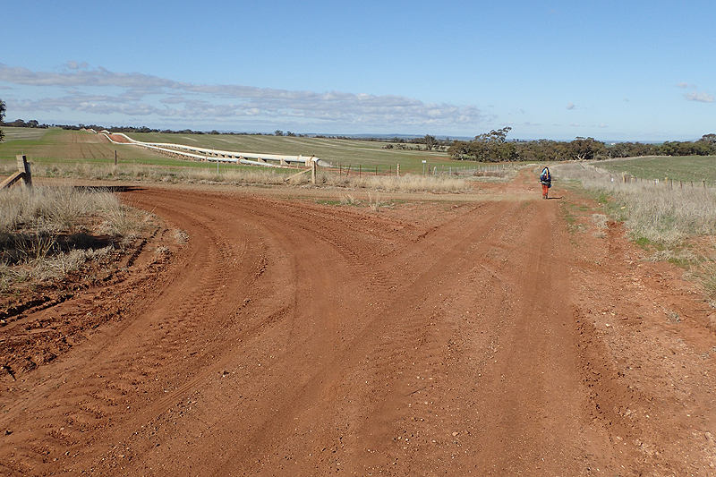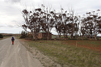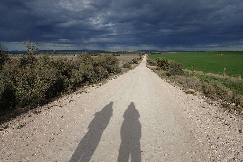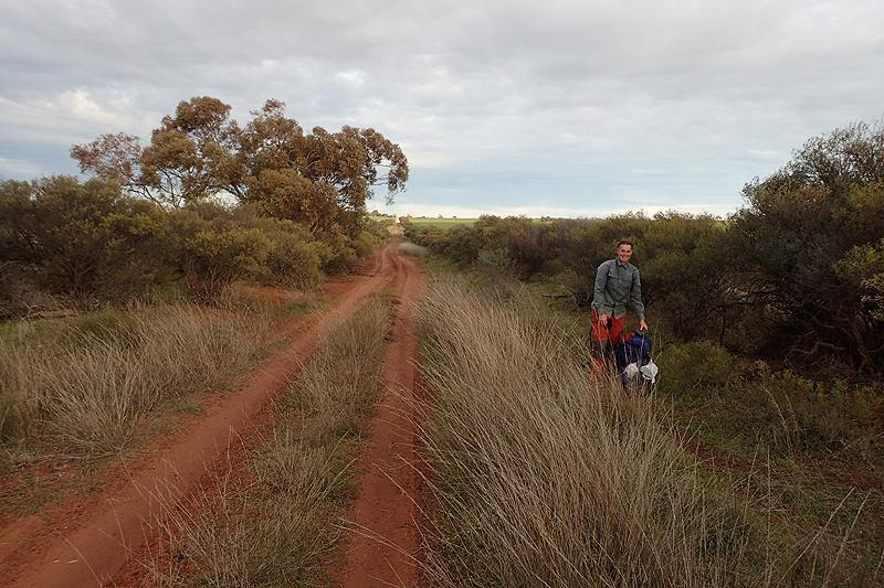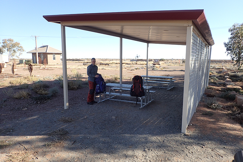 We had a really warm night last night, compared to the -11 deg C that they had had here the night before, which presumably so did we 4 km up the road at Bowman Hut. We knew the reason for this though and we could see it this morning, it looked as if some fairly horrendous weather was on the way. Massive brooding black clouds and high winds. As we walked out back through the town we saw that on the other side is a free RV park with facilities. This would be a good option for hiker campers as well. I think there were even showers there. It was nicely situated in a manicured town park with benches, etc. We left Crystal Brook behind us into the weather. On the road out of town we saw a little memorial and went to have a look. It was a memorial to Goyder. We first learnt about Goyder in Quorn but as the trail progressed we would often reflect upon him. It seems to us that this trail should really be named for him and not Heysen. He was surveyor-general of South Australia in the 1860's. This was a very important position and carried much responsibility. He determined the line of settlement as described by the areas made viable for crop farming by rainfall. This line runs east-west through South Australia, roughly from Murray Bridge to Ceduna. It runs through the area of Crystal Brook.