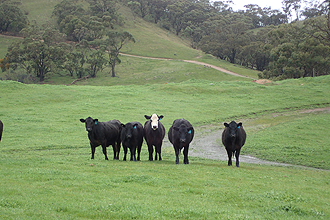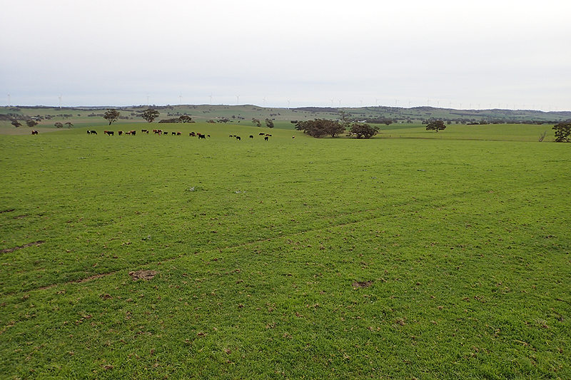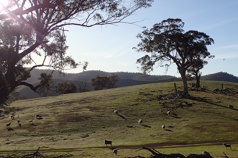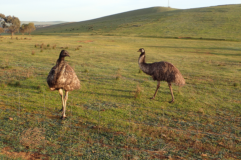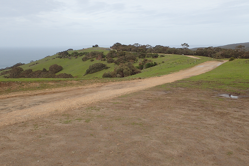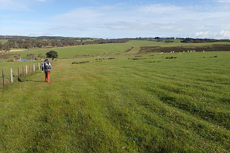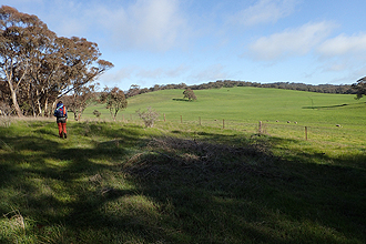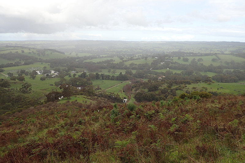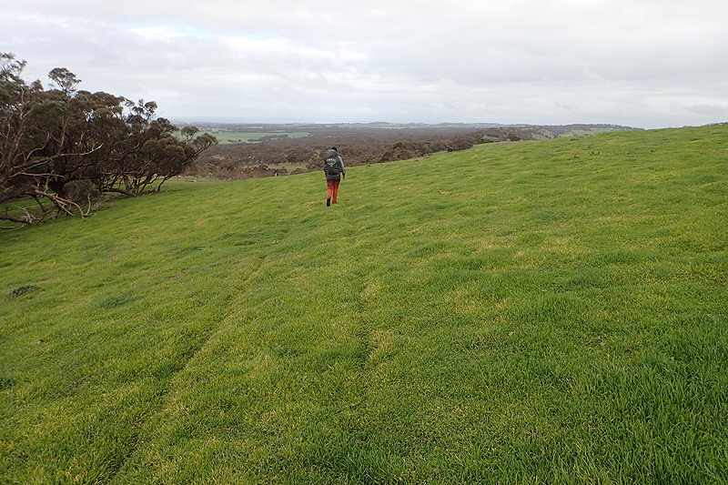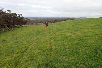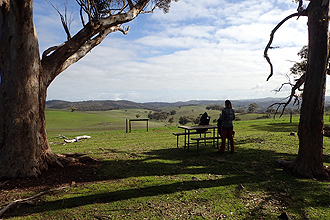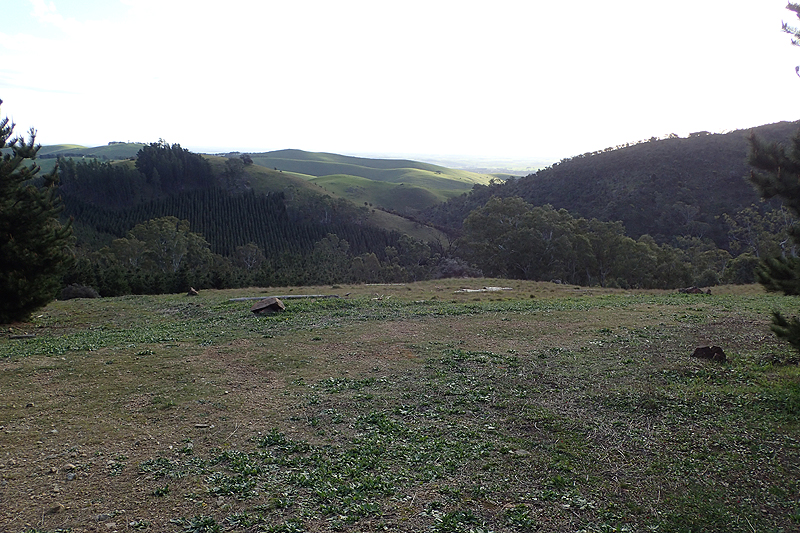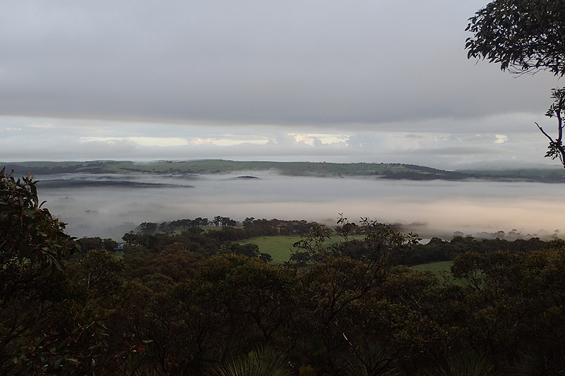 Leaving Yulte the mist lay thick in the valley once more. We had some road walking as we passed the Heysen Rest B&B where many hikers stay. As we left the road to go back into rolling hills we reached the 1000 km mark and enjoyed a lovely bench to sit on as congratulations! We reached Inman Valley where we had a meal sitting at the bench in town. The general store was closed although it was not supposed to be, but we weren't planning on shopping anyway. Walking up the road afterwards we met a farmer who was very enthusiastic about our walk and told us that we would walk through their farm in a few minutes and also at Balclutha along the south coast, which we thanked her for! When we entered her farmland it was late afternoon, the light was marvellous and the animals so beautiful and peaceful. We have been noticing that as we have moved further south the sheep are not quite as alarmed by us anymore and don't head for the hills when they see us. At first we thought this was due to them being shorn, maybe it calms them down or something. Then we thought maybe it is a different breed of sheep and has a different nature. We know what a merino sheep looks like, which were common around Spalding and Burra but could not name many other breeds on sight. Then we thought it might just be different farming practices, perhaps these sheep are more used to having people around? The farmers are more hands on? We have no idea. But this farm, the animals were in pristine condition and the entire operation seemed polished and cared for. There were signs up for walkers explaining that lambing was going on and to give the ewes and lambs a wide berth which we always did anyway. It felt like paradise. A bit further on there were cows and a herd of quite young angus cows which came running to see us and were as playful as puppies. Bit nervous that the fence might not hold them! After walking through the farm we entered another SA Forestry site with a reroute, poorly signposted once again. We had a great walk through it until we got to the locked gate right opposite the Heysen site we were headed to. Nothing for it but to clamber over the gate. Robinson Hill walk-in site was a really nice one with lovely views.
