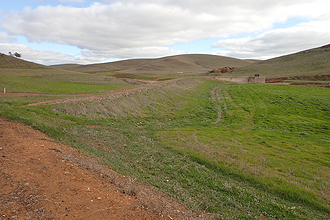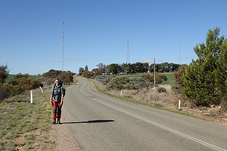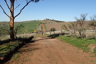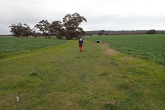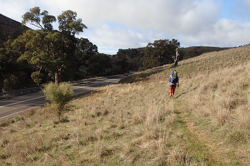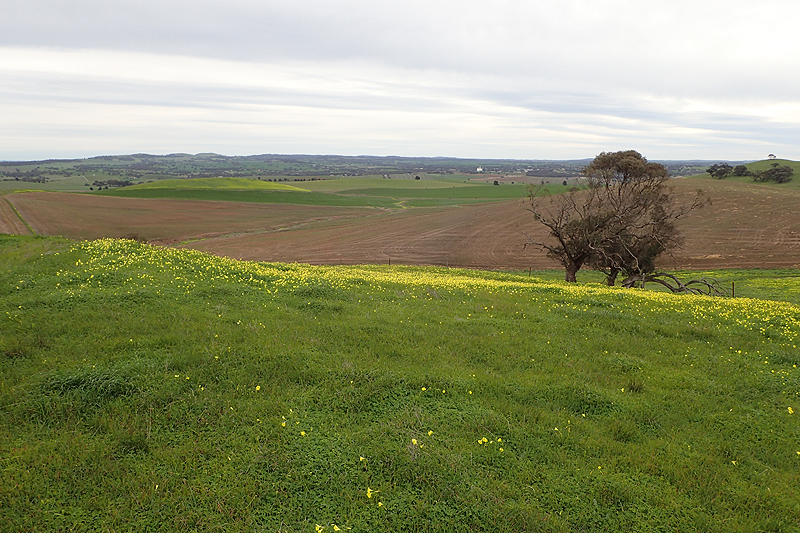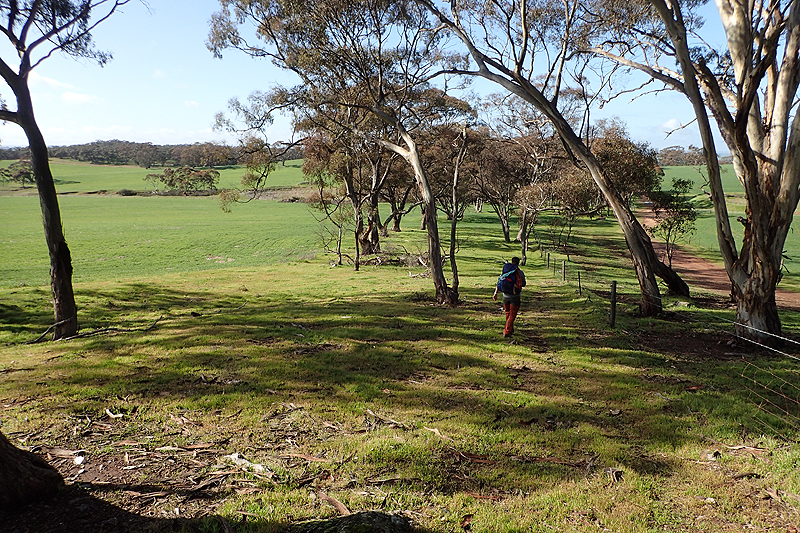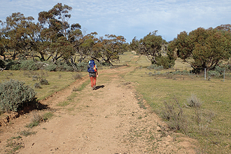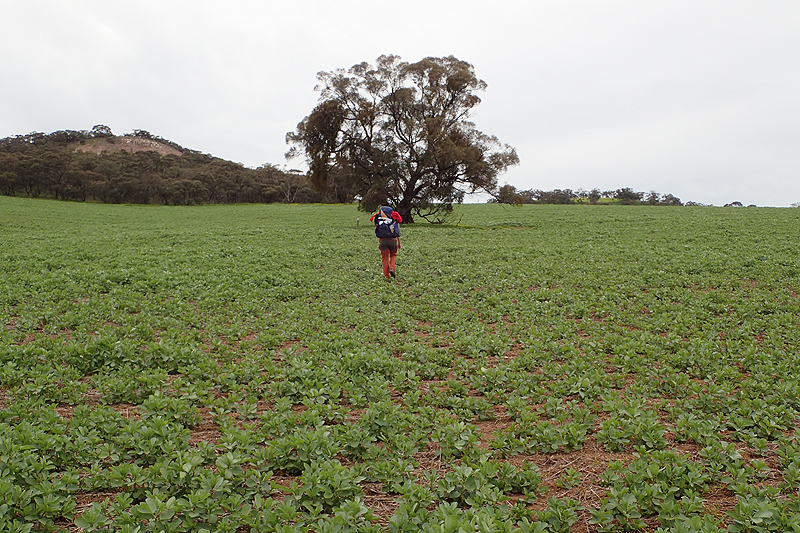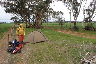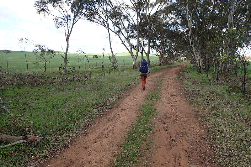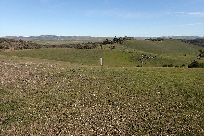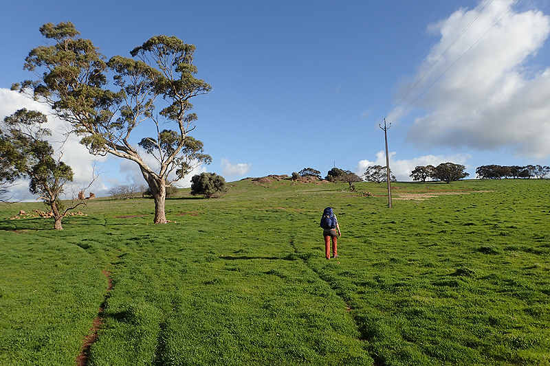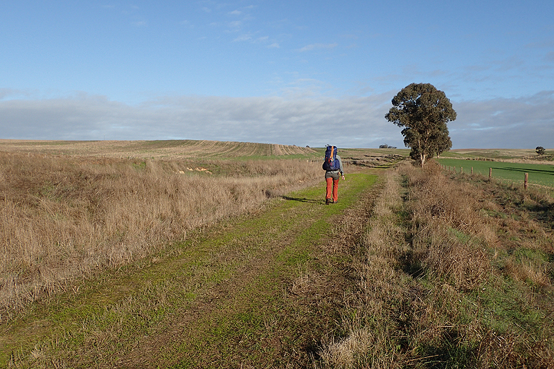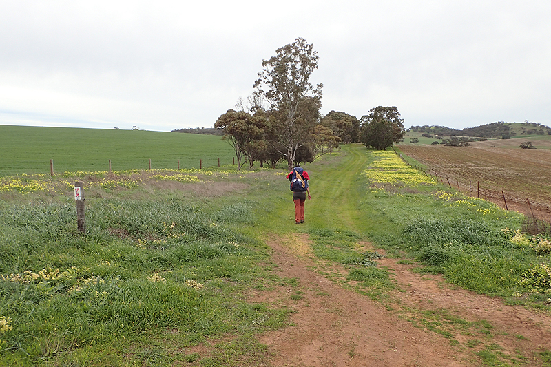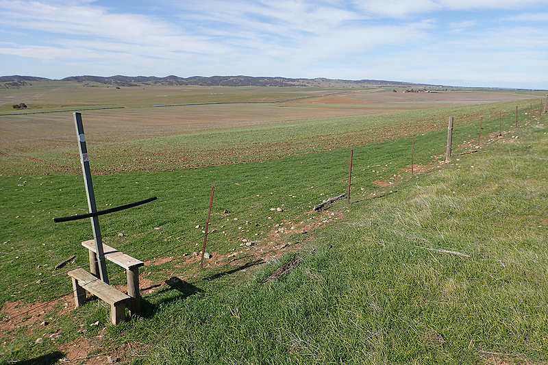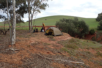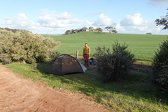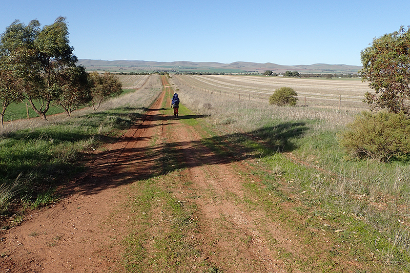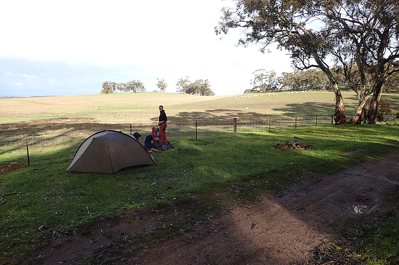 We inched towards Kapunda through busy farmlands. There was an unexpected detour today with access through a farm being removed due to biosecurity risks. I got electrocuted by a farm fence, it's a wonder it hasn't happened sooner. My hand brushed the wire and it just felt as if it had been hit hard with something very heavy. I lived to tell the tale. We had a long rest at Lights Hummock Heysen site. Walking down from it we went by the exact spot where we had camped last year when access to this site was closed as the trail was not open for the year yet. We crossed a lot of farmland after this and worried about finding a place to camp, but from the vantage point offered by the farmlands we could see the road below where we could pitch the tent between some large bushes. Perfect campsite. A local famer drove passed and gave us a wave. We camped a few kilometres short of Kapunda.
