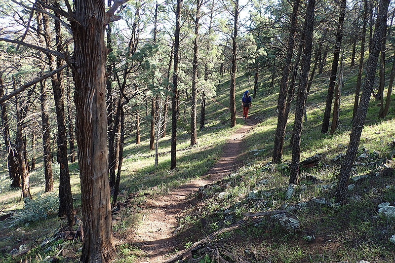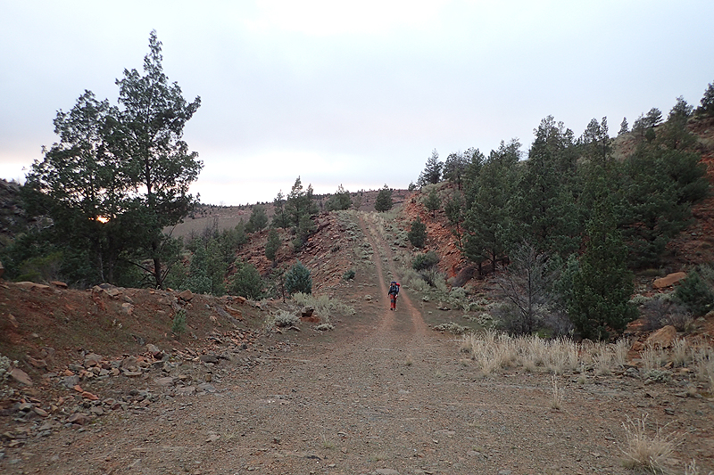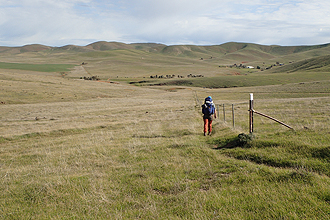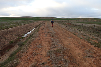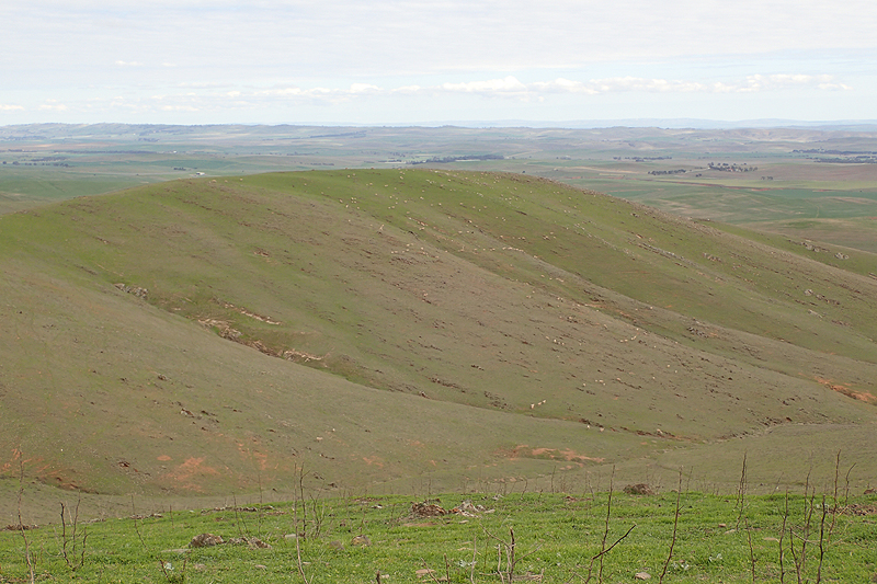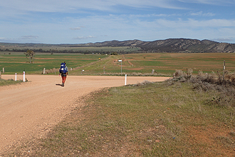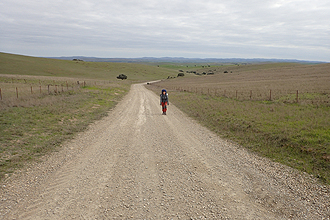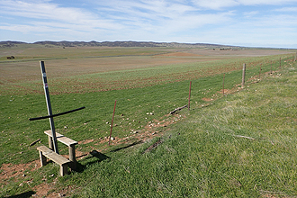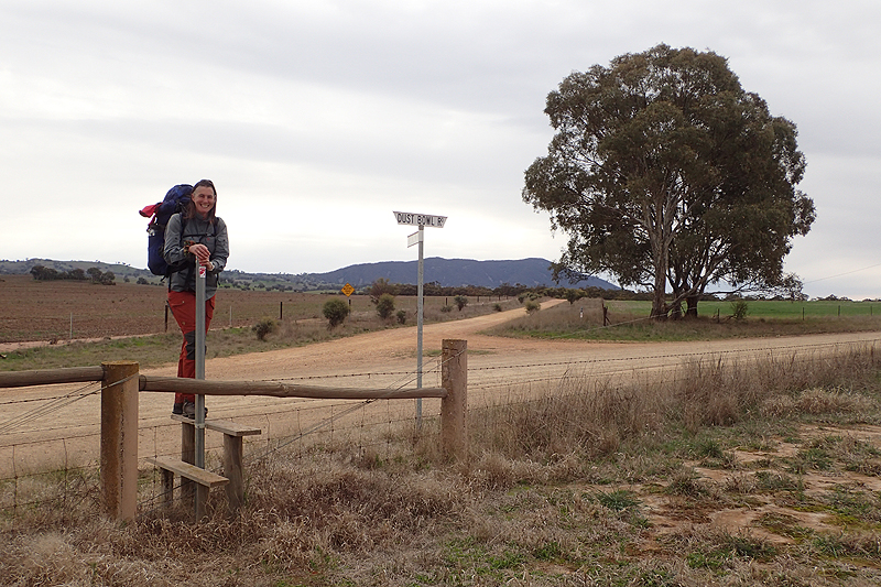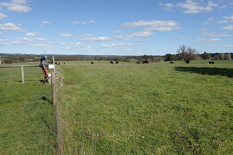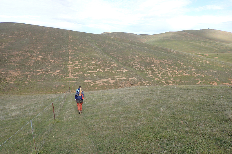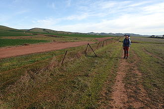 Great excitement to see our first herds of cows. This is an indication that the landscape is changing and flattening out as cows are not farmed in as hilly an area as sheep are. We are really just enjoying the walk each day and picked up water at Smith Hill, eventually stopping to camp along Aunt Sues Road. A ewe and her lamb had escaped from the rest of the herd and were rushing up and down the fence along the road easement to try to find their way back in. Eventually they gave up and stood watching us setting up our tent. Then they just lay down and went to sleep. They seemed pretty content with us being there.
