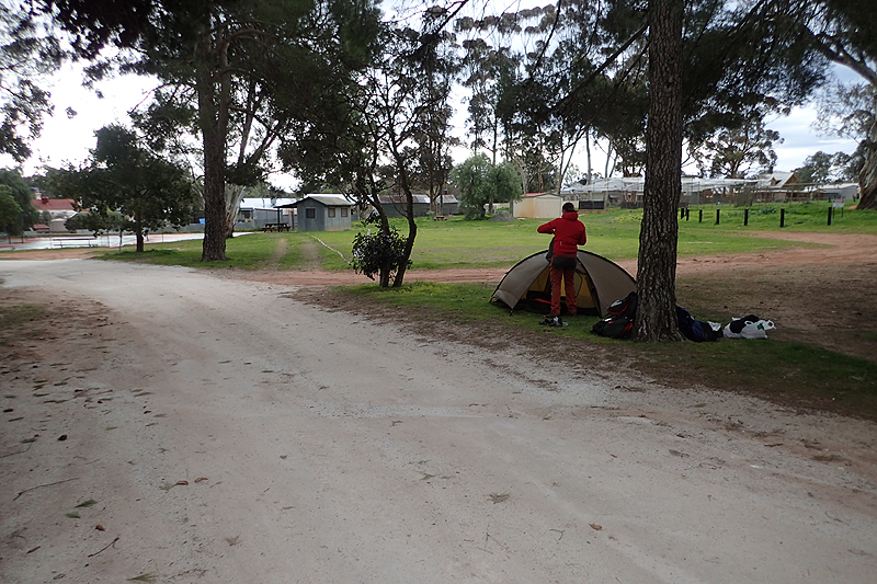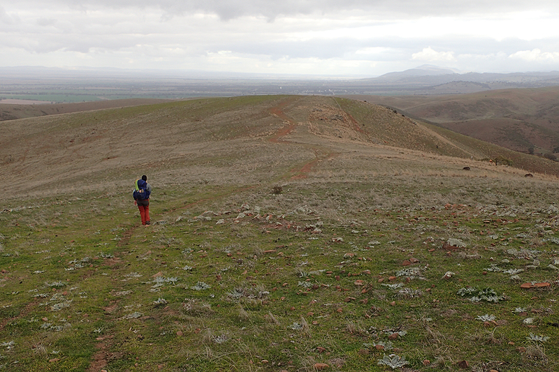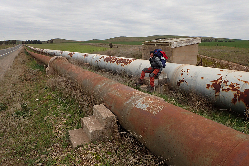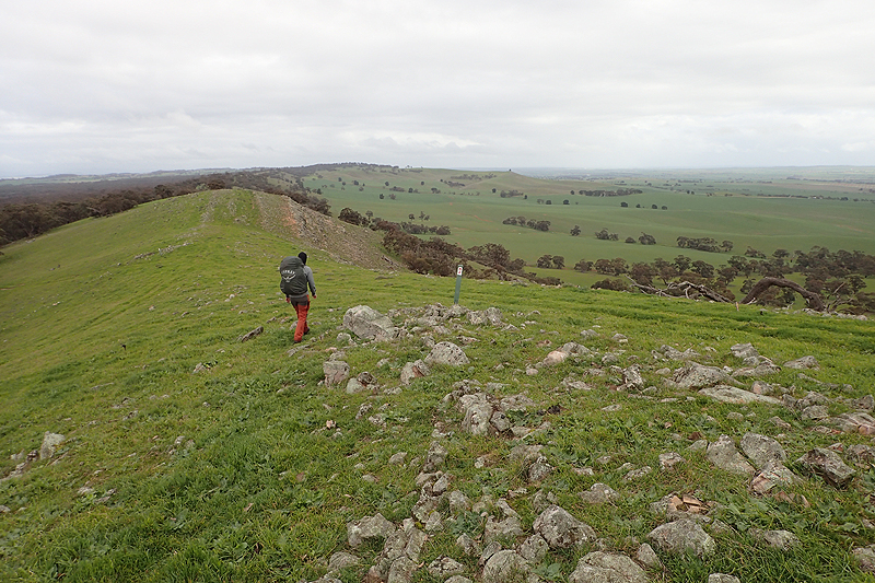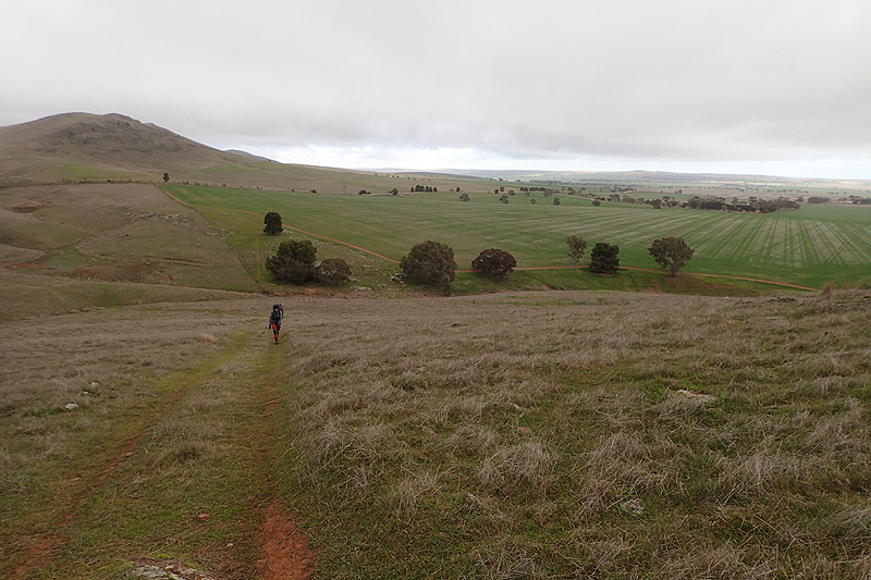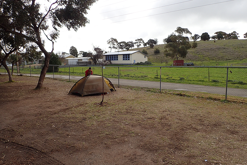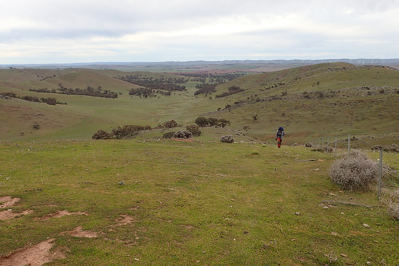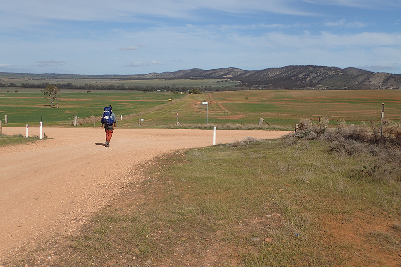 Spectacular sunrise and marvellous views of the land below. The climb down Mt Remarkable was as good as the climb up and then we were in Melrose which was freezing and full of families with little kids, all on bikes; Dad's cycling to pick up cappucino's on the main street. Must make what they paid for their flash bikes and gear worthwhile! We shopped at the supermarket which was fine for resupply to Crystal Brook. It was a lovely walk from there to Murraytown, along the way we experienced our first "road easements" which would become a regular feature of the hike from here on. These are basically corridors of land quarantined from adjacent farmlands that are for public access. They are usually roads or tracks. They uniquely facilitate a thru hike without trying. The Murraytown campsite was perfect and we were encouraged to set our tent up inside the undercover area which was a bonus as the first rain of the trip so far fell overnight! It is amazing that a little dot on the map like Murraytown, without any services has a community group with the energy and enthusiasm to attract visitors to it. Strangely, sleeping on a perfectly clean and polished concrete floor, my Nemo mattress punctured overnight and had to be fixed first thing. The hole was easily found and repaired. I knew it would be all downhill from here.