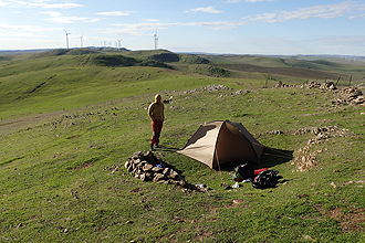 Whistling Trigg Tank - I haven't heard of any hikers yet who look forward to this campsite! As the name suggests, you are likely to be blown away here. The walk to it was great, wide open expansive views of windfarms and sheep farms. We chased a group of 5 rogue sheep to the very end of the Linear Reserve and when we had trapped them at the last gate they seemed completely flummoxed, until they suddenly realised they could backtrack and so fled all the way back in the other direction. We met a lone hiker who had started at Hallett to walk to Parachilna and complained bitterly about Whistling Trig. We were accompanied all the way there by sheep and the wind. We love the sheep for their entertainment value. We came across an upset lamb bleating away at its mother who was having a lie down. Who could blame her? Until Mike noticed that she was kicking her little feet in the air trying to get herself back onto them on the steep hillside. He went over to her and gathered her woolly back under his hands and pushed until she was flipped onto her feet and dashed away to find her baby. Whistling Trig has only a tank, the bench is sort of broken. The views from up there are remarkable. There are stonewalls in this area and on the other side sheep gathered. We walked on a few hundred metres and found that someone had constructed a semi-circular stone wall around a small dip. It was just enough to drop out of the wind a bit and Mike set about putting the tent up in as bombproof a manner as he could, using all guy ropes and pegs, including two very heavy duty pegs we had bought in Quorn. This was why we had them. One problem we had with the tent is that the dust is causing the outer tent zip on my side to fail and so we have tried to stop using it for the meantime and I get in and out through Mike's vestibule. This was helpful in the wind as my side was the windy side. We had a good night up there. The tent did a great job.