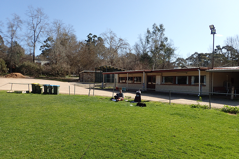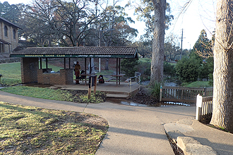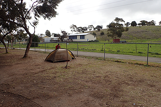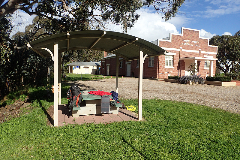 One glance at the sky today would tell you what side of the Line you were on! It was dramatic and we could see rain falling all over as the weather moved through the hills. We remained dry however. The farmlands were now a mix of pastoural and cropping, and herds of sheep grazed all over. We like sheep a lot and we like farms too so this was shaping up as the perfect walk for us. We had lunch at Hiskies Hut set gloriously amounst the green rolling hills. We saw pools of water in river beds for the first time on the trail. After Hiskies Hut it was a short walk to Georgetown. We weren't sure where we would camp there, only that we wanted to shorten the next day when our luck would run out with the weather. We were surpised and impressed to find camping available at the Memorial Park, where there was lush green lawn and a small parking area for vans. Pristine toilets and a shower ($1 a pop for a hot shower, but of course we had no change and no means of getting any, so a cold shower would have to do). Georgetown is only a village with no real services. There is a pub that many Heysen walkers stay at but it seemed closed. Must have opened up later though as we heard tell-tale raucous sounds. We were impressed by the effort made by Georgetown.