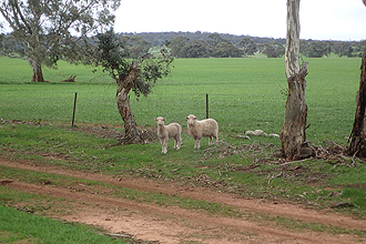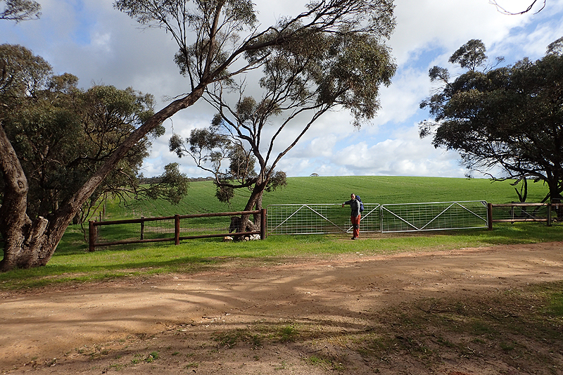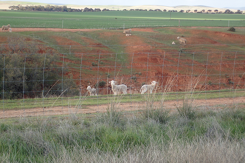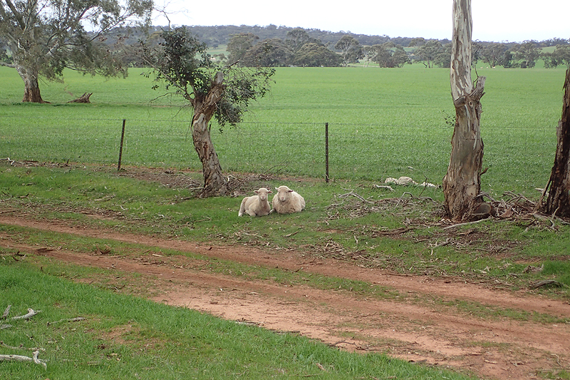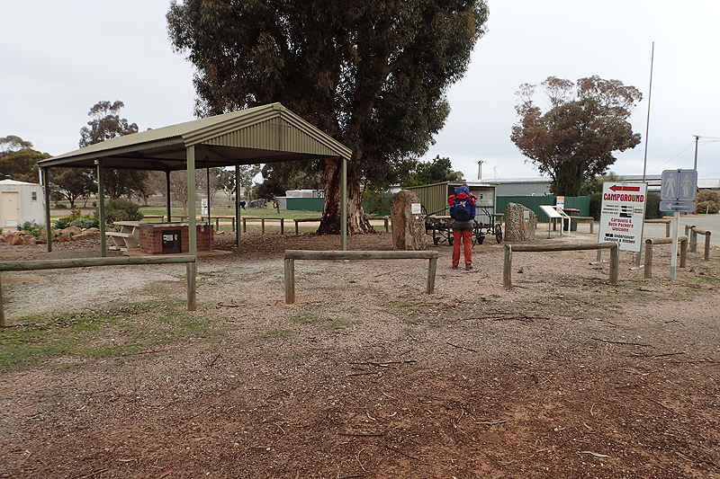 Track walking again today through farmland. It is very peaceful walking across farmland and we enjoyed it. First stop was Marabel where there is a Heysen site at the rodeo ground. Tiny village with a beautiful memorial park which tells the history of the area with a tiled artwork. These villages always surprise with the effort they go to. There was an electric power point at the park too. It was a pretty blustery day and we did not know when the rain would arrive. Luckily for us it hit hard when we were safely inside Marschalls Hut where we stopped for lunch. We spent a bit of time there as the rain hammered the roof. It was a lovely hut. We then walked on, our route crossing the Mawson Trail which we rode last year. We camped on a road easement and as usual were amused by sheep antics. There was a flock of sheep on one side of the fence and of course a lamb on the other side who was running up and down, up and down, trying to find away to get back to its flock. We witnessed time and again that a sheep or lamb or group of sheep would somehow get through a hole in a fence or something and then they cannot figure out how they did it so can't get back. Anyway, lamb was running up and down the fenceline which was a way away from us through the centre of the paddock. The rest of the flock stood on the other side making encouraging noises. Eventually Mike could not stand it any longer and hopped the fence, walking towards the lamb expecting he would try to pick it up and toss it over the fence. Well, the lamb got such a fright that he miraculously squeezed his way through the fence in an instant. Who knew that only a little motivation would solve the problem! We then watched another sheep crisis underway. The flock of sheep was milling around in one paddock. Adjoining it was another paddock with the gate in between open. A larger flock came over the hill and got to the open gate, but then they just did not know what to do. They seemed reluctant to go through the open gate and a few of them tried but sort of froze at the last moment. Until one brave ewe walked up to the opening with her lamb and then leapt through the opening, giving a joyous little twist as her hooves left the ground just at the opening. It was as if she feared that at the last moment a fence would appear to trap her, or the gate would jump out and grab her. It was so funny. We love sheep but suspect that they are very stupid.