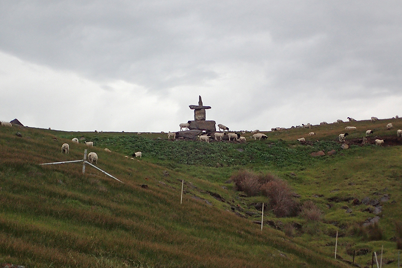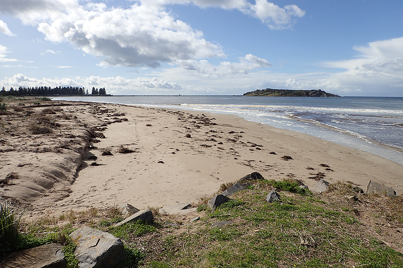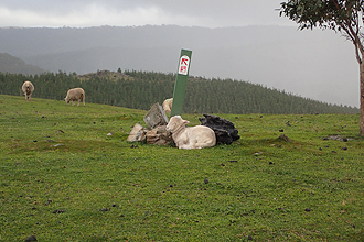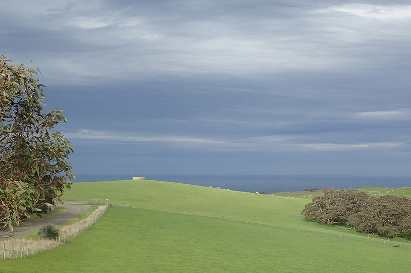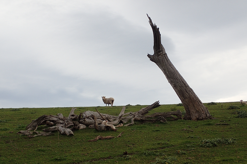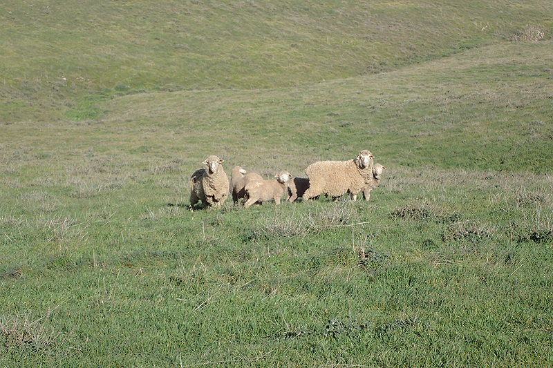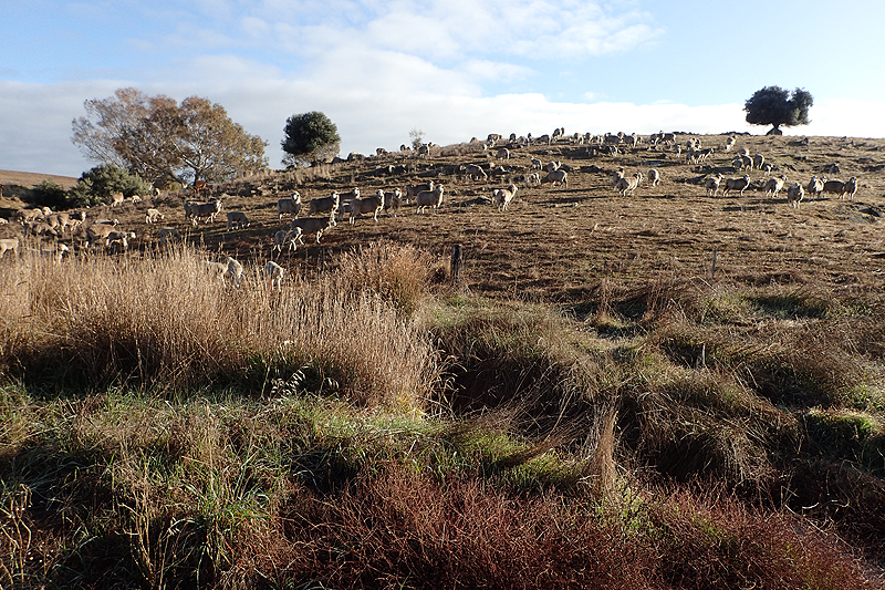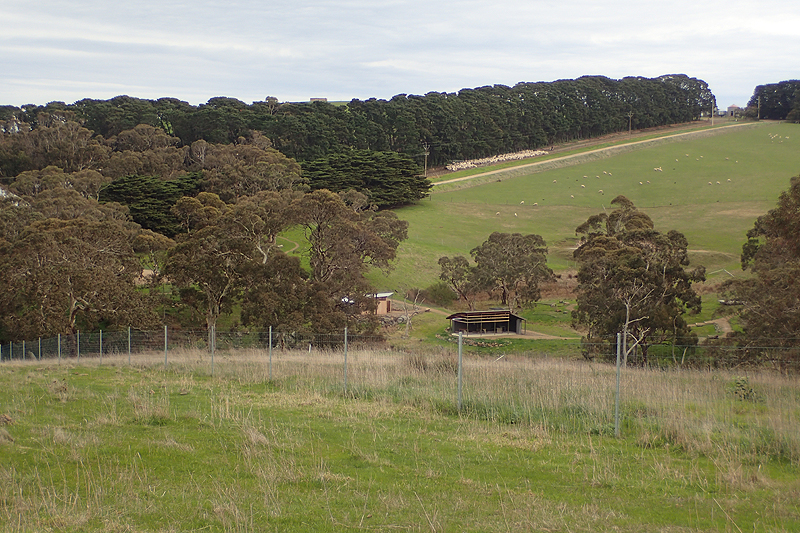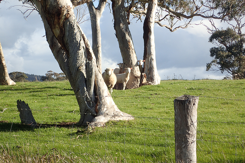 The highlight of the day was watching a school of dolphins just below us surfing the waves, hunting together and just playing at being dolphins. The experience will stay with us. Otherwise it rained quite a bit. A farmer (possibly the same one we had met going out of Inman Valley) had built an Inukshuk which a flock of dorper sheep had climbed all over. There was some beach walking today and we ended up walking back inland through farmland again, more ewes and lambs. We got to the stile to Creek camp site (spekky Heysen campsite number 2 for us) and climbed over it as it was properly marked as part of the Heysen. We could see the shelter on the other side of the creek. The creek was running quite strongly and it was tricky to get across it with our packs on. I ended up crossing it much higher up and got a wet foot. Only after this did we realise the this was yet another example where signage favours the northbound walkers as there was a proper entrance further along the road which brough you in around the shelter and meant you did not have to cross the creek. The tent sites here were on elevated wooden platforms overlooking the creek. We spent some time in the shelter, having a meal before moving on. We came across a perfect sheltered spot on the road, between sheltering bushes and a farmer's field to camp. The field was full of sheep which again entertained us all afternoon.