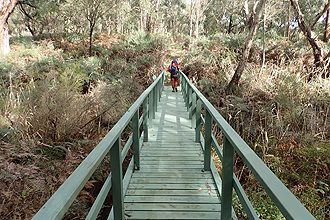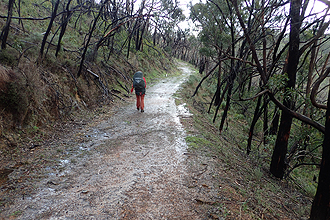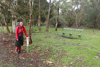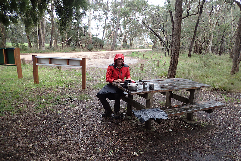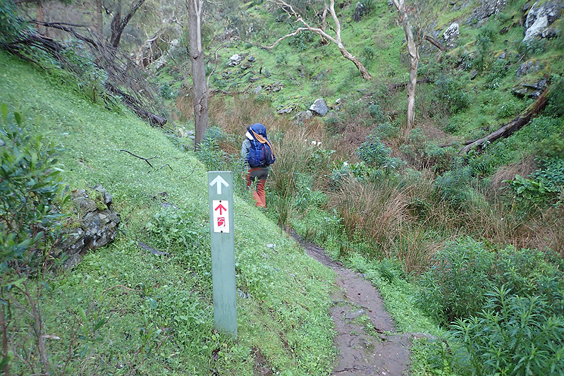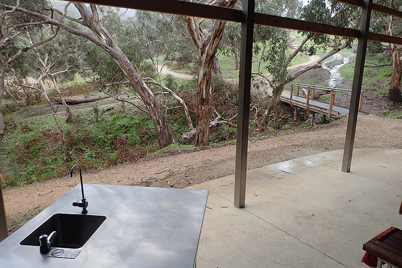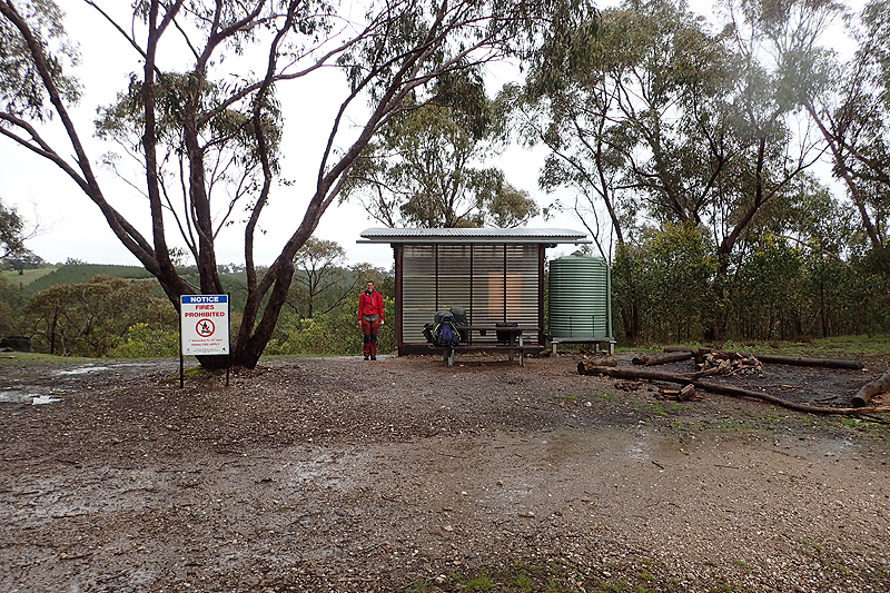 We always knew that we would have wet weather around Adelaide and so one wet day after another was not a surprise. It wasn't wet all day though and the rain wasn't heavy today. It was perfect yesterday having the shelter for a few hours. Today we were headed for Scotts Shelter. We met three walkers from Adelaide who had completed all stages from the south up to here. They had only good thngs to say about the upcoming walks into Adelaide but we were not so sure about it. After Scotts Shelter the Heysen specific sites "dry up" and hikers are left to solve their accommodation problems on their own until Rocky Creek walk-in site. There was some lovely walking along a trail through a conservation park. The pathways are often very slippery from moss and damp and we walk very carefully. We hit a wooden boardwalk without any chickenwire nailed to the surface to help prevent slipping as wood becomes very slimy in the wet. I should have been more wary of this but before I knew it I was sliding along it on my arse, and Mike who was just behind had no choice but to join me. When I stood up there was blood streaming from somewhere and I had cut my hand badly along the base of my left index finger just near the thumb. Some urgent first aid was required and I would end up having to really look after this cut for about 10 days. Such a tricky place to have a cut as I am left handed and we are always packing and unpacking and shoving things with a lot of force into hikng bags, etc. Scotts Shelter offered little in the way of level campspots so we backtracked a little to camp in the forest. It is nice to have the shelter to have breakfast and tea in while it rained, but again we wouldn't sleep in it.