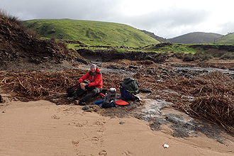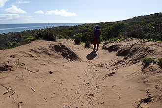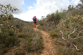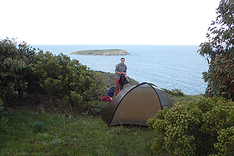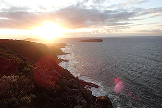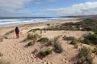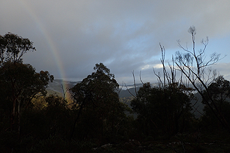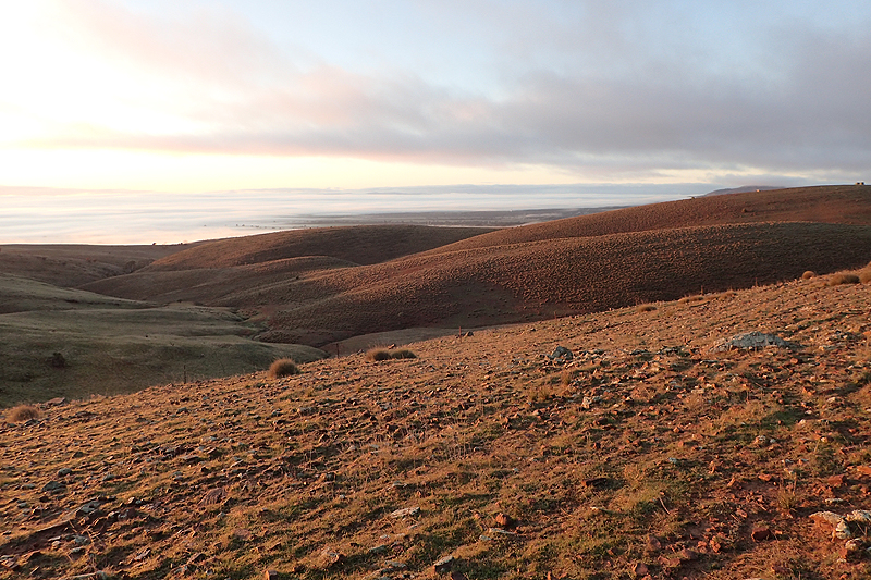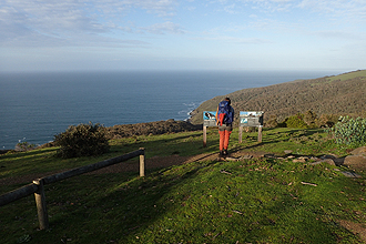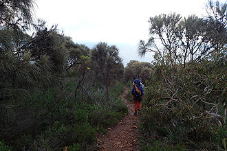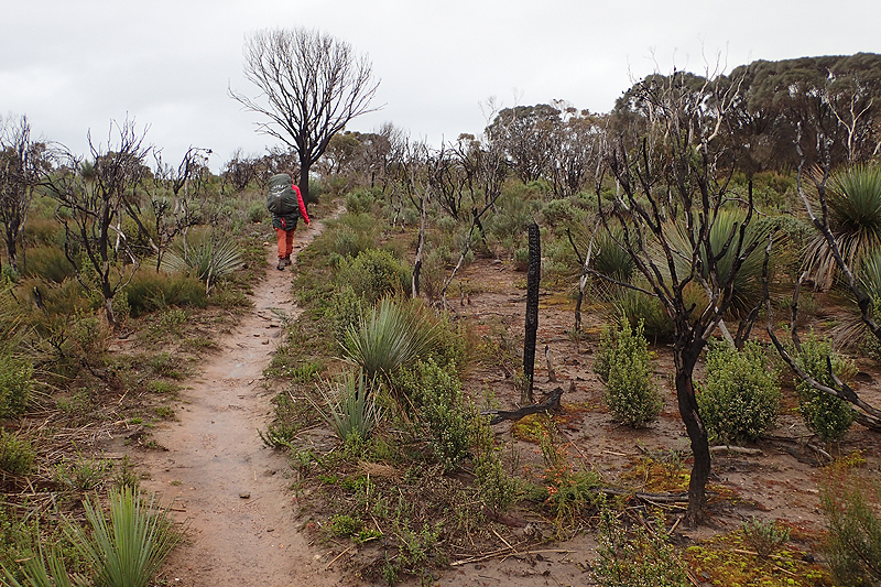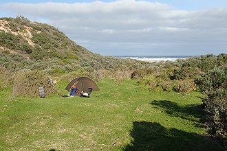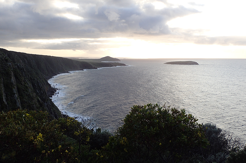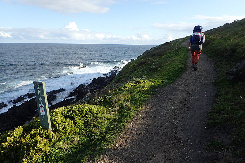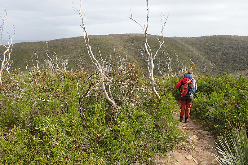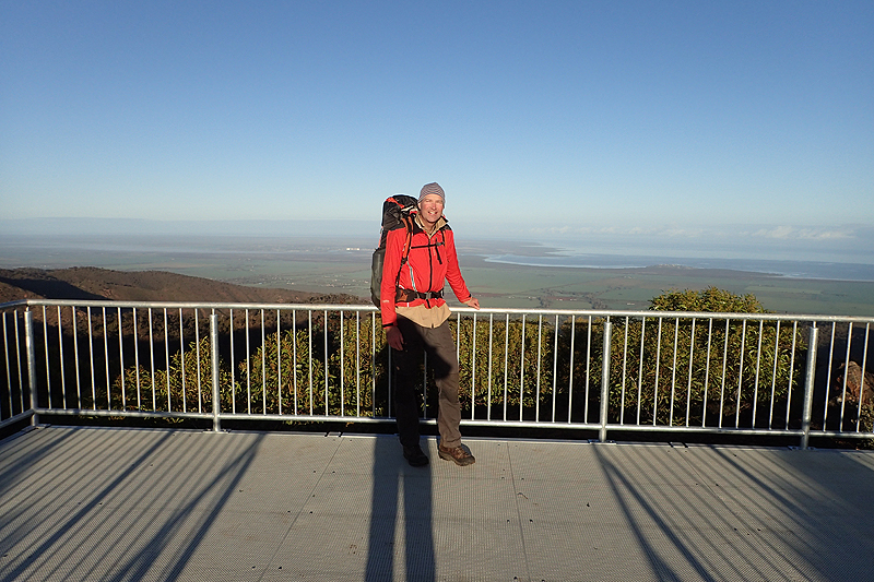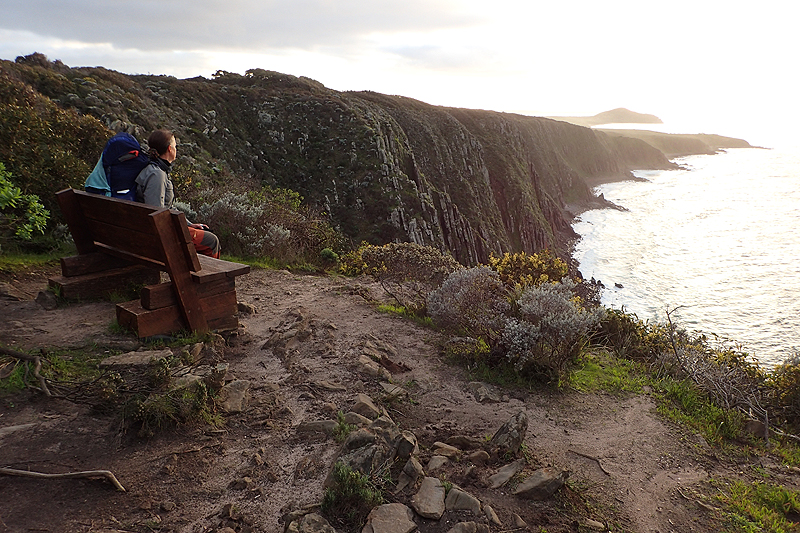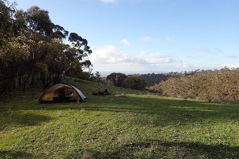 The dawn breaking was a sight to behold today. We had views stretching far inland. The sun rose through thick mist which had oozed across the flatlands below. The walk continued in its up-down fashion, perhaps not as excessively so as yesterday. We came across an unexpected MPP where we of course had lunch! We stopped again at Stony Creek walk-in site which is in a very pretty spot, birds abound. We then climbed up the hill to camp. It was a really cold night and we were pleased not to be in the valley below.