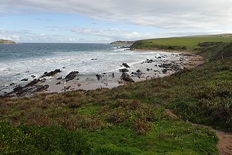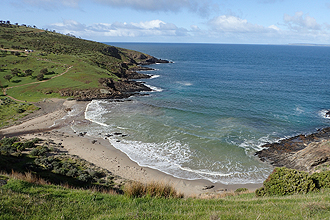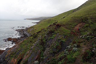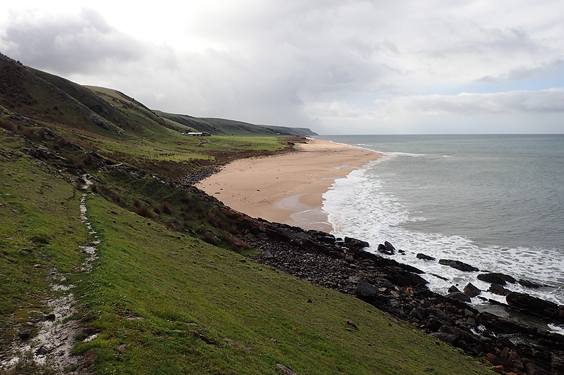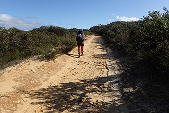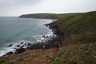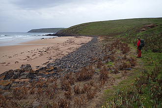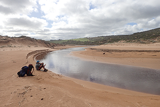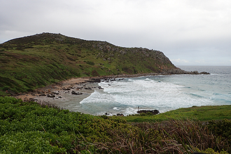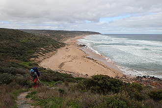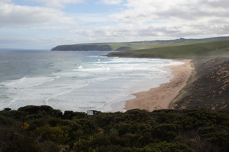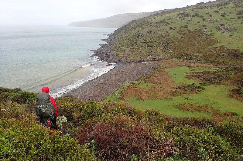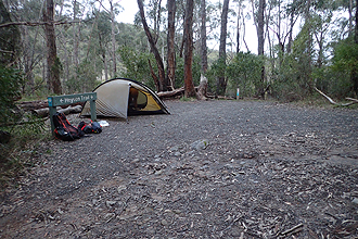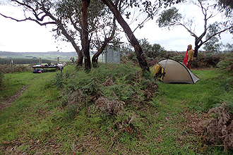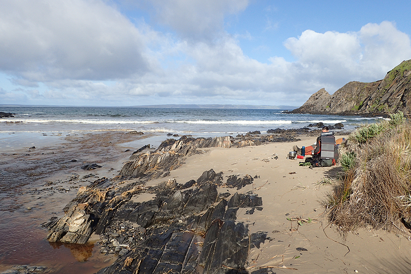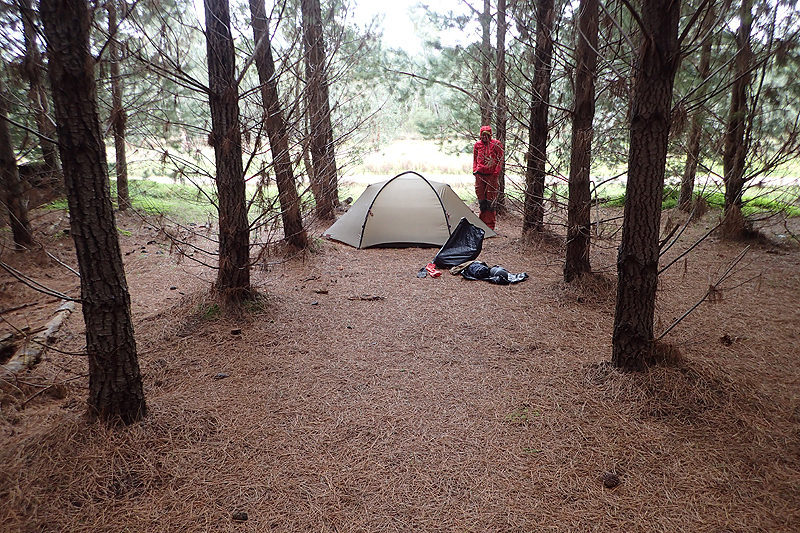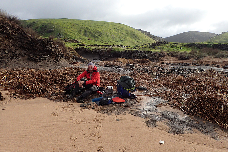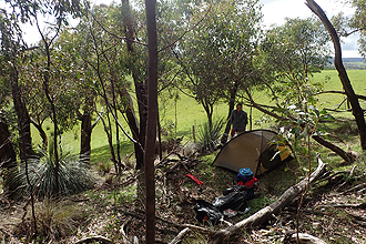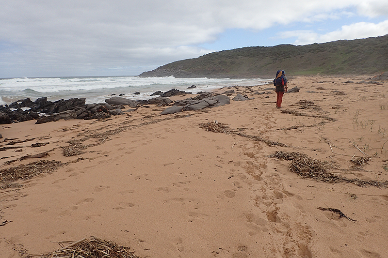 A rainy day that started with "Follow the Fence" down the infamous Tunkalilla Hill. This hill makes northbound hikers cry with their heavily laden packs. It makes southbound hikers cry because most will end up at some point on their backsides. It is too, too steep to be reasonable to walk up or down. Switchbacks are not in the vocab of the designers of the Heysen. You will never have seen anything like this hill for walking on. I say this with confidence. It is nearly impossible. But you will get to the bottom, or the top. The one thing you will find is that your knees will forever remember the downhill walking on the Heysen. The uphills are not nearly as hard on the body. Tunkalilla Beach walk is a long one but the rain eventually cleared up and as we looked down on Boat Harbour Beach we though it looked too beautiful to pass up the chance to camp there. It was pretty wet underfoot everywhere but we found an okay spot which seemed pretty not too wet. We then just relaxed, the sun came out, everything was dry, and then all of a sudden it was dry no longer. A shower of rain caught us unawares and we got drenched getting under the bothy! Had we pitched the tent this would not have happened, but when you are camping just along the trail it is not really the done thing to be super visible. So we paid dearly for that. Anyway, we pitched the tent then but after spending some time in it noticed that there was a pool of water developing in my vetibule and moved our campsite. A group of three girls came hiking down the hill a little earlier and must have got drenched also. We were under the bothy so we did not see them pass us. They had to cross what seemed a very deep creek flowing nearby which we would have to cross first thing in the morning. We decided that we would not bother with brekky tomorrow and would first deal with the creek crossing, climb up the hill to the bench we could see and then sort ourselves out.