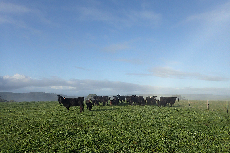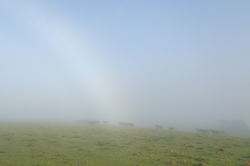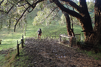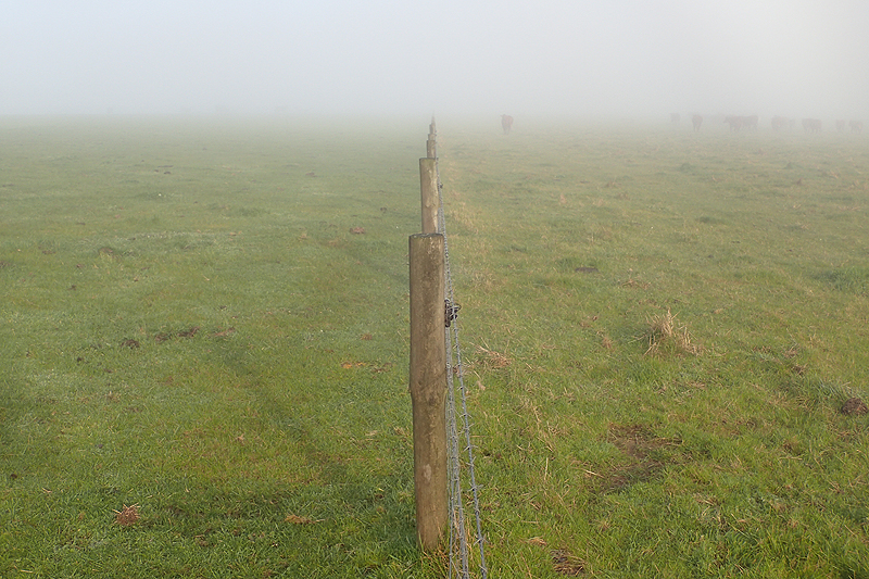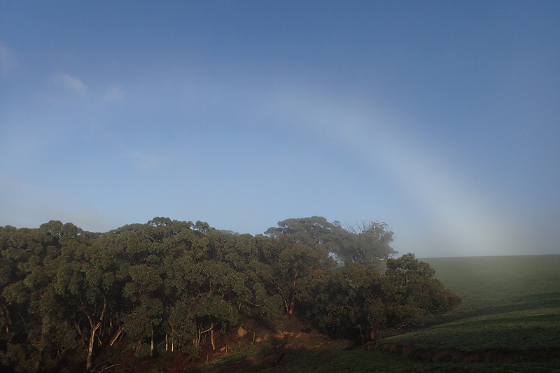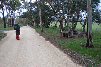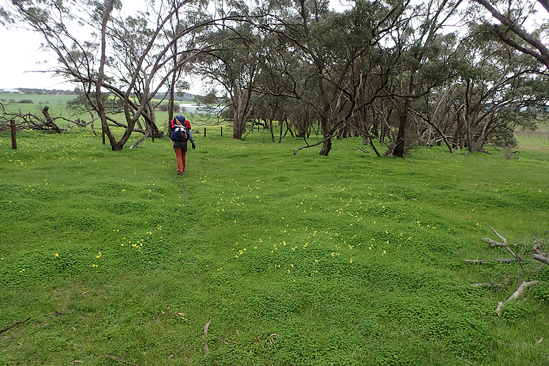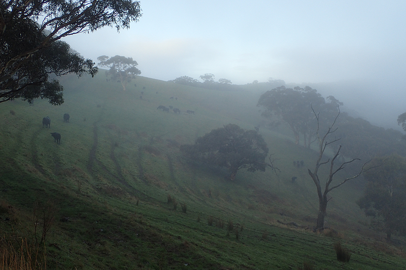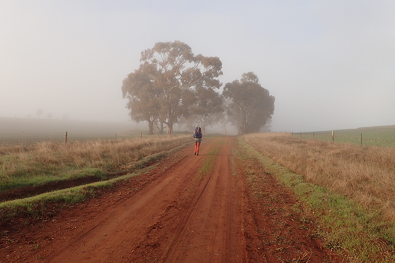 It was an amazing walk today through paddocks of cows, many calves about and also some vocal bulls. When walking directly through pastures the calves would often be very unsure. Happiness is dairy/beef farming as this indicates that crazy hilly landscapes are behind us. It was very misty and we walked surrounded by a white veil. For the first time we experienced a white rainbow shimmering in the mist; it was beautiful. Suddenly the mist cleared and the day was sparkling and crystal clear. It was also very muddy walking due to the rain and many of the farm tracks having been pulversied by the cattle walking from one pasture to another. At times this made for quite adventurous walking as we slipped and skated in the mud. It was fun! Stopping to camp at Yulte was an impulse really. It was early in the day but as we walked a long a fence on the perimeter of Yulte, bordering a pasture we saw a perfect camp spot in a cleared piece of bushland. Later while relaxing in the tent, a bloke came along who has walked the Heysen and is a self-appointed custodian of Yulte. He lives in Victor Harbour and comes here from time to time with his gardening tools to upkeep the path and ensure it is not overgrown which is very generous. It was nice chatting to him. Then the farmer also appeared on his side of the fence to cut down a tree for firewood, so it was an eventful day.