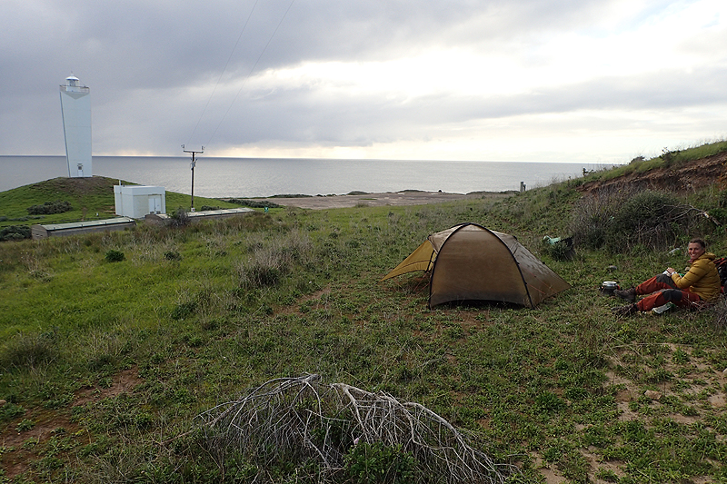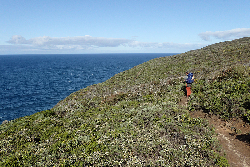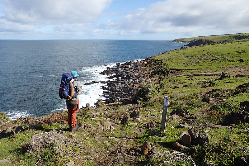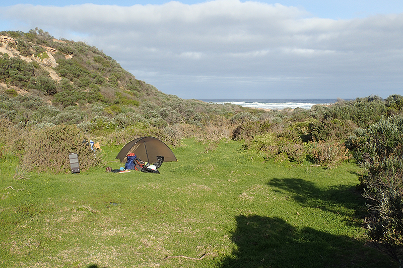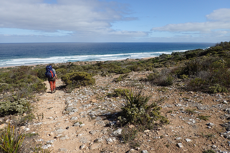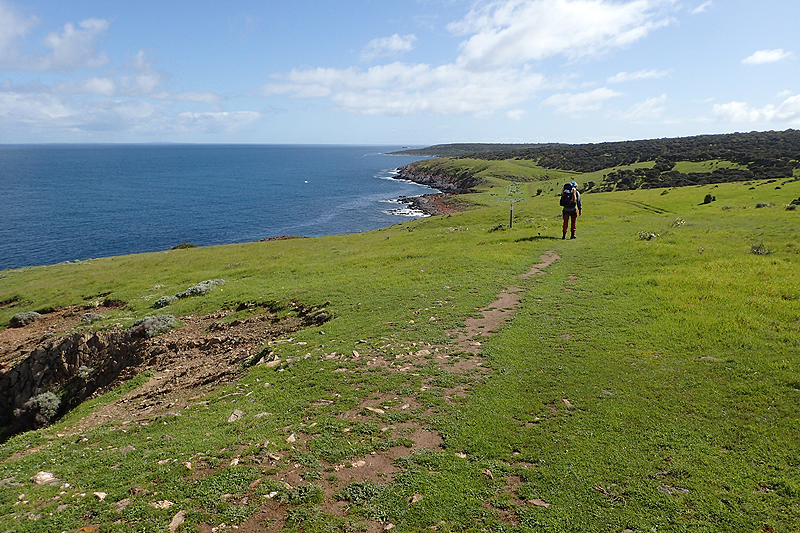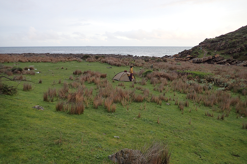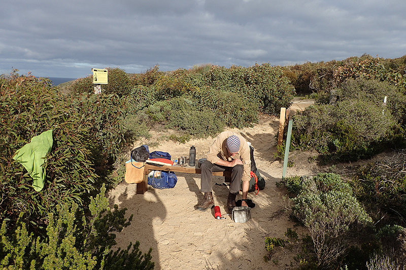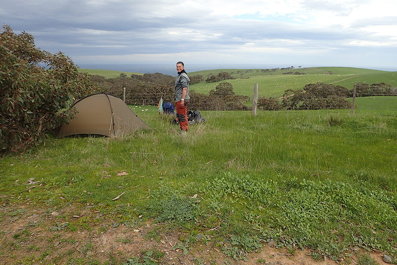 Beautiful walking today again. The weather is still cool. We just look at the ocean all the time. The walk is right along the cliff edge. We stopped at Sand Dunes site, the first of four brand new Heysen sites on this section of the trail. They require pre-booking and payment however we did not see any other campers at any of them. They have thoughtfully laid out tent sites and pretty paths of woodchip. Pretty impressive stuff. We instead pushed on a bit and camped just after Parson's Beach. Rain came in overnight.