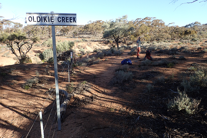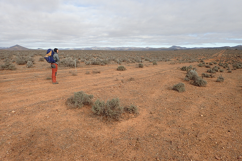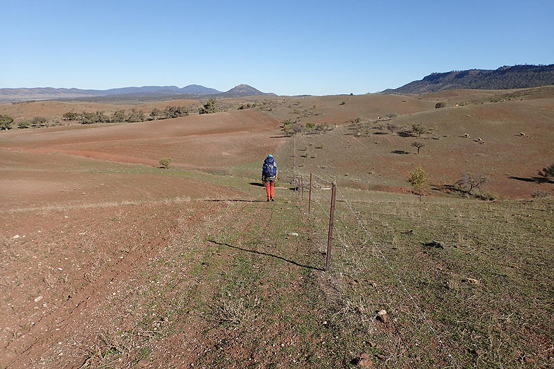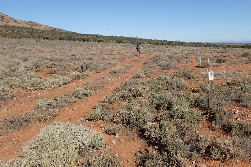 We met a solo hiker who had walked from Quorn and was going to Hawker. She was happy to have the wind at her back. We took shelter in a creekbed and it was glorious to be in the sun and out of the freezing cold wind. We were in love though with the beautiful desolation of the area. As you spend a long time near fences you start to create a mental catalogue of different styles. So much so that later in the walk we would comment, "Oh that's a new style!". Today being windy was the first time we heard the fence posts singing. A mournful melody, it took a while to figure out where it was coming from at first. We had a break at Calabrinda Creek walk-in site which was a massive area and had a toilet but no shelter other than the rain tank and no bench at all. A bit miserable really. We camped a few kilometres further on and quite near to where we had camped last year while cycling.