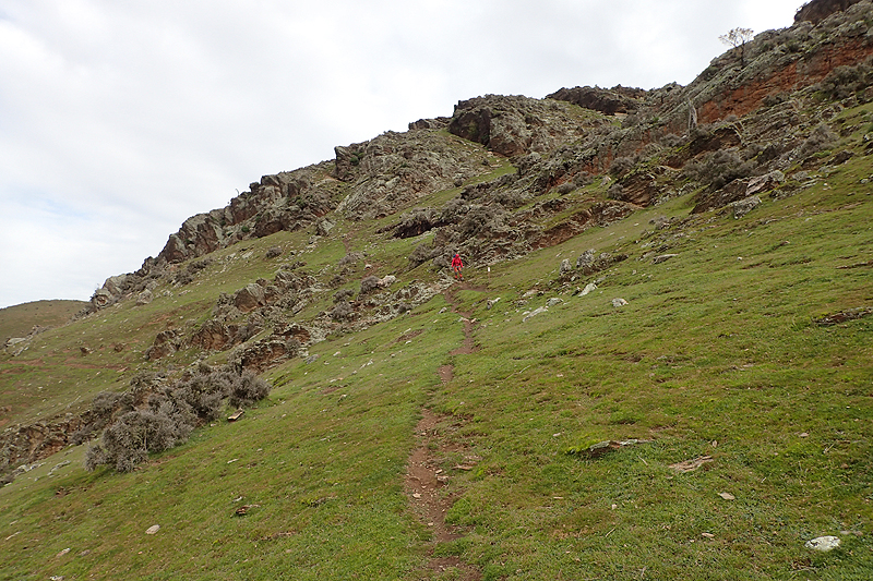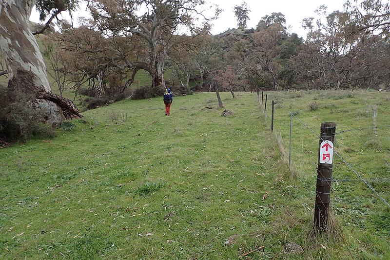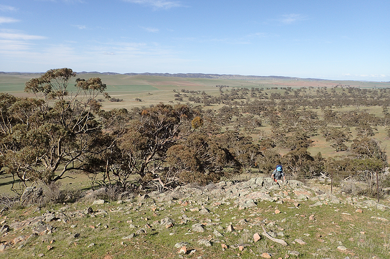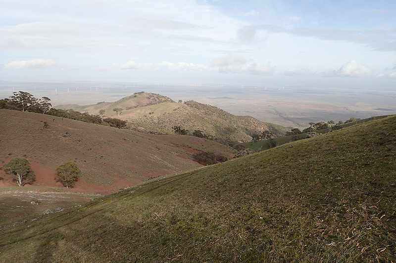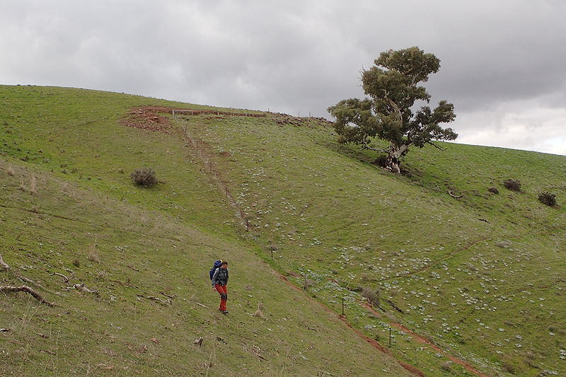 In my mind when planning the hike, I always imagined that the weather would be thrown at us in this section between Spalding and Burra and that was correct. On balance we were quite lucky. We mainly had high wind and this created freezing conditions. A bit of weather is okay though and we didn't mind. We are usually grateful that we aren't cycling into it! Somehow walking is doable no matter the weather, a wind which would be impossible on a bicycle is managable when walking. So it was with the climb up and over Mount Bryan. It was really, really windy. I think the forecast was for gusts to 70 km an hour. We had tea and a second breakfast on top, sheltering behind one of the small sheds up there, and then the quick walk down with the wind behind. The views were outstanding from the top. We have been delighted with how green it is all around, especially when compared with the way it looked here last year. From Mount Bryan you can look far to the east, over the Goyder Line again and you can see the Outback beckoning so close by. Green up to a point and then it just merges into treeless plains of burnt ochre. It is interesting that the council here is called Goyder! After descendidng there was road walking past Mount Bryan East School (a Heysen site) where we stopped for lunch and to rest a little. We then continued towards Touralie Gorge to camp in the Caroona Creek Convservation Park which was beautiful. We collected a few rogue sheep on the way which took off like a shot into the reserve never to be seen again. Unlike the sheep we have been seeing lately on farms around Spalding and Hallett, these crazy Goyder Line sheep are not even shorn. They seem left to their own devices.