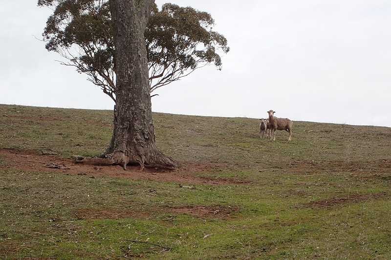 This area around Bundaleer State Forest and Reservoir to Spalding felt like a milestone as last year on the Mawson we made the decision not to go as far as Burra but travelled north from here. That cycle tour took us along the Oodnadatta Track and through Uluru home along the Great Central Road so we had much bigger fish to fry. It was good to be back here and almost impossible to recognise the place. We visited in April last year when it was every shade of brown and there was not a sheep to be seen. Now it was so green and it was a busy time for lambing. Before reaching the reservoir we walked through a beautiful little valley surrounded by grass trees. Clumps of ewes with their lambs hurried away from us as we walked along. Ineveitably a lamb will get seperated from it's mother in the process. When around sheep at this time of year they are constantly vocal, always checking on the babies, so Mum calls out and baby responds, constantly. They all do it. This little one eventually was shrieking for it's mother and trying to latch on to other ewes's nearby who gave it the cold shoulder. My goodness, it was plaintiff. Eventually we crossed into another pasture and left them behind, could still hear it bleating pathetically for ages. No doubt it ended up a statistic.