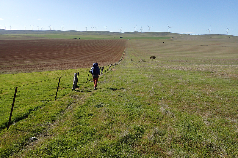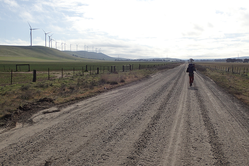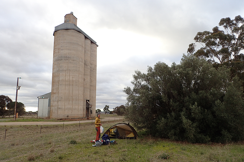 The turbines of the windfarms were spinning away as we descended from the ridge. We were to pass by another windfarm on the other side of the valley. It was all road walking today to Hallett with the last bit being into a headwind which was pretty slow. My Nemo mattress had begun failing in multiple places as predicted. It did not puncture again but the seals where the fabric grips together making baffles pull away and air leaks out there. We ordered a replacement Thermarest online during a tea break. We made our way directly to Hallett Heysen site which is the old railway station so it is a very quaint and interesting place on the outskirts of the village. We had no real need to go to the general store or pub and relaxed inside. We pitched our tent between a large screening olive tree and the disused silo. It was windy but otherwise quiet.