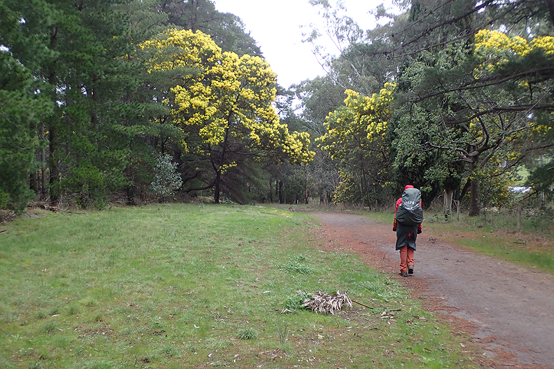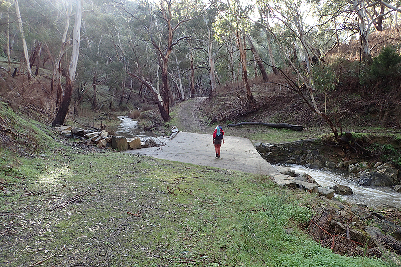 Big event today was Cudlee Creek which feels like you read about it a lot. The walking was pretty tough with some strange road walking along the shoulders of bitumen roads which felt like lazy trail planning and unsafe, particularly arriving in Cudlee Creek itself. You come into the settlement along a bush path and that leads you to think you will have a pedestrian bridge over the creek, but in fact the trail takes you onto to the bitumen road and has you cross the creek on the road bridge which is on a blind bend and has no - ZERO - shoulder. We are cycle tourists and used to being squeezed to the edges of things, but even we felt very unsafe in this situation. You have to walk a few 100 metres and the speed limit might be 60 km and hour or more. If two vehicles came in opposite directions at once it could be dangerous. If a car came along towing a caravan in might be deadly. It is a very, very poor show by the "designer" of the trail. I use that term loosely. Anyway, we survived and the walk wound very prettily along the creek where we started to see the glorious blooms of cold weather plants that the Adelaide Hills are known for. We had our meal at Grandad's Camp and made our way to Kangaroo Creek where we would camp. We met a nortbound thruhiker from Queensland who complained about the cold weather and the amount of time the trail spent in farmlands. We were able to tell her that she would probably be able to fit into the tiny cubby house at Grandad's Camp and get out of the rain, however we sort of fell silent about the paddocks. If she didn't like them by now, she was in for a rude awakening. We enjoyed our campsite at Kangaroo Creek. We cannot believe the amount of water around, it is just running everywhere!