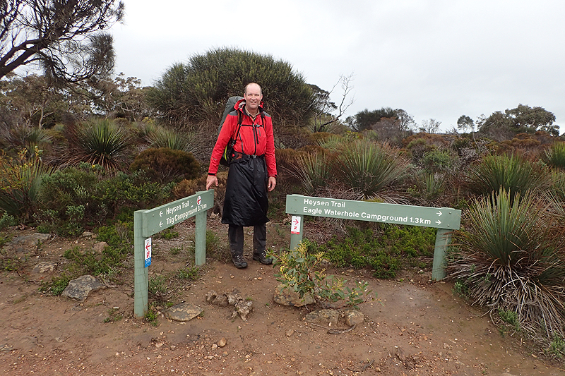 As we did not need breakfast, we were packed very early and set off for the creek crossing in the dark with headtorches. I could see the headline now, "2 Experienced hikers attempted to cross a strongly flowing creek at Boat Harbour Beach in the dark using head torches and got washed out to sea". The thing was, we had no idea how deep it was, but the three girls were not tall and had not drowned so we thought we would be okay! I wore my water shoes which have velcro straps so they grip my feet well, Mike's camp shoes are slip ons and he did not like his chances with them so did not bother with shoes. We could not see anything in this water and it was about 1 m deep but we just picked the shortest gap to cross and were happy when it was over! Who knew that water crossings would be as much a feature of this hike as they are on the Bibbulmen, even more nerve-wracking actually! Luckily it was a clear day and having breakfast at the bench on top of the hill was amazing; beautiful views! We had Cliffs Heysen site as a morning tea break and walked on to Eagle Waterhole. In between we had the Deep Creek (of which Deep Creek Conservation Park is named) to navigate. Well, actually we did not think this was be a "thing" as the point of interest is the waterfall and we thought we would just trot along by. The conservation park is lovely, the trail winding through it is very picturesque. Given all the rain and our experience of the earlier creek we thought the waterfall might be huge, what we did not expect was that the trail would have flooded and we would be left to navigate a creek filled with fast flowing water just downstream of a huge waterfall, and filled in with half washed away trees and shrubs. These turned out to be a blessing as we could use the piled up vegetation to assist us in crossing the water. It was actually crazy. We wondered at what point this section of the trail would be closed? You could see that the water level had been much higher recently. Anyway, we survived with a few minor cuts. It was suprising given how much information is usually given about these things and safety aspects on trails. The only information boards since Victor Harbour practically had been about the plover. We climbed out of Deep Creek and were happy it was over! We enjoyed the walk up to Eagle Waterhole. The rain started again and we were pleased to camp there.