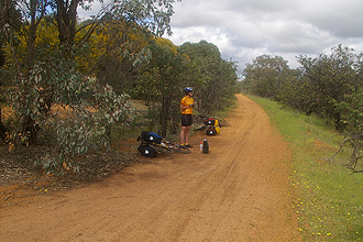 The gradients and track surface is generally good all the way to Clackline (where the rail formation ends), which is then followed by approximately 7km of cycling along a surfaced, but quiet, road. Getting back off-road, the track seems to deteriorate, particularly after the West Northam Tanks. The single track down into Northam may be fun without the overnight gear and a manageable bike, but after 70km with a load, the deeply rutted and twisty track seems to push one to the edge (and you definitely wouldn't want to go up the hill with a loaded bike). It's a pity, because it puts a bit of a dampener on the overall touring route.