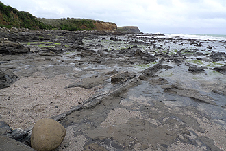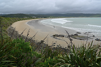 The road into Curio Bay is unsealed for about 20 km and in good condition - one long and quite treacherous descent (steep-ish), just when I thought that we would never arrive - suddenly the road levels out and you are there ! Curio Bay! Cute campsite - a little store. Pay for the showers which are hot and that's all that counts! The campsite are little clearings surrounded by bush as without these windbreaks the place would blow away. There are signs everywhere warning of sea lions that sleep in the bush around the tents...There was a lovely undercover picnic table that we dashed to in a break in the weather and ate our lunch. We took a walk to the petrified forest on the beach which is the area's claim to fame and tried not to look at the penguins which are shy and don't like attention...or something. There weren't any anyway. The rain lashed the tent all night. I thought we might have to paddle out. This would be the furthest south that we have ever been in the world!