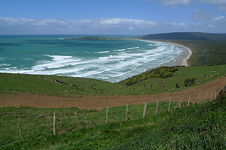 Well - it was a great choice to camp at Amble on Inn because we were on the right side of Invercargill for leaving. We jumped on our bikes and hit the road. And yes - we had the westerly right where we wanted it! There were times when we could free wheel at 30 km per hour! Cold on the bike though. The road to Curio Bay was quite undulating and the closer one got to the coast, the more exposed it became. Between towns there is not much - just rolling green hills. As the road tended more southerly the cross winds became severe - wanting to push your wheels out from under you. Your exposed facial skin just froze off! The tan's we had looked hilarious - just a centimetre between the cuff of your jacket and the start of your gloves on your lower arms and then the area below your sunglasses on your face, but not quite as low as your chin which you tried to keep tucked in as much as possible! The rolling hills had many sharp descents which felt a little hazardous with the crosswinds. Can grass be this thick and green? No wonder the sheep look so happy!