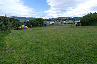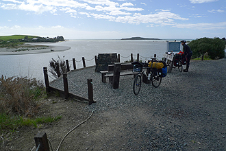 The Catlins Forest Park is very beautiful to cycle through - green and leafy. We stopped for a geocache at some old mine works and kept going. It was still cold - but no rain! The roads were very quiet. The climb up Florence Hill was quite tough but the views from the top made it all worthwhile. Papatowai is at the bottom of a long descent and then there is the climb up the other side which thankfully was sealed, although we had expected otherwise. Just before the final decent to Owaka - we stopped for a geocache behind an old wagon wheel. You would not believe the wind up there! Hopping on the bike to descend the hill, I could barely steady my bike. The road just dropped away and then followed the lake edge down to Owaka. We stopped at the info site/library to find out about camping - behind the pub. What a gorgeous spot! We went to buy supplies at the local 4 Square and did a geocache in town. It was a cute place - cold! The campsite of our dreams. It appeared to be the back garden of the pub - but also some old man's house who waved at us out the window. I wouldn't go out either if I were him!