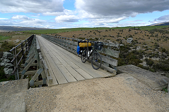 Can you believe it - a road train? Came thundering around the bend - we pulled off the road in time - huge dust cloud! After that we were more mindful of what might lie around the corner. Not much other traffic - perhaps a farmers truck here and there - and all very careful when passing. At the 20 km mark we passed a road sign which just had an exclamation mark - some kind of warning...a ford! We stopped for a snack as we had to dismount, take off shoes and socks and Mike took both bikes over one at a time - the water was deep and FREEZING! We were now in cattle country - large herds of cows - began to dot the landscape. At the 27 km mark a STEEP uphill for only about 2.5 km. Two guys past me in a four wheel drive and offered me a lift - Mike was up ahead - I said I'd never live it down! Thereafter a long and perfectly graded descent! At one point with the wind at our backs we were able to freewheel at over 30 km an hour for ages...