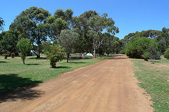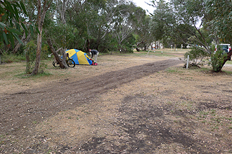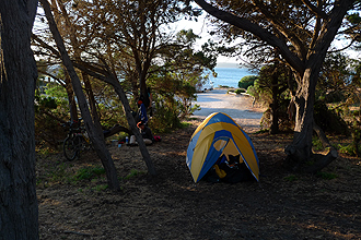 The day passed uneventfully - we stopped for a rest at Parndana - the last supply post on the day - but we had enough food for quite a few days. We hit the gravel road section towards Cape Borda Lighthouse after about 66km. The gravel road started off very well and was wide all the way, but any twists and turns in these roads cause the gravel to bank up and form corrugations and slip hazards. Also, as you have to slow your pace the flies descended into eyeballs, etc. I stopped to put on a fly net. We arrived at Harvey's Return Campsite which is a few km's short of the lighthouse at Cape Borda around lunchtime and it was a beautiful spot - it has to go down as one of the most beautiful bush campsites ever. We had been worried about availability of drinking water at these bush camps, but there were no problems. This one had a huge rainwater tank and two pit toilets - the whole place a clean, fresh feel to it. There had been recent rain. Amazingly the campsite was just off the main gravel road and there were clearly designated camp spots. The only other campers were some elderly people who had set up brilliant comfy camps and spent their days doing day trips. In total we cycled about 98km that day but all in all it was a breeze.