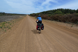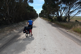 We woke the next day to an AWESOME tailwind. We reached the turnoff from the Playford Highway to Scott's Cove - looked down the stretch of corrugated gravel- looked at each other, felt the tailwind and said- "Let's go for it! 100-odd km's to Harvey's Return (Cape Borda) takes us to the western end of the island in one go!" There would be a 30km stretch of unsealed road to Harvey's Return into the national park at the end of the day.